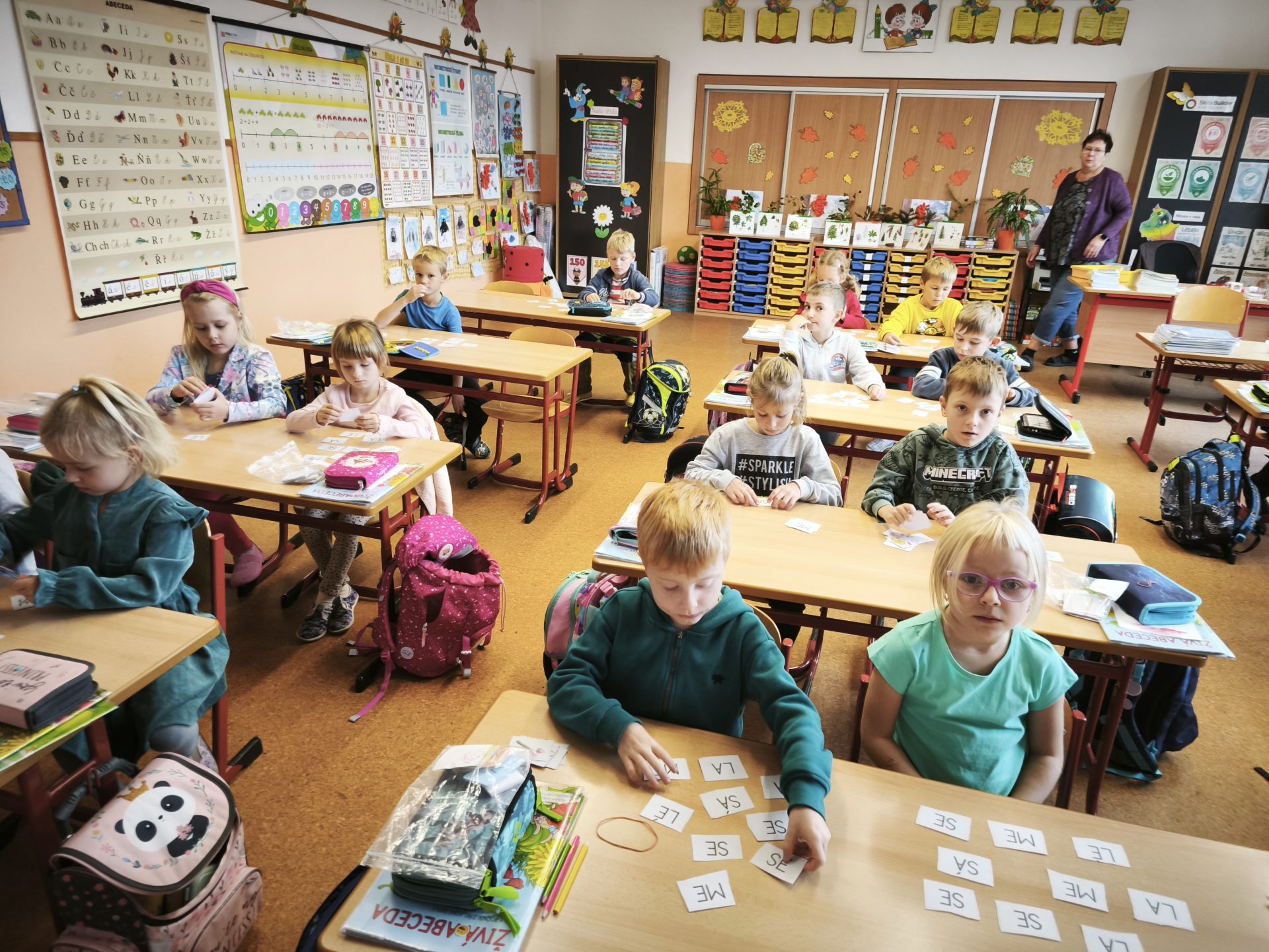 I učivo z českého jazyka si procvičujeme a upevňujeme hrou – kolotoč na int. tabuli (čtení slabik a slov), práce se skládací abecedou, kartičky se slabikami a obrázky.