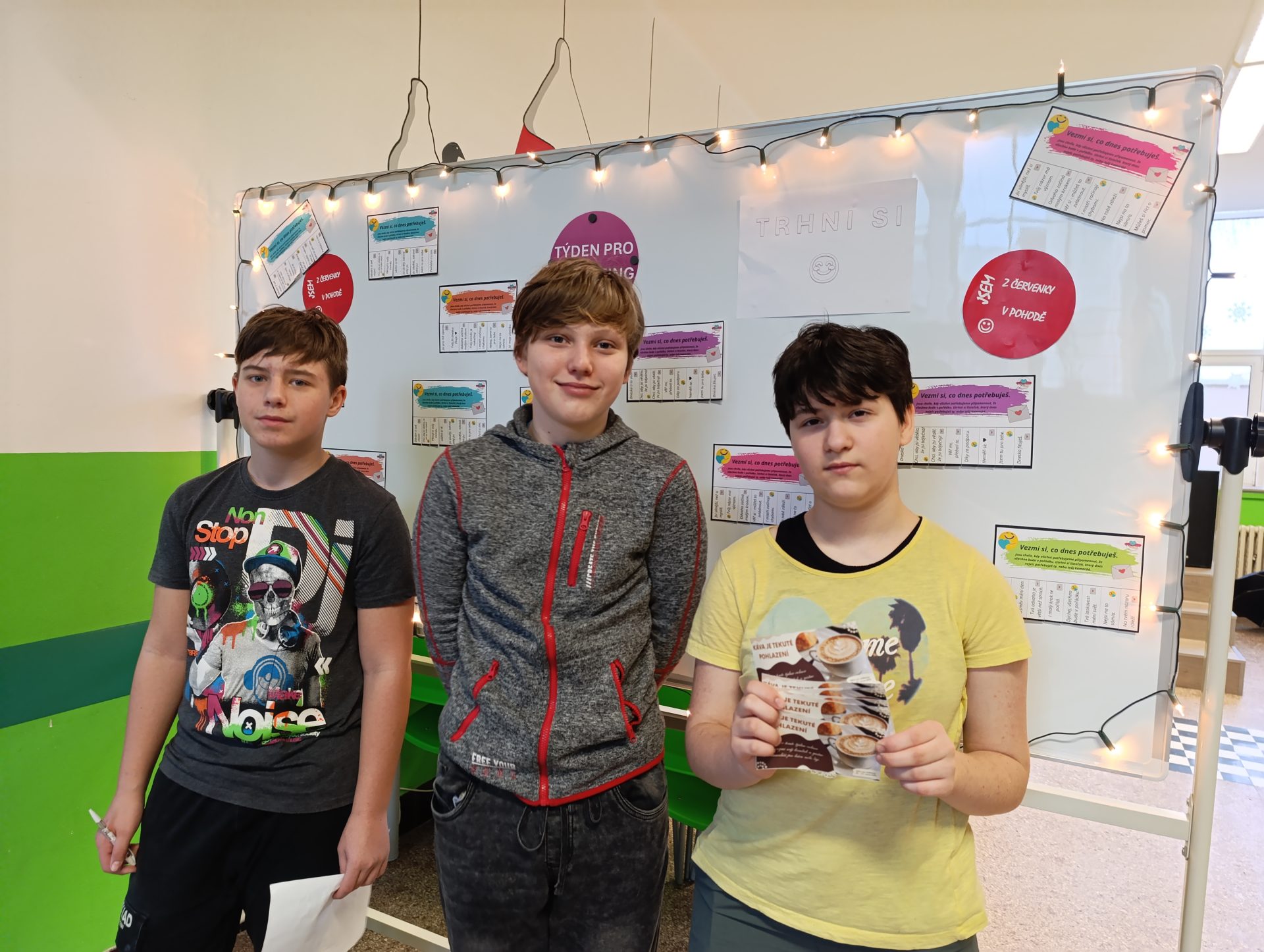Týden pro wellbeing jsme na škole zahájili aktivitou s motivačními kartičkami. Žáci si mohli vybrat kartičku, která je oslovila, a využít ji buď jako povzbuzení pro své spolužáky, nebo jako malou dávku vlastní motivace. Kartičky přinesly do školních chodeb příjemnou atmosféru vzájemné podpory a připomněly nám, jak důležitá je laskavost, spolupráce a pozitivní myšlení.