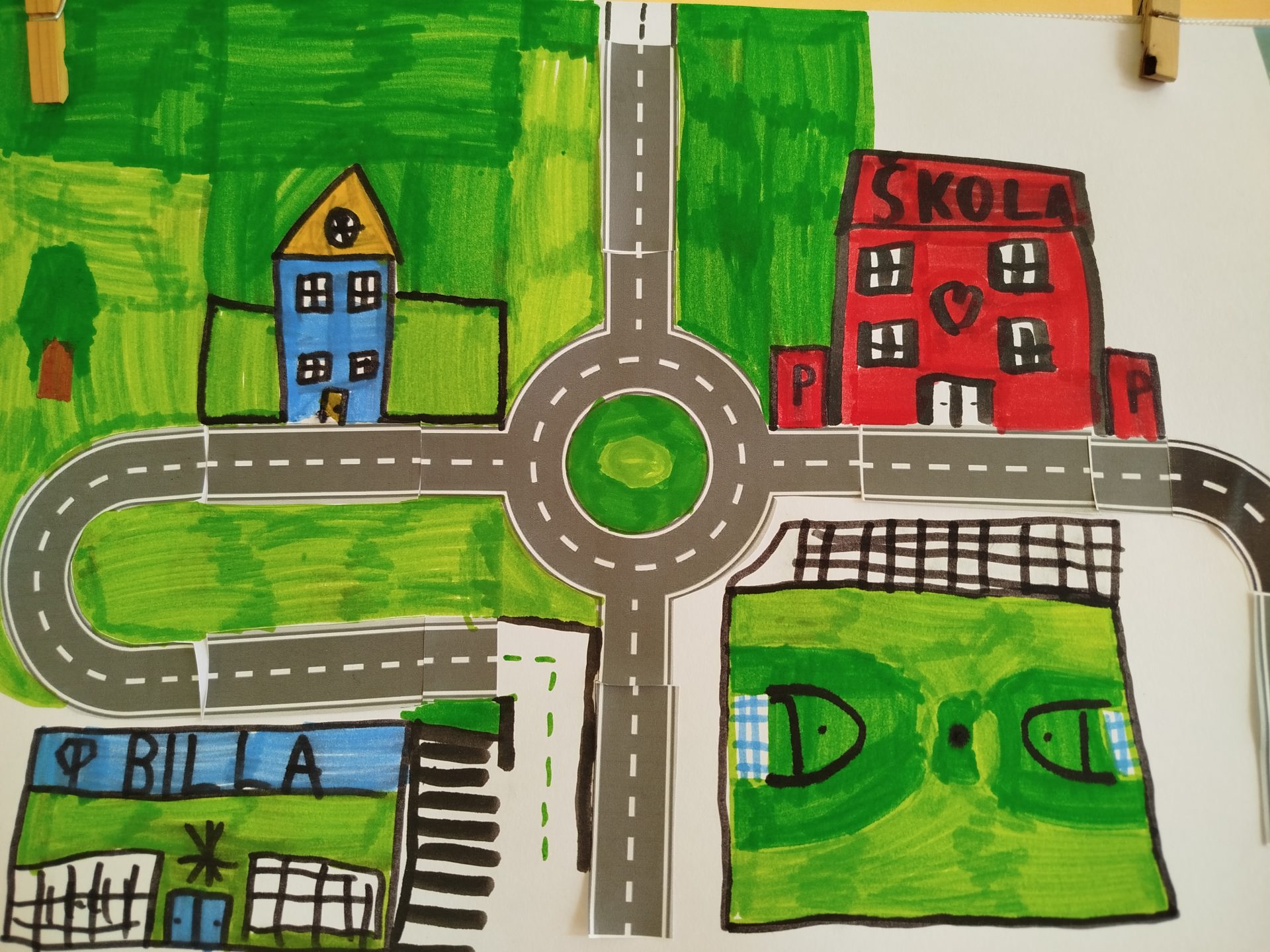 V předmětu Člověk a jeho svět jsme dokončili téma „Cesta do školy“. Děti pracovaly na přibližném plánu cesty z domova k budově školy. S nadšením stříhaly, lepily silnice, dokreslovaly obchody a domy.