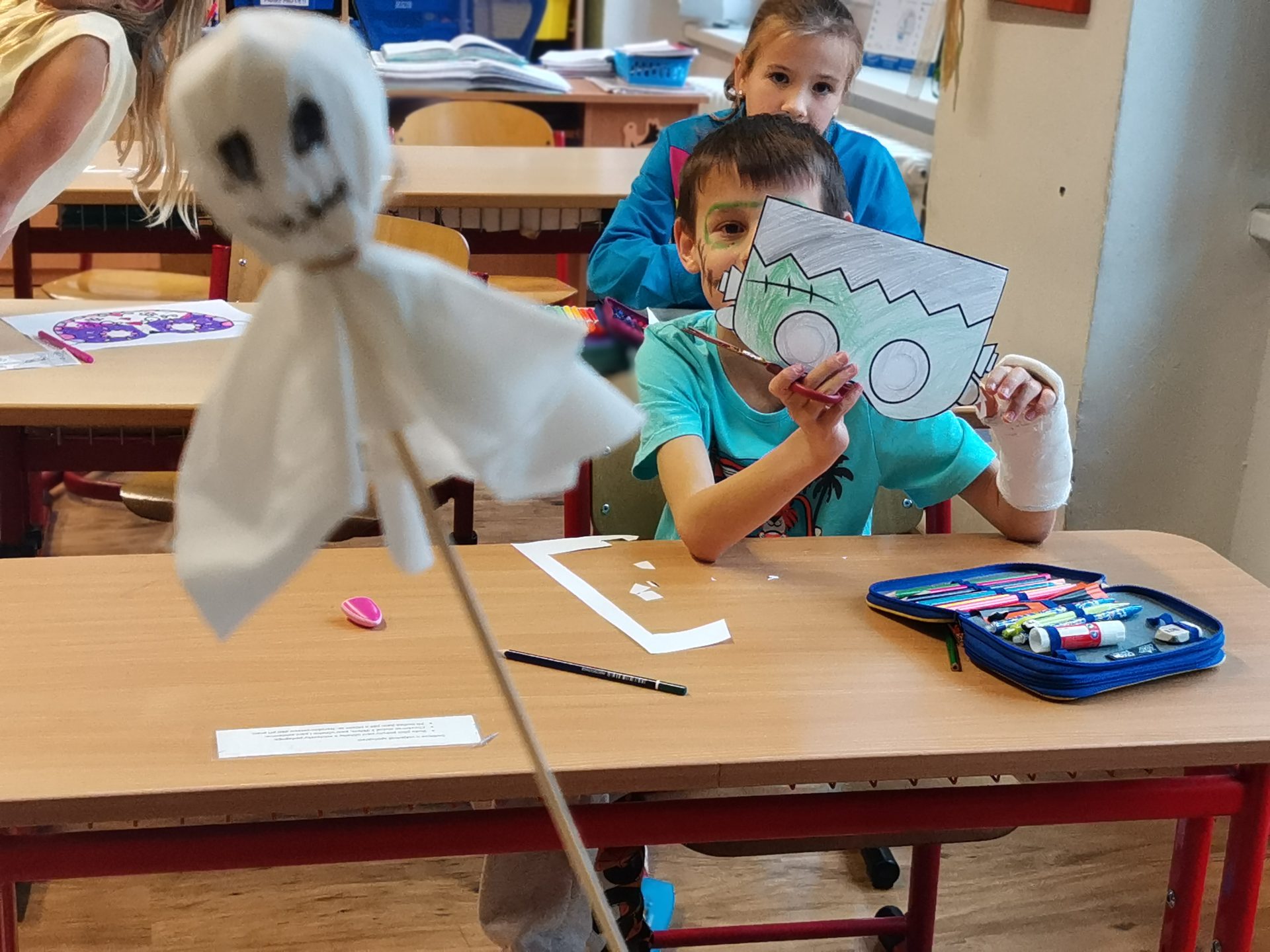 Vyrábíme halloweenské duchy, masky na obličej a tancujeme na píseň kostlivců. Dnešní atmosféra je u nás velmi tajemná.