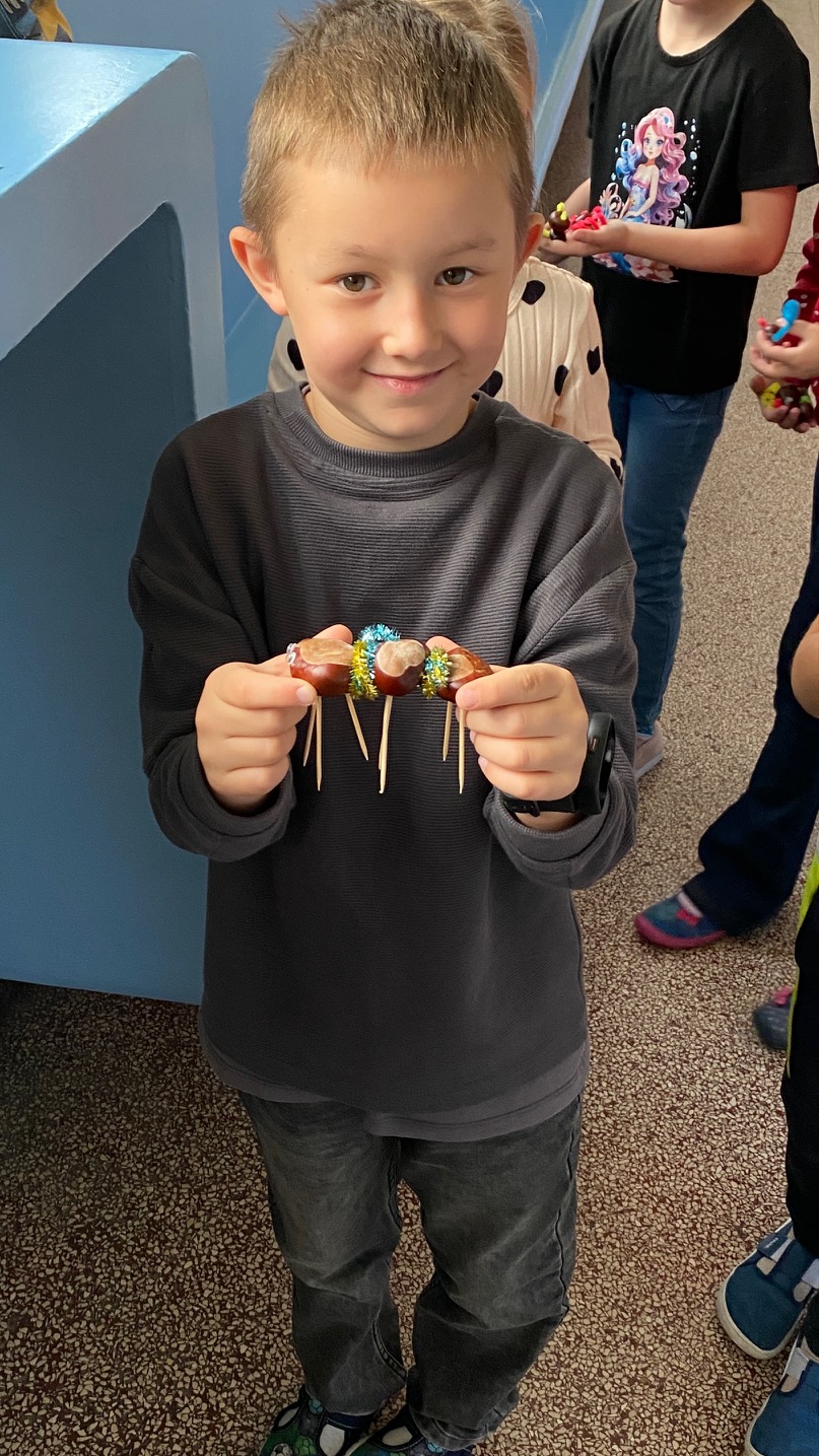 Podzim vystřídal léto a nastal čas podzimních témat. Co vše se vejde do jednoho dopoledne 2.C? V prvouce jsme se naučili o jehličnatých a listnatých stromech, přiřazovali jsme názvy a hádali jejich plody. Plody jírovce jsou kaštany, kterých jsme měli tento den ve škole spoustu. V matematice jsme s nimi počítali, v pracovních činnostech jsme z nich poté tvořili postavičky. Ve skupinkách jsme v rámci českého jazyka sestavili postup výroby draka a téměř podle tohoto návodu jsme si ho ve výtvarné výchově i vyrobili. A jak se nám to vše dařilo můžete vidět na našich fotkách 🙂