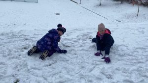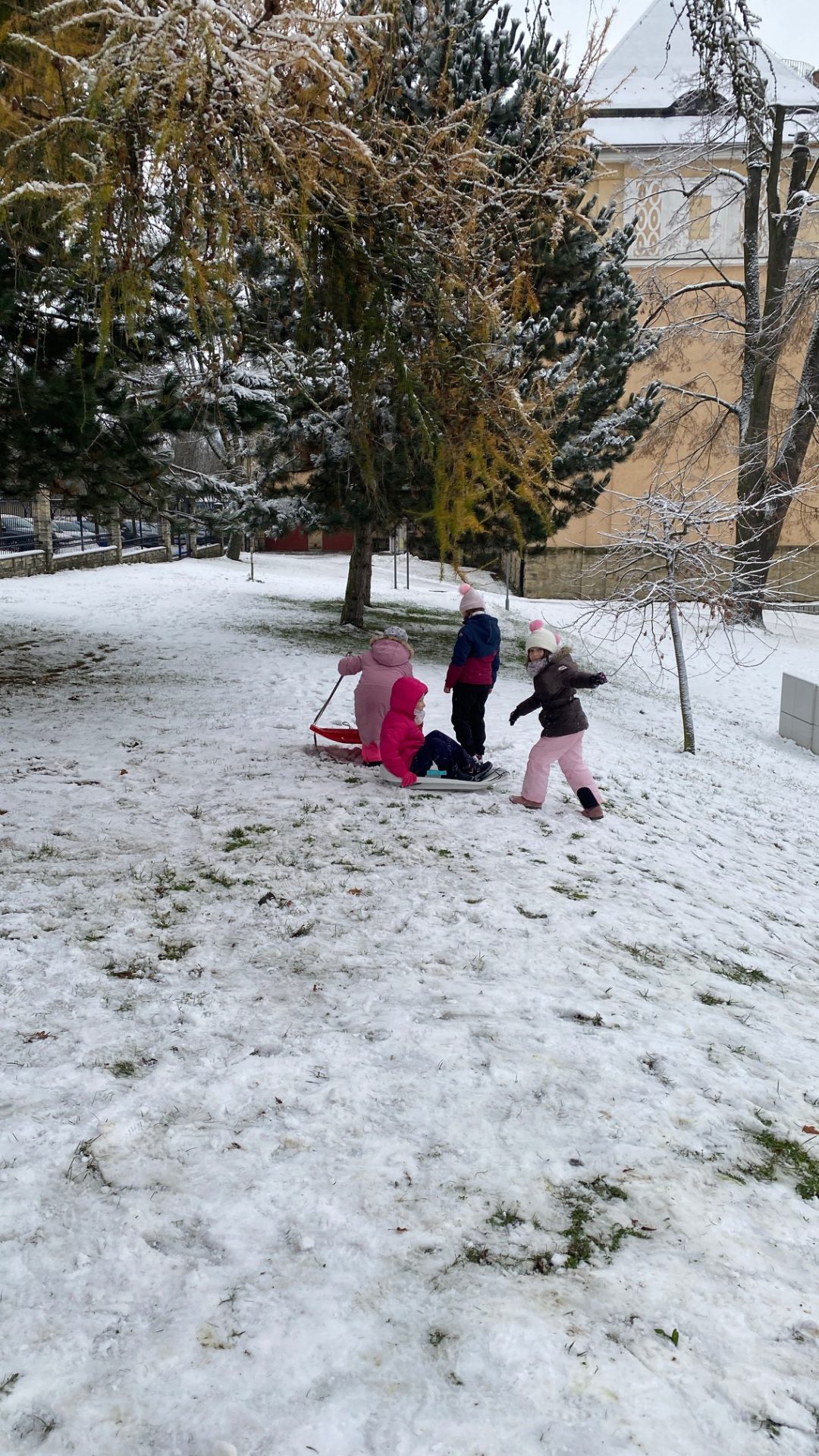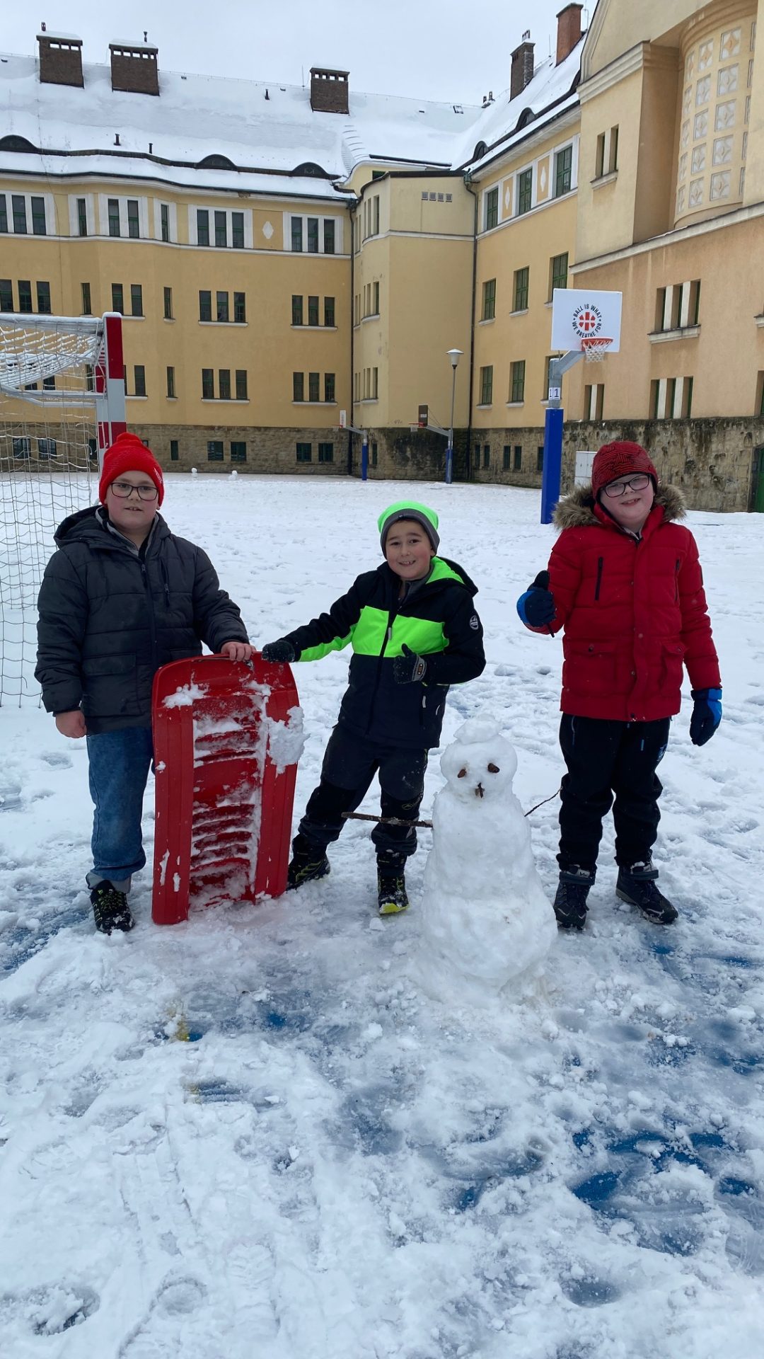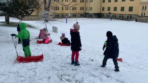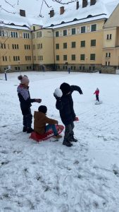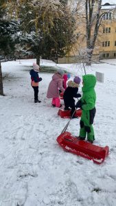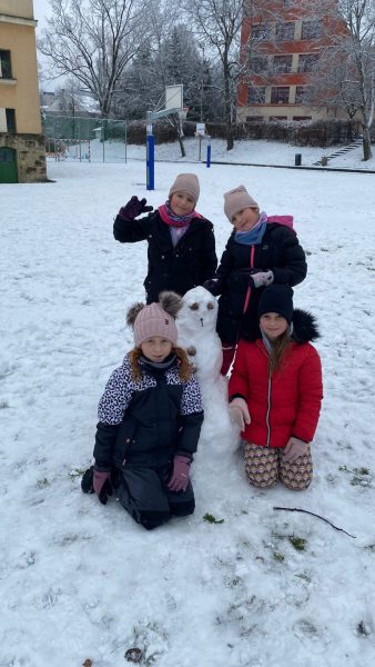 Koncem listopadu jsme měli velké štěstí na sněhovou nadílku, a tak jsme ji jedno dopoledne využili v rámci tělesné výchovy k bobování. Některé skupinky stihli také postavit sněhuláka, bylo to parádní.