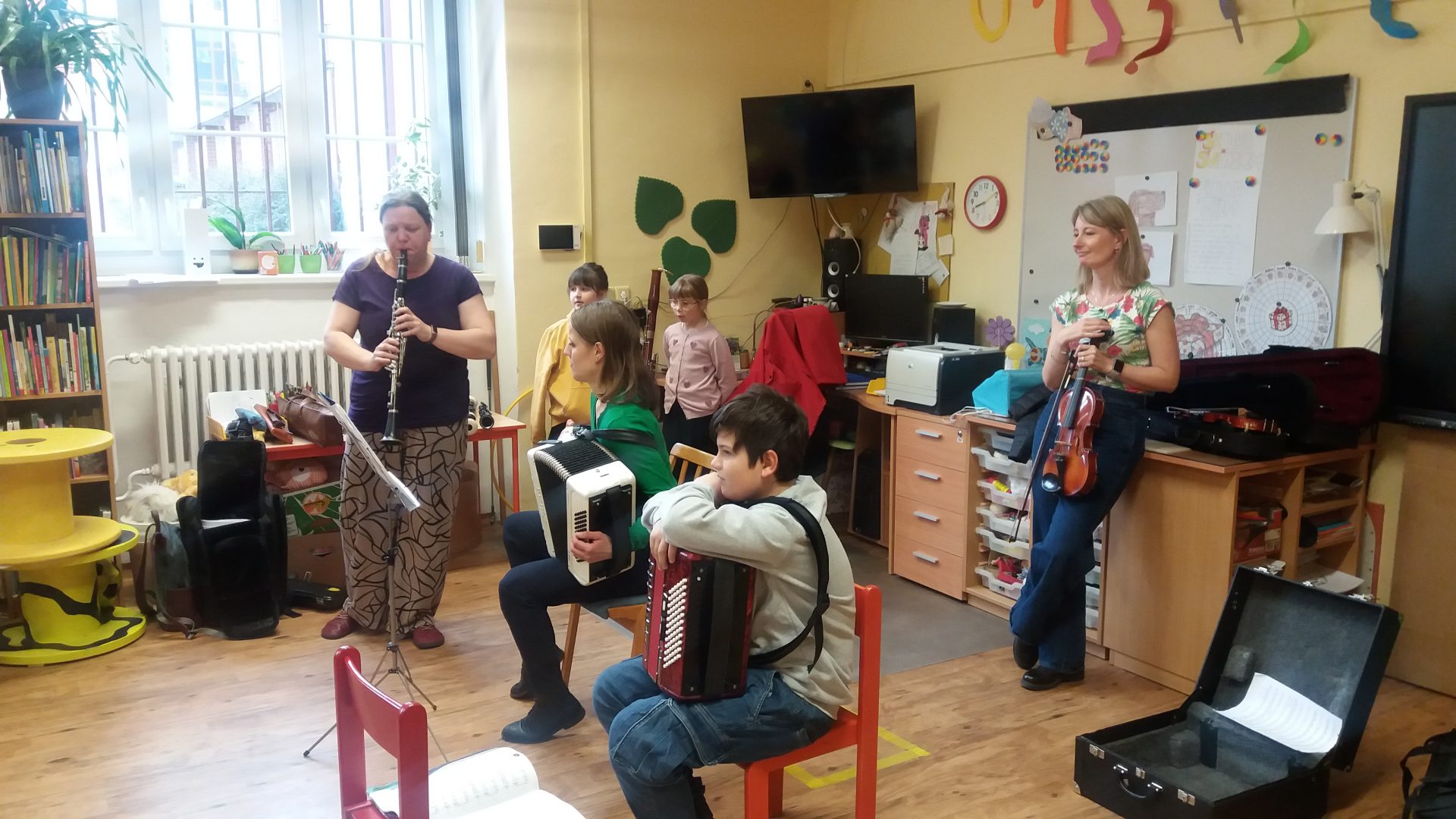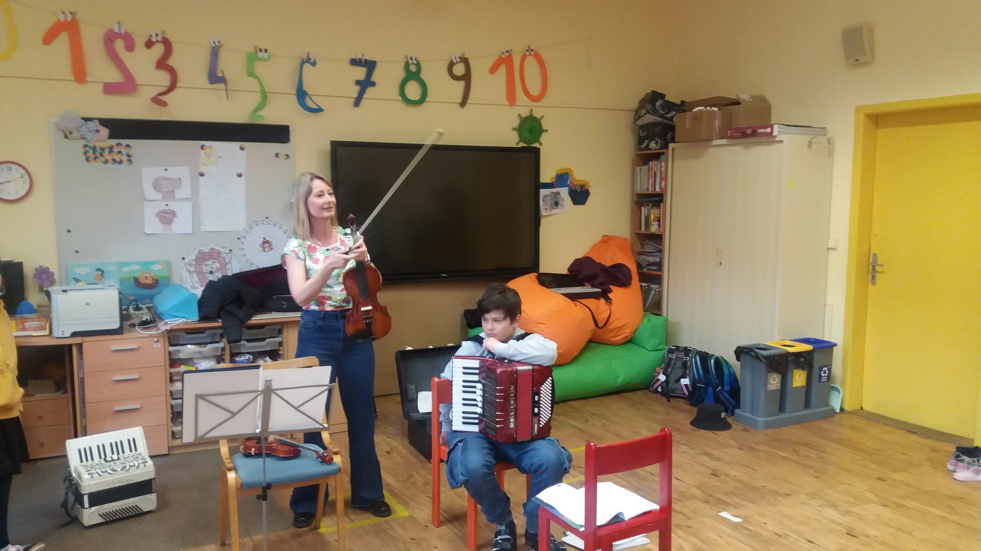 v naší nové hudební třídě jsme měli návštěvu ze ZUŠ. Paní učitelky z umělecké školy přinesly s sebou hudební nástroje, na které nám i zahrály. Krásný zvuk měly housle, hluboké