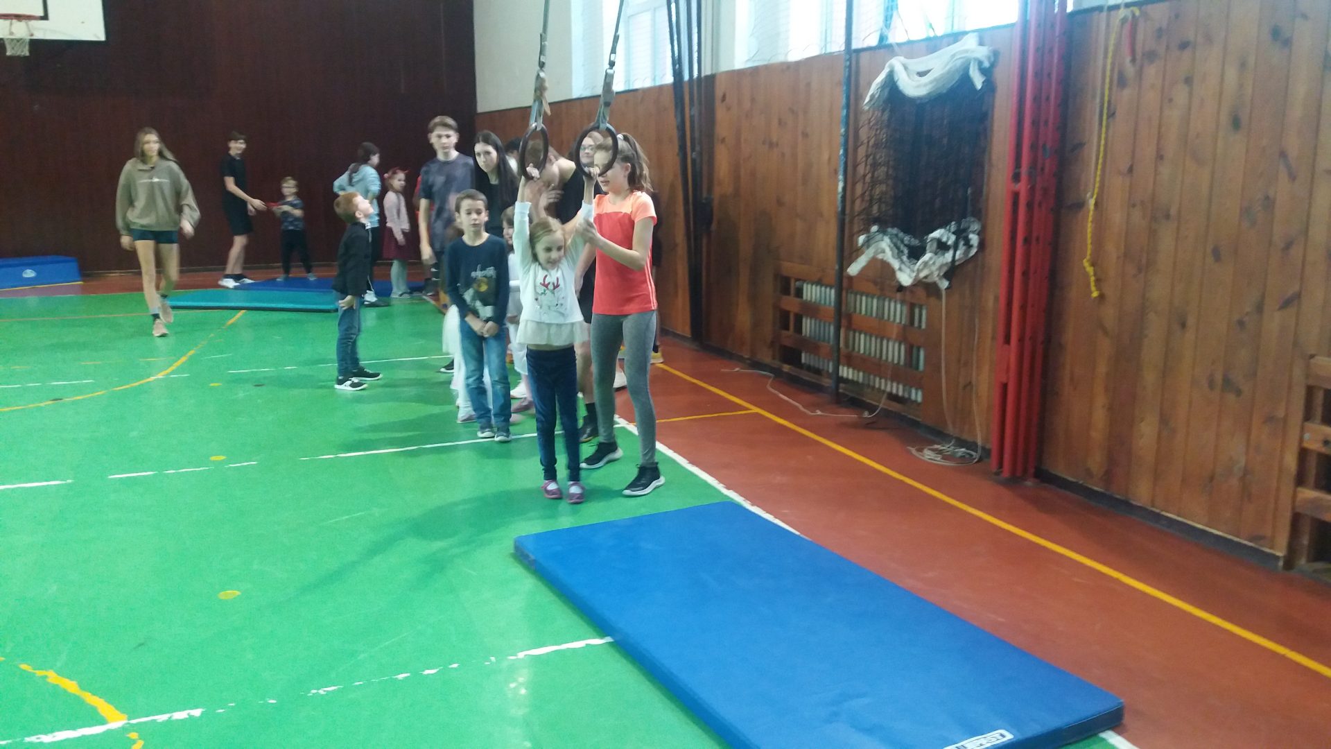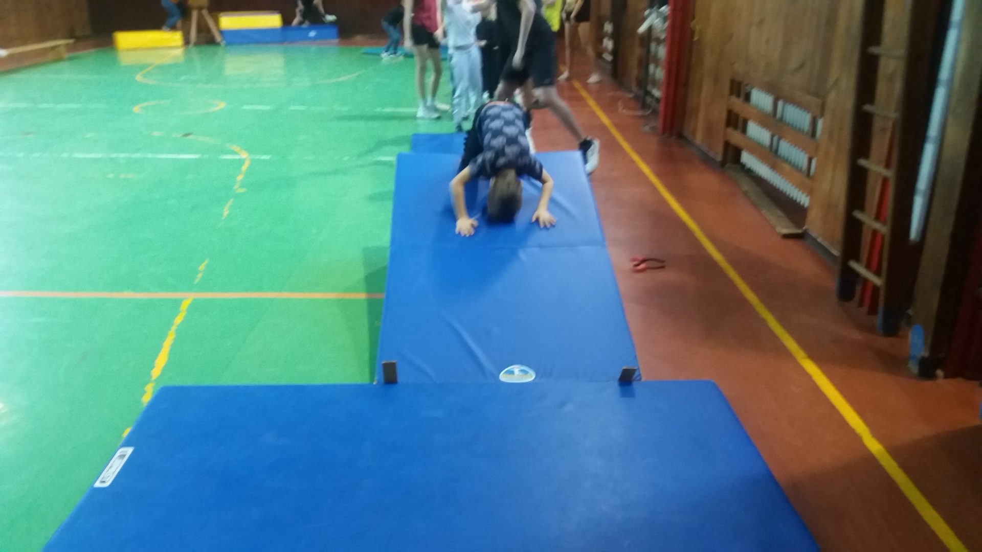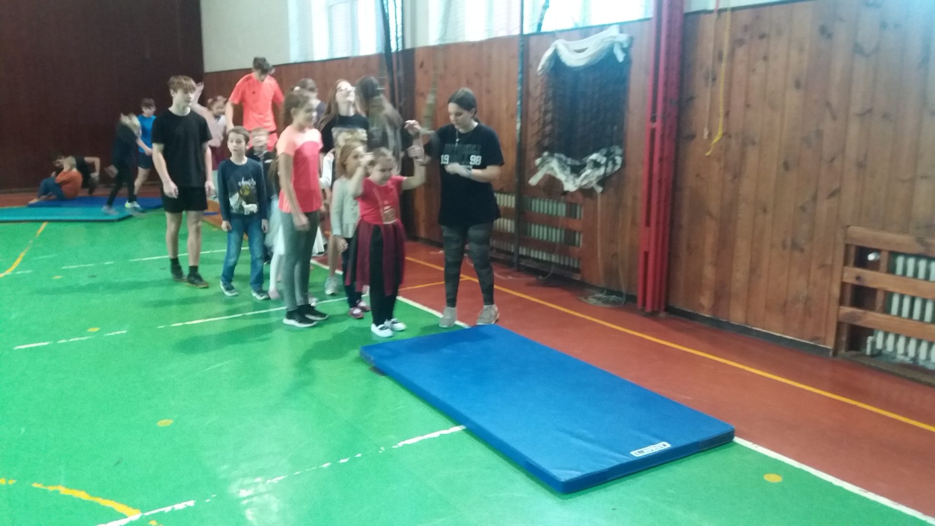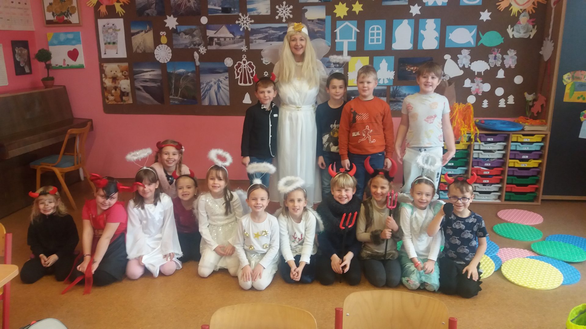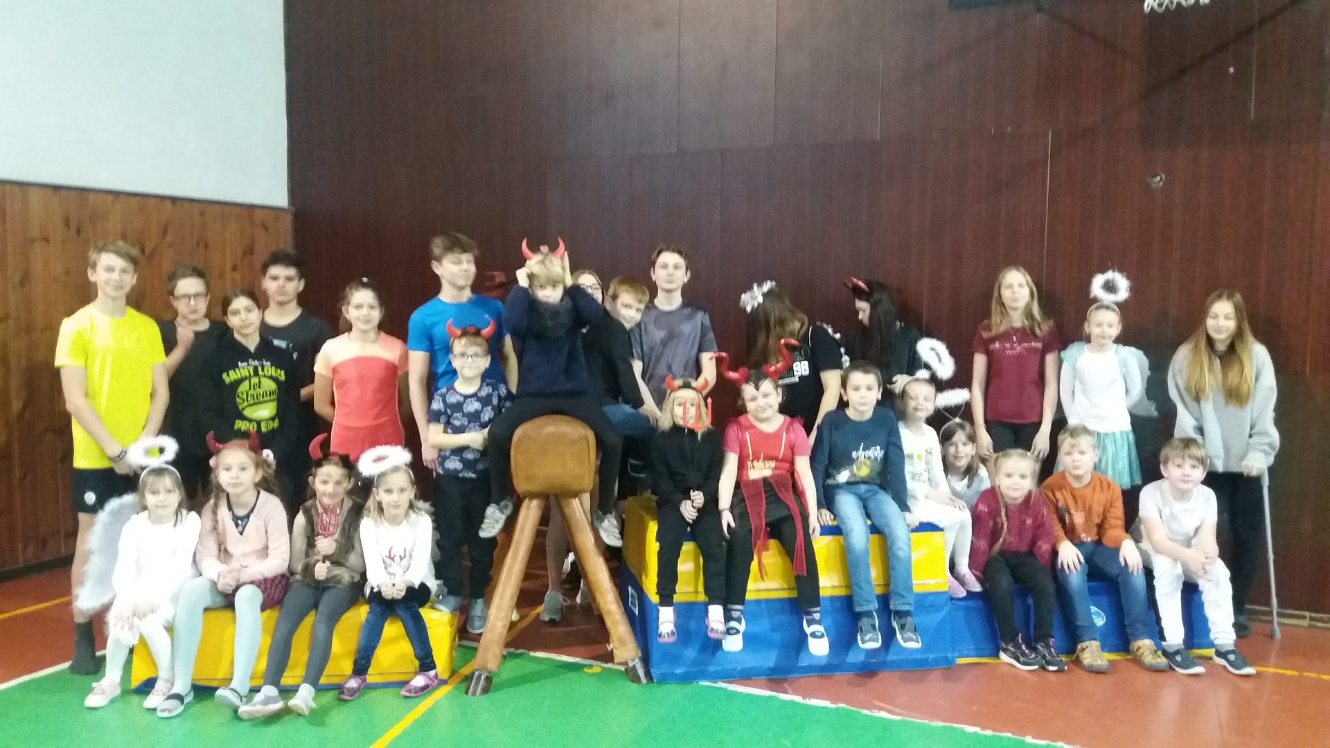 dnes jsme měli sportovní hodinu s 9.A a celé dopoledne nás učila Andělka. My jsme byli za andělíčky a čertíky. Byla to zábava. V tělocvičně jsme se staršími  kamarády překonávali čertovsky těžké překážky, Vše jsme skvěle zvládli a neublížili si. Užili jsme si hodně legrace. Andělka měla problém s křídly, které se jí zasekly u nářadí. Sportovat v maskách je opravdu náročné. Po sladké odměně jsem se rozloučili a těšíme se na další setkání třeba při vánoční besídce.