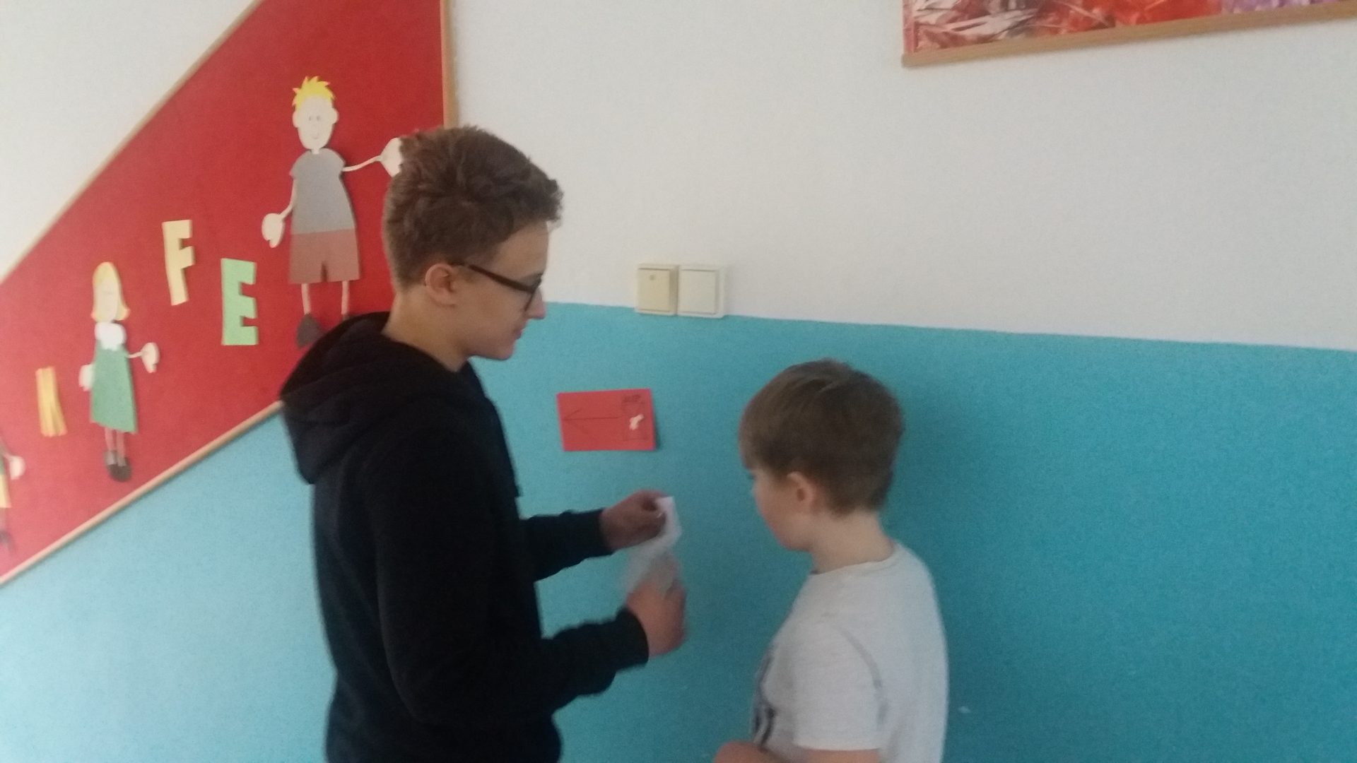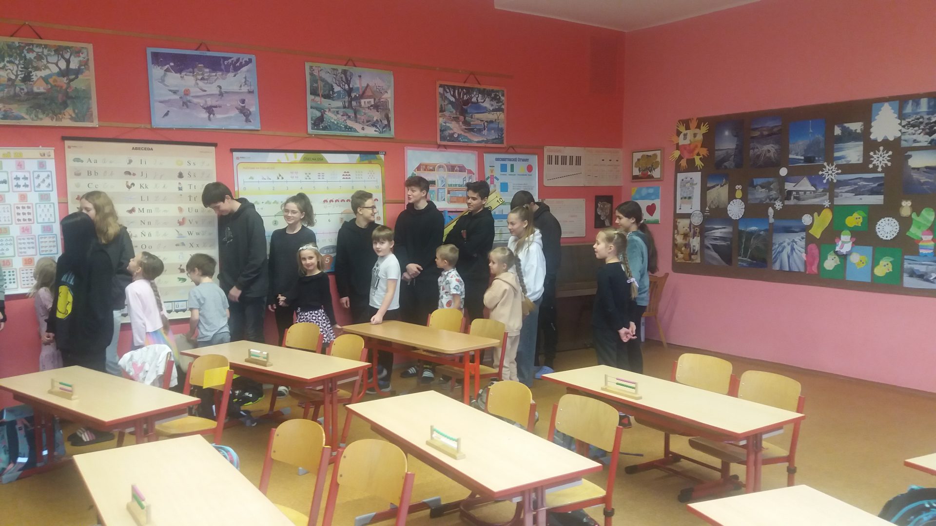 dnešní den byl pro nás velmi slavnostní. Všichni jsme se moc těšili na pololetní vysvědčení. Také jsme se vůbec neučili. Paní učitelka pro nás připravila obtížnou cestu plnou úkolů v hledání tří pokladů. Na cestě  nám pomáhali naši kamarádi z 9.A.  Všechny tři poklady jsme pomocí splněných úkolů našli. Užili jsme si hodně zábavy a těšíme na další společná setkání.