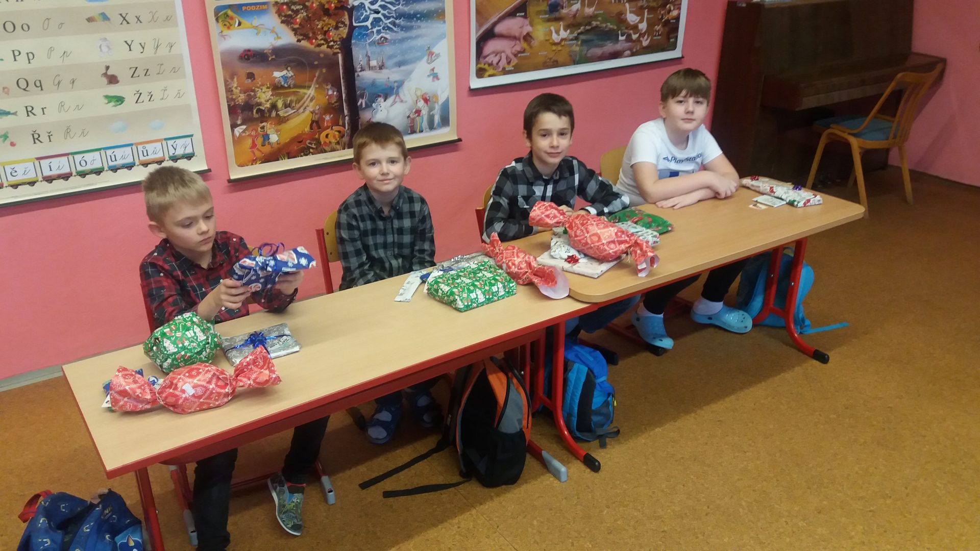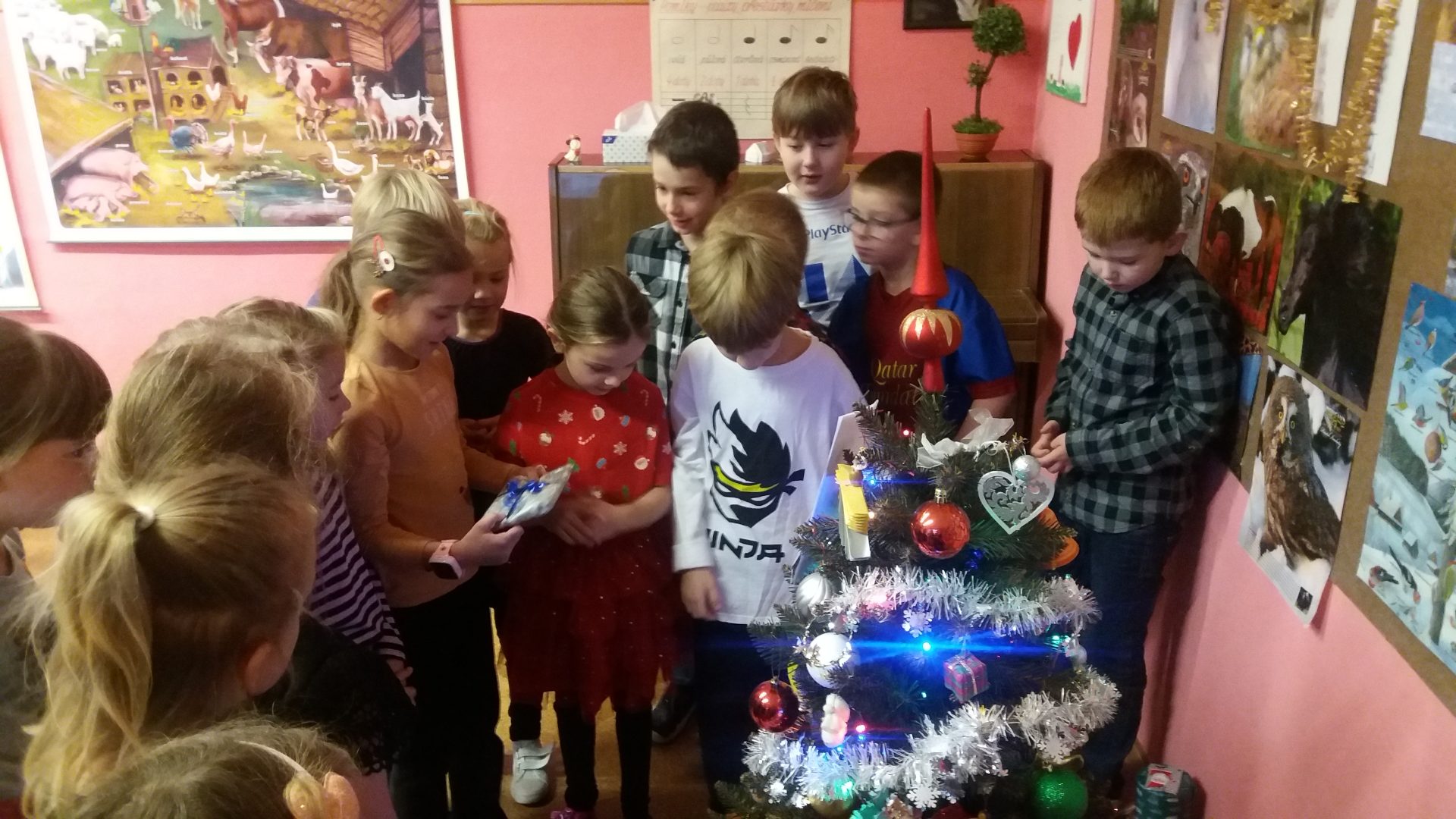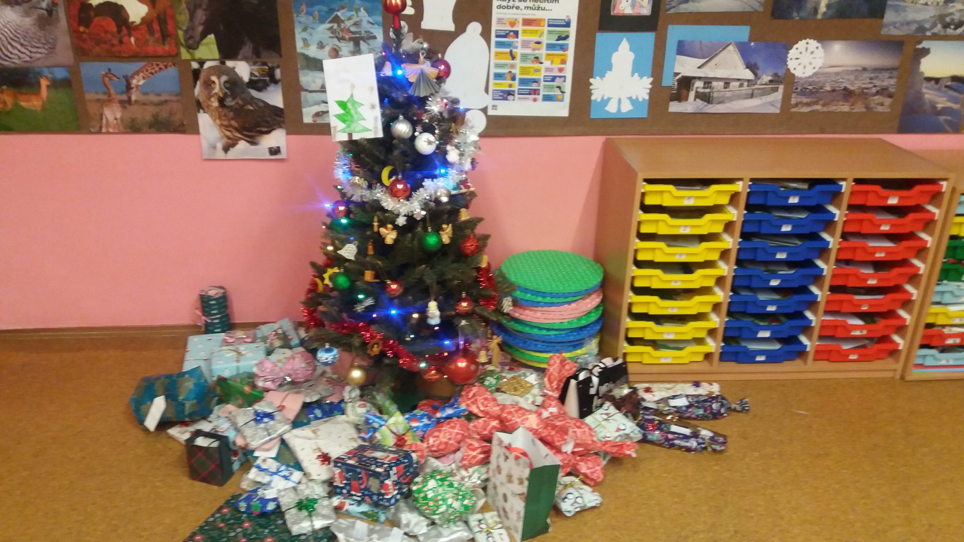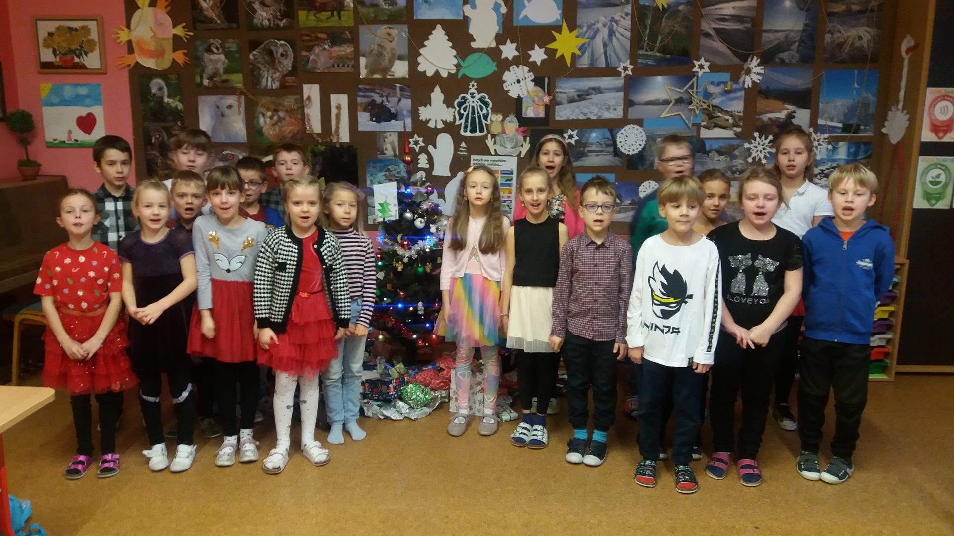 konečně přišla chvíle nadělování u stromečku v naší třídě. Nejdříve jsme otevřeli všechna zbývající okénka v adventním kalendáři, zazpívali si koledy a šli předávat dárky. Bylo jich hodně, asi jsme byli opravdu hodní. I paní učitelka byla moc překvapená a šťastná. To bylo radosti při rozbalování. Ježíšku děkujeme! Cukroví od maminek nám chutnalo a všechno jsme snědli. Některé děti si pro nás připravili vystoupení. Ani jsme nestihli všechny soutěže, čas uplynul velmi rychle a my museli před pohádkou ještě uklidit třídu.