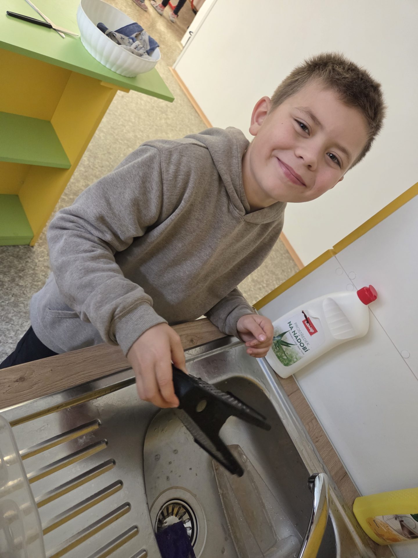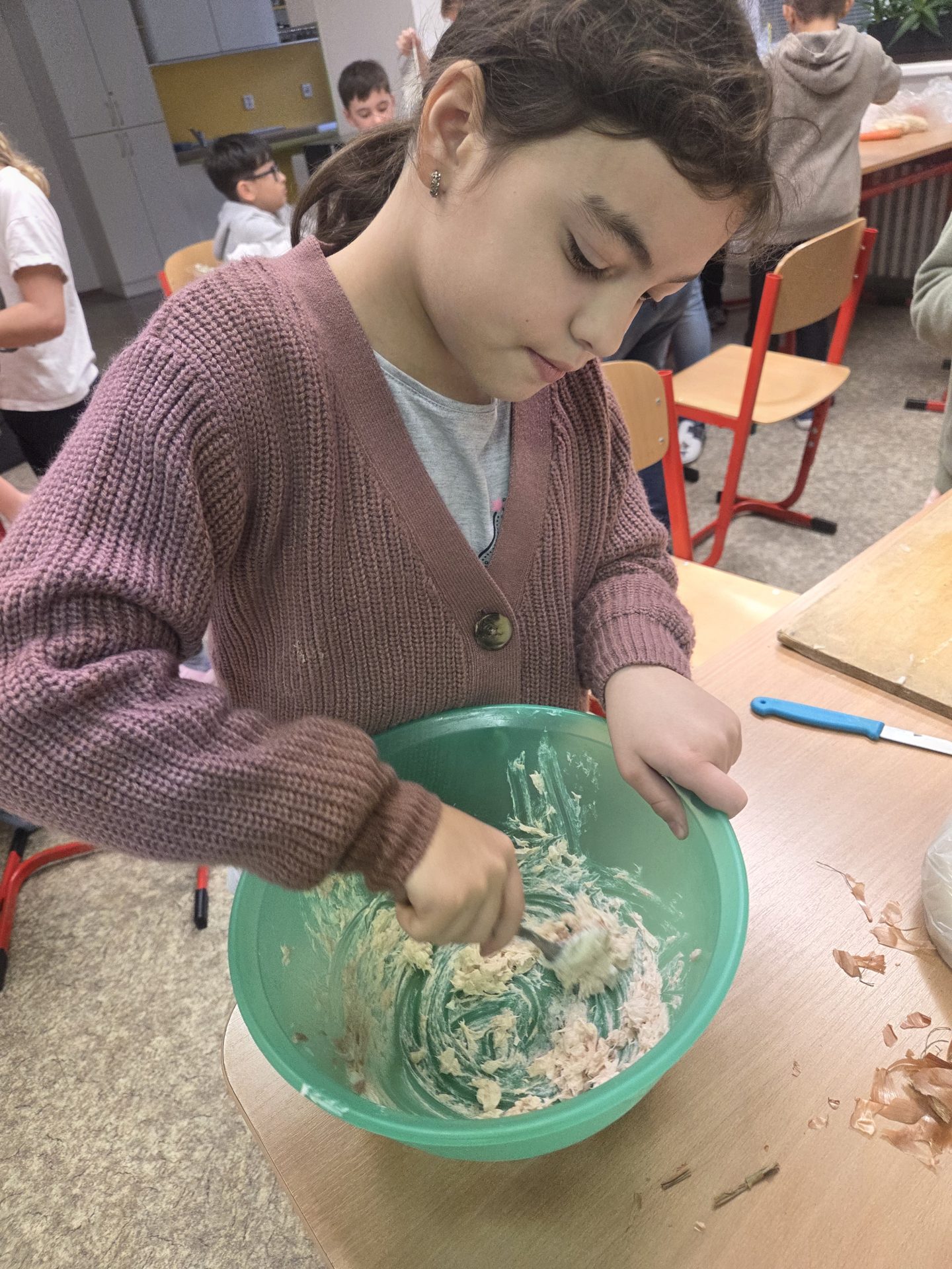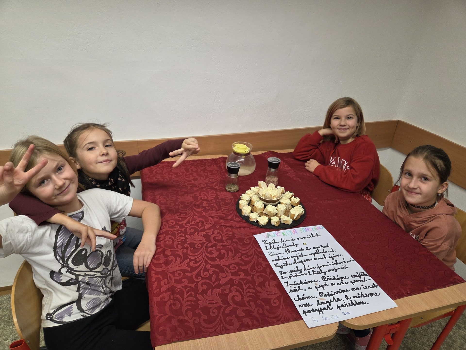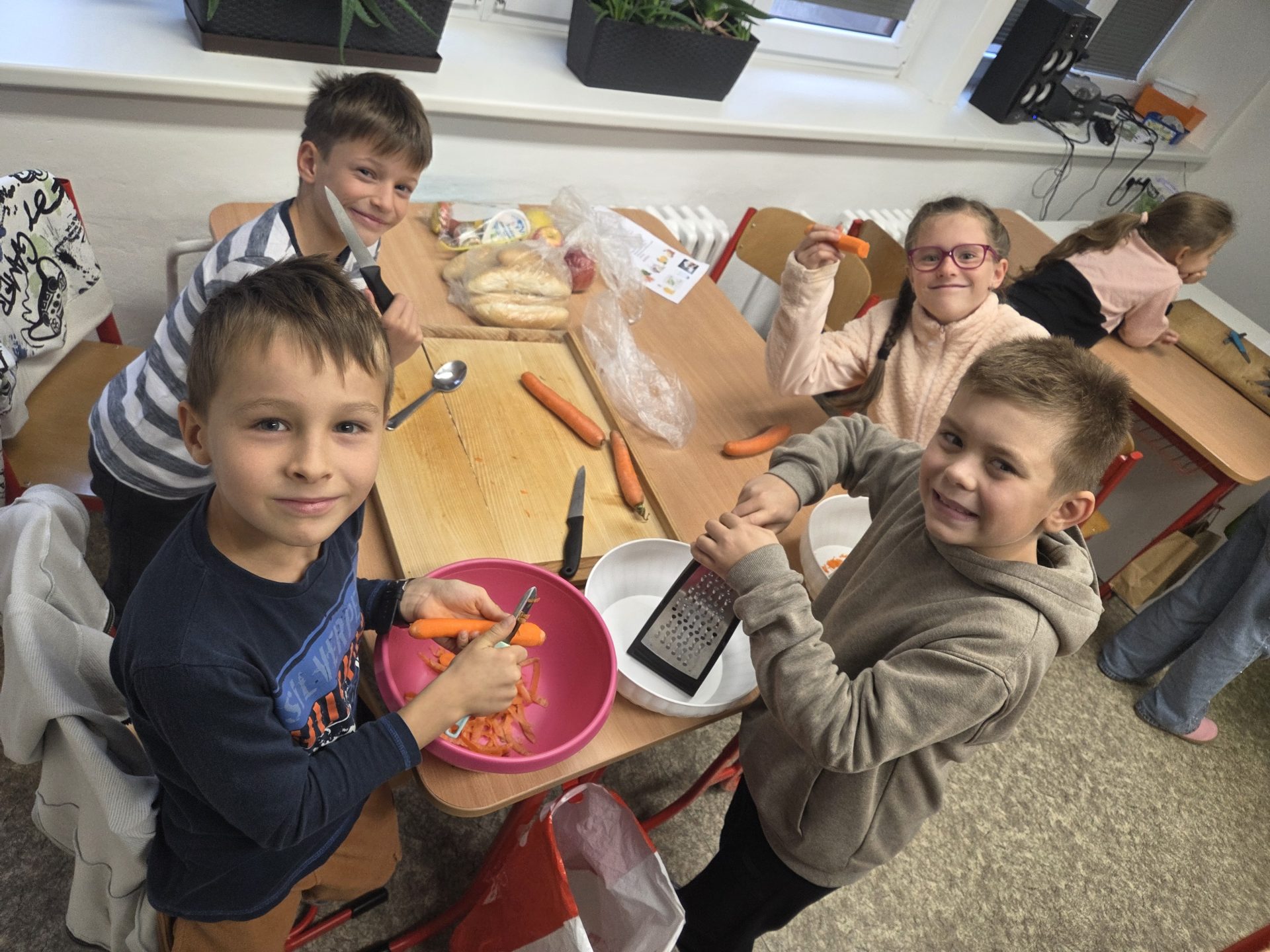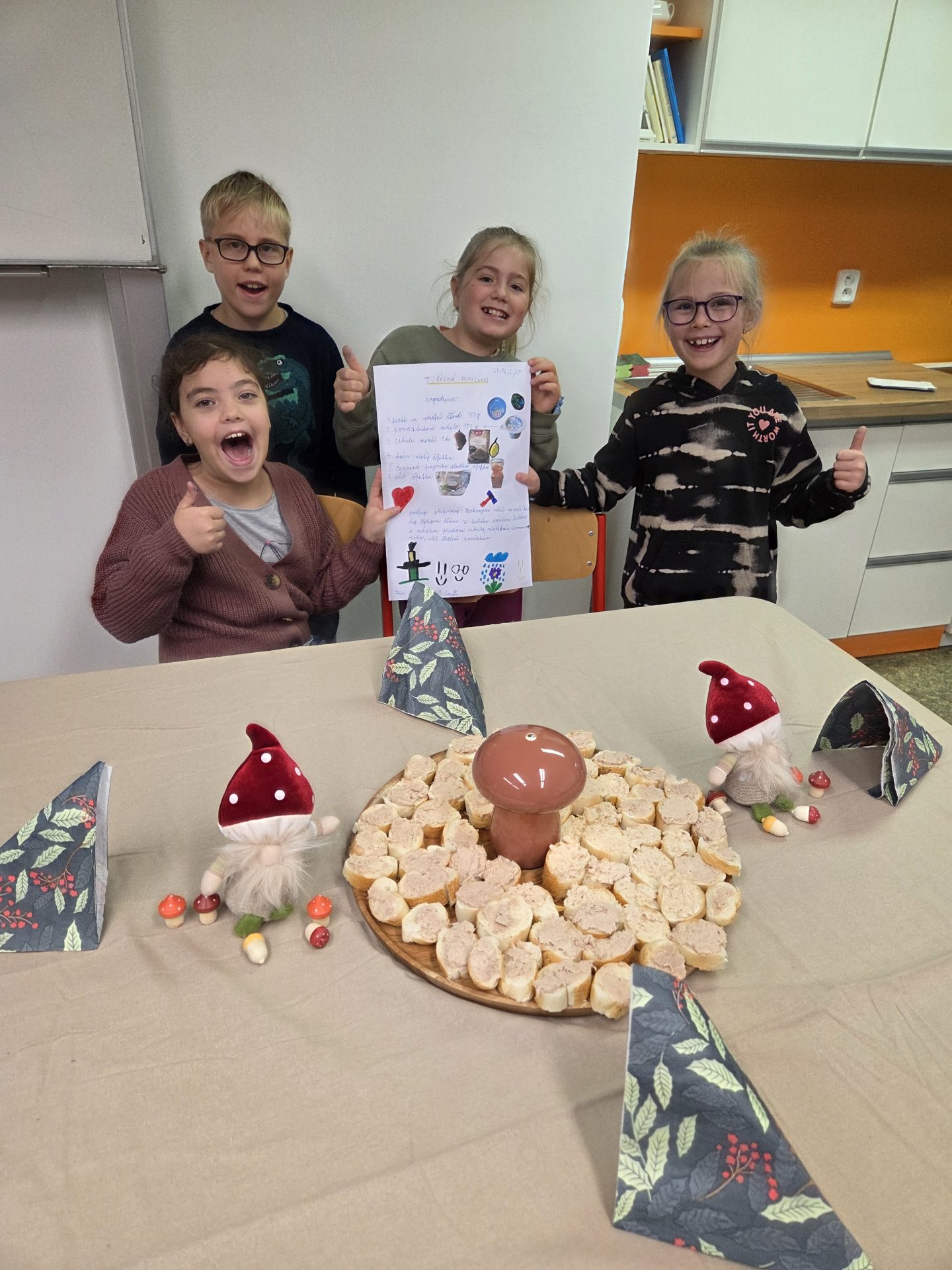 Kouzelné sluchátko vzalo děti ze 3. B do školní kuchyňky, kde díky vzájemné spolupráci vznikaly ty nejlepší „jednohubky“. Děti si organizovaly práci od nákupu surovin, přes postup, průběžný úklid pracoviště až po servírování úplně sami. Dokonce zvládli napsat i pracovní postup. Ochutnat jsme mohli celkem 5 pomazánek – vajíčkovou, avokádovou, sýrovou s česnekem, mrkvovou a tuňákovou.