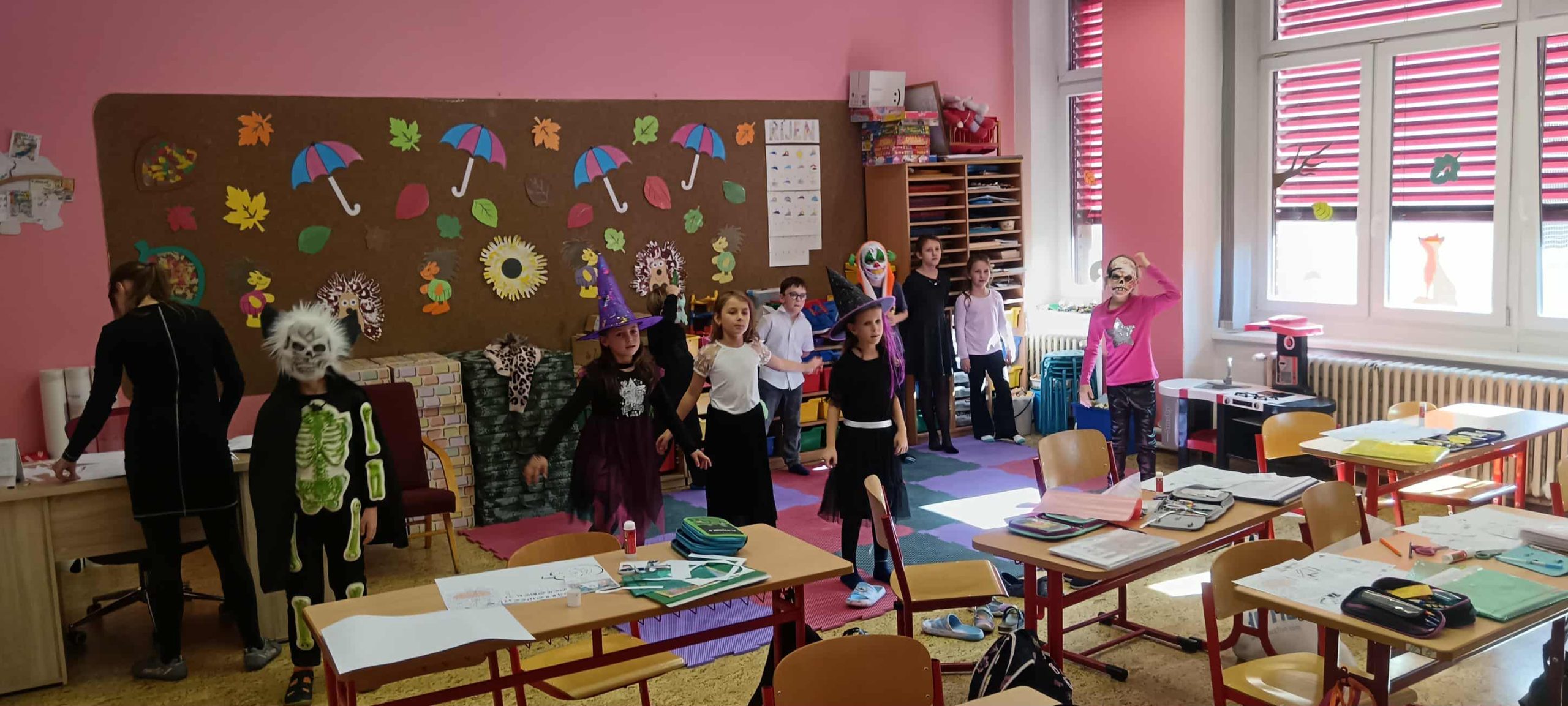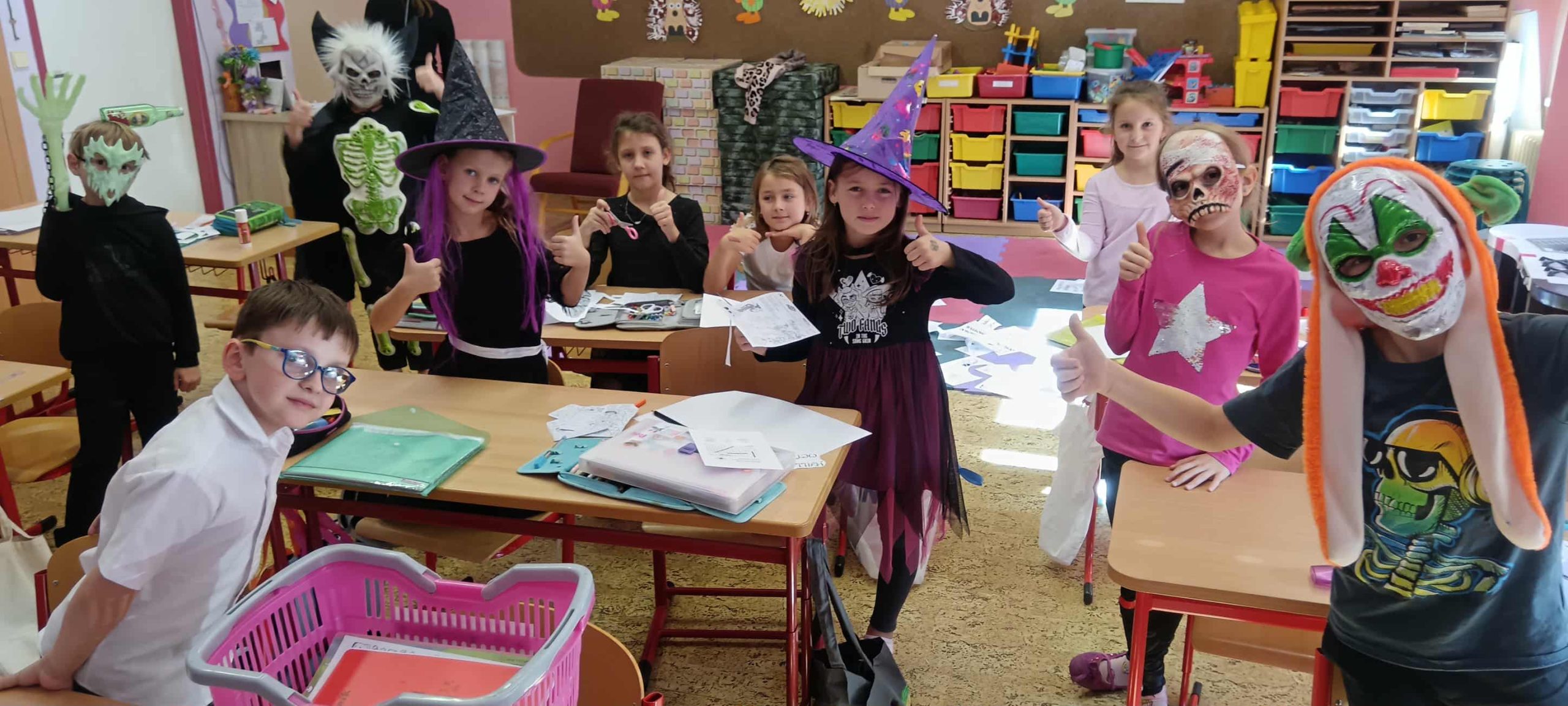 Halloween je keltský svátek s historií sahající až do doby před naším letopočtem. Dávní Keltové si oblékali masky a kostýmy, aby se zamaskovali před zlými duchy, aby je odehnali. Zvyk se do moderní podoby masek a kostýmů přenesl díky přistěhovalcům do USA z Irska. Dnes chodí děti ve strašidelných kostýmech od domu k domu a se slovy „trick or treat“ koledují od sousedů sladkost jako vykoupení. Pokud by nic nedostali, lakomcům by něco provedli. Keltové během noci z 31. října na 1. listopadu slavili příchod nového roku, který se v keltštině nazýval Samhain. Mnohé z původního Halloweenu se dochovalo dodnes. Lidé před svými domy staví malé oltáře, k jejich stavbě jsou používány vyřezávané dýně a místo ohňů se zapalují svíčky. My jsme v hodinách ANGLIČTINY oslavili tento svátek plněním zábavných úkolů na interaktivní tabuli, luštěním křížovek, osmisměrek, rébusů, skládáním puzzle. Zhlédli jsme strašidelný příběh a zatančili si halloweenský taneček.