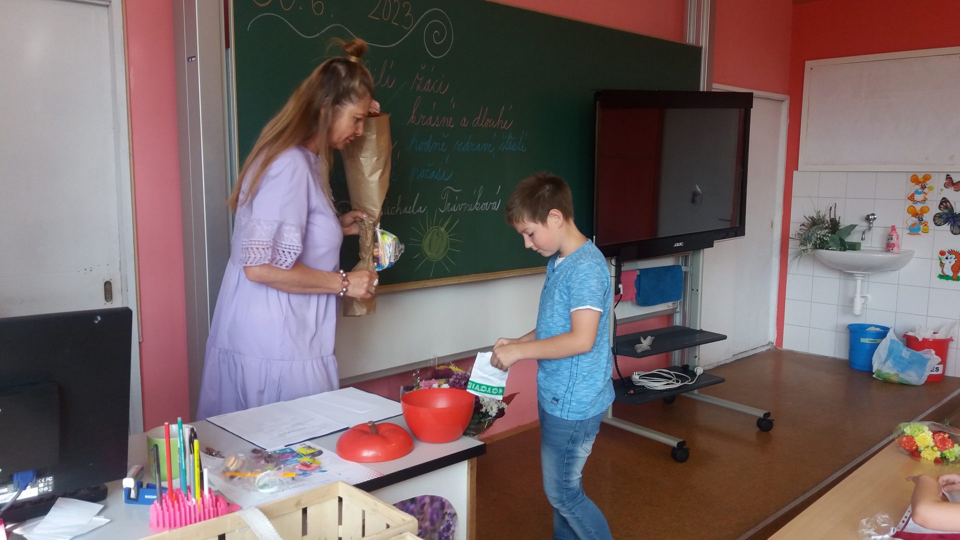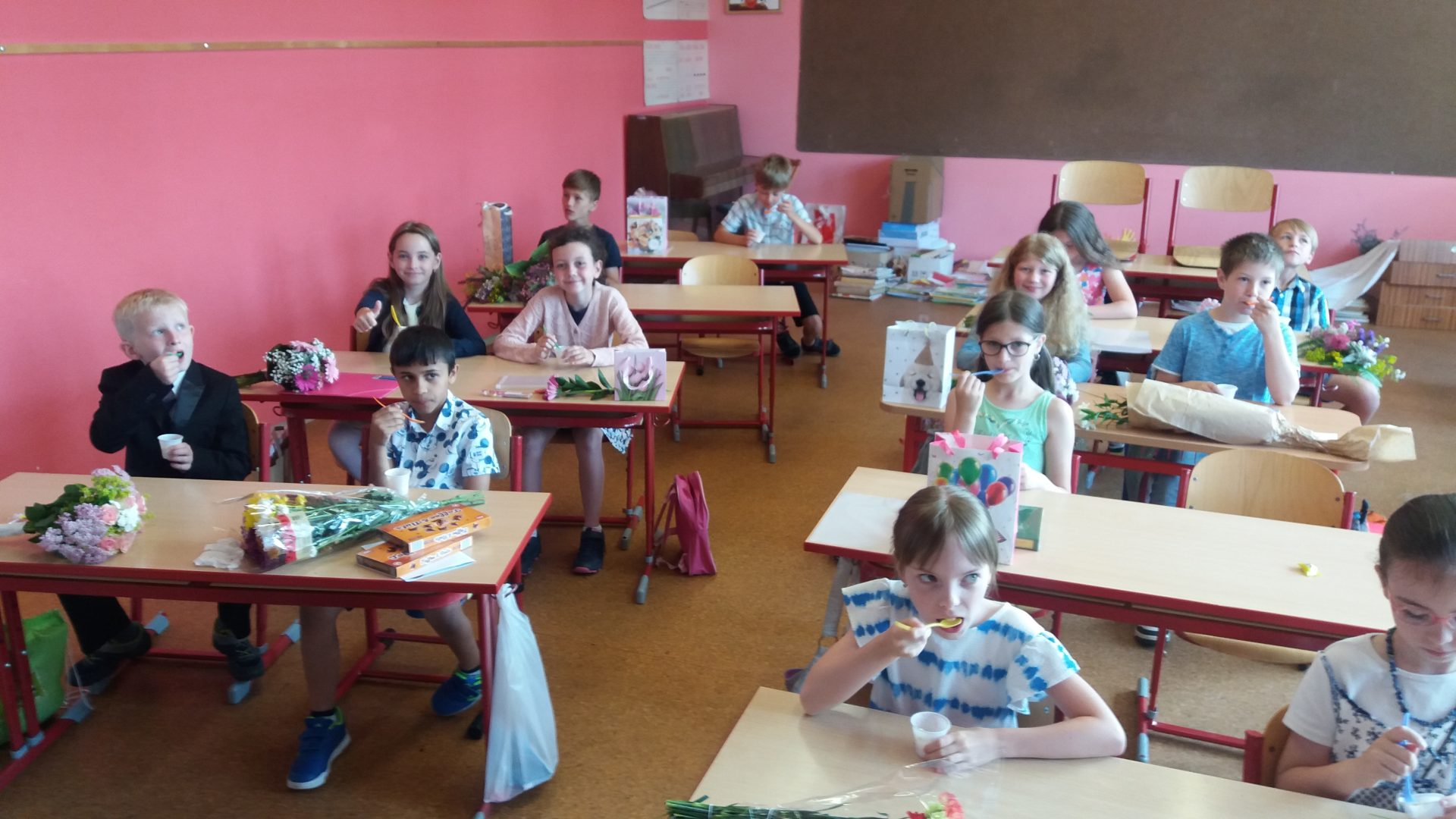 hurá jsou prázdniny!!! Poslední slavnostní hodinu jsme zahájili netradičně, paní učitelka byla zmrzlinářka a servírovala nám zmrzlinu. Docela jí to šlo, ale stejně u toho mluvila jako učitelka. Musela zhodnotit chování a prospěch na konci roku. Při pojídání zmrzliny se to lépe poslouchalo. Vysvědčení je rozdáno, všichni mají vyznamenání. Paní učitelka nás chválila nejen za prospěch, ale také za chování a sportovní výkony. Všichni jsme dostali pěknou pochvalu a dvě vysvědčení – sportovní a školní. Na závěr společné foto a veselé loučení.
