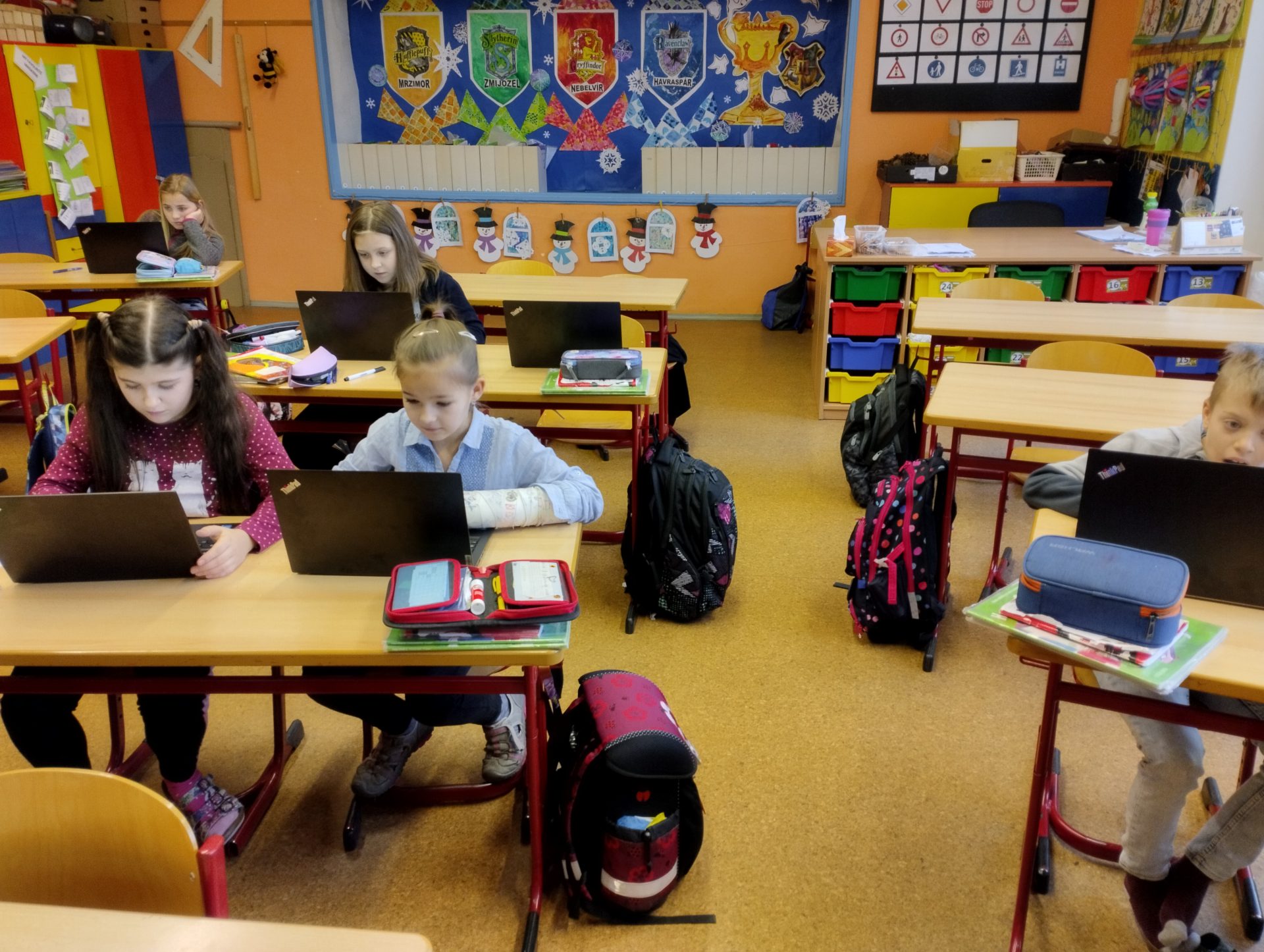 Záhadný box? Pro nás teď už ne! Je to dobíjecí stanice pro notebooky. Ty jsme si vyzvedli a mohli se pustit do práce v hodině anglického jazyka. Netradiční a zábavné úkoly jsme vyhledali v rozsáhlé cvičebnici UMÍME TO. Každý z nás si zde založil svůj účet – a můžeme začít! Jedno téma procvičujeme řadou různých způsobů a hravých prvků. Hodnocení v UMÍME TO neprobíhá pomocí známek, ale pomocí motivačních prvků – štítů, krystalů a pohárů. Každou chybu lze napravit pomocí dalšího procvičování, a tak i chybující holky a kluci můžou dosáhnout nejvyššího štítu. Hravě procvičujeme a sledujeme nástěnku s připnutými úkoly. Mobilní digitální učebna je SUPER!