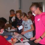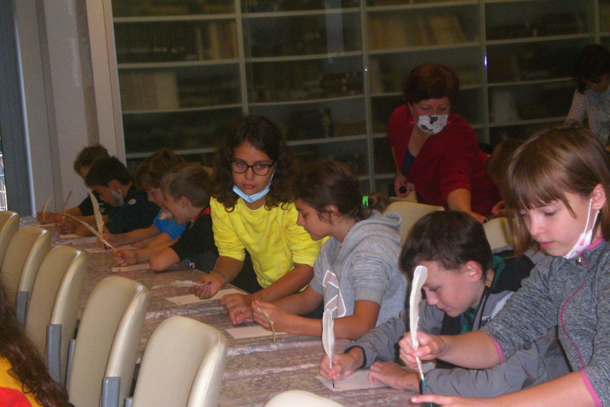 Následoval workshop, ve kterém jsme si mohli vyzkoušet práci písaře. Napsali jsme si husím brkem a inkoustem tajnou listinu a pak si ji pomocí pečetního vosku a pečetidla zapečetili.