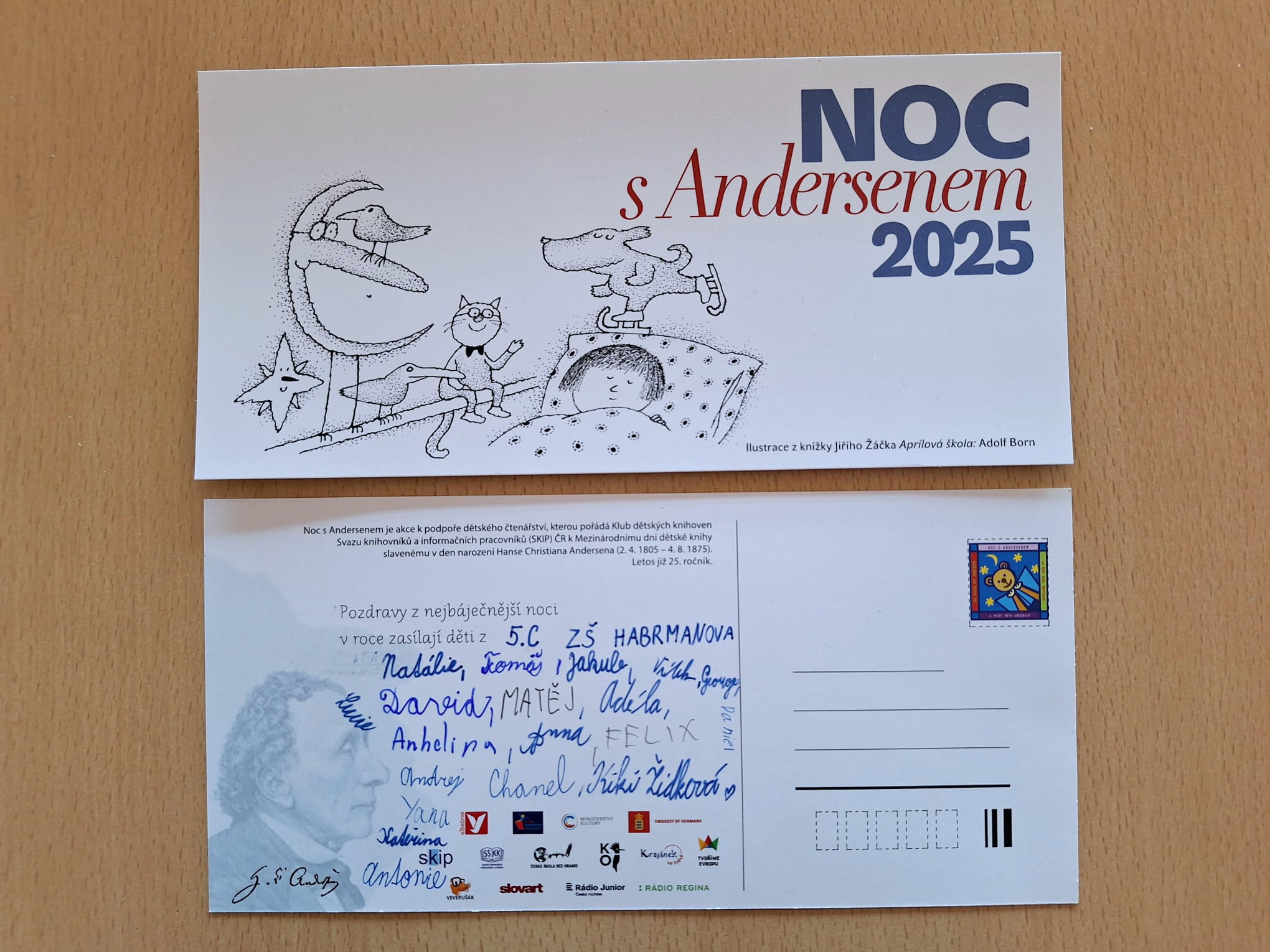 Poslední přespávání ve škole jsme věnovali světoznámému dánskému spisovateli a autoru pohádek, jehož jméno se stalo synonymem mezinárodní akce, do které se v letošním roce v ČR zapojilo více než 2000 institucí. Za naší školu tedy naše třída 5.C. Výstupem akce byly nejen zážitky s Andresenovými pohádkami, ale i pohlednicové pozdravy, které chceme adresovat babičkám a dědečkům z domova pro seniory.