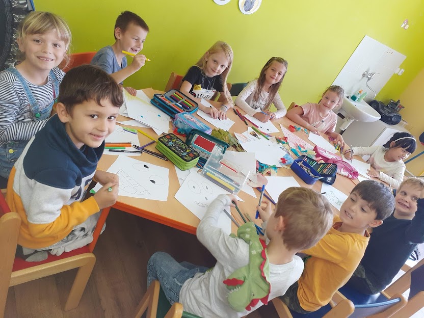 Podzim byl v naší družince opravdu pestrý. Viděli jsme kouzelnické představení, na kterém jsme se opravdu hodně nasmáli, navštívili jsme Městskou knihovnu, oslavili jsme Halloween ve strašidelných maskách, vyrobili si draky, tvořili s listím a samozřejmě si hráli jak v družince, tak i venku.