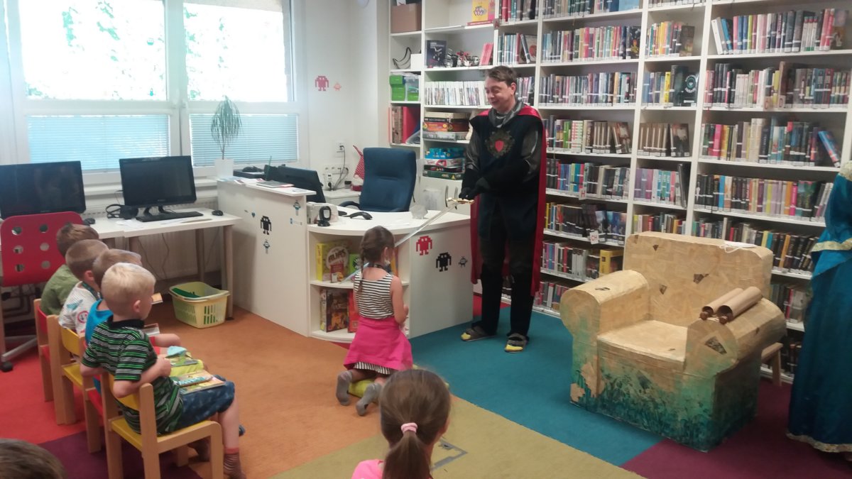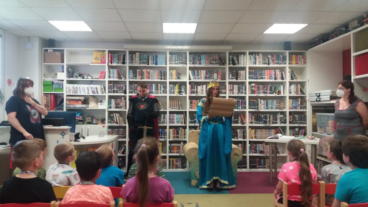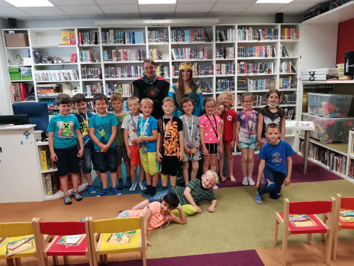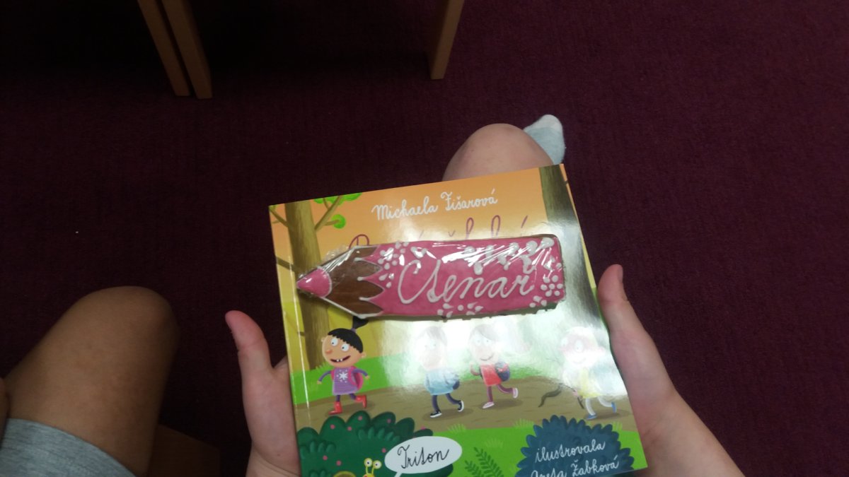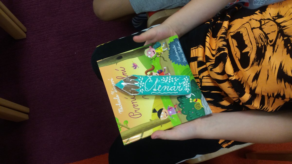 Také jsme se vrátili do knihovny na besedu se spisovatelem. Byla s ním velká legrace. Píše veselé knížky, které si někteří z nás objednáme. Vyrobili jsme si do knížky záložky myšky. Všichni jsme se těšili na obřad Pasování na čtenáře, kde jsme předvedli své čtení princezně Anně a jejímu rytíři. Všichni jsme uspěli a jsme přijati do království čtenářů. Za odměnu jsme dostali knížku a perníček. Knížku si přečteme o prázdninách a perníček už máme v bříšku…..
