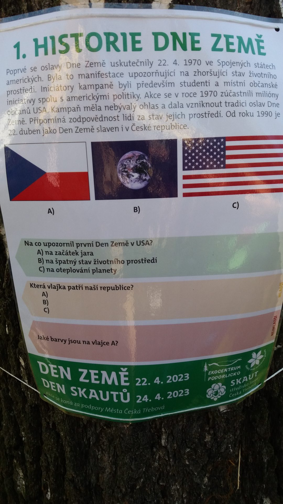 jestlipak jste oslavili svátek naší krásné planety dne 22.4. Naše třída cvrčků se byla podívat v parku Československých legií, kde na nás čekaly úkoly týkající se Dne Země, ochrany přírody – rostlin a zvířat a také skautingu. Možná někteří z nás začneme do skautu chodit. Otázky s úkoly jsme vyplnili ve třídě a vrátili do obálky v parku. Doufáme, že jsme moc nechybovali. Nejdůležitější je naší planetě pomoci, nebudeme ji znečišťovat odpadky a zamořovat špatným ovzduším. Pojďte nám všichni pomoci, ať se nám tu pěkně žije.