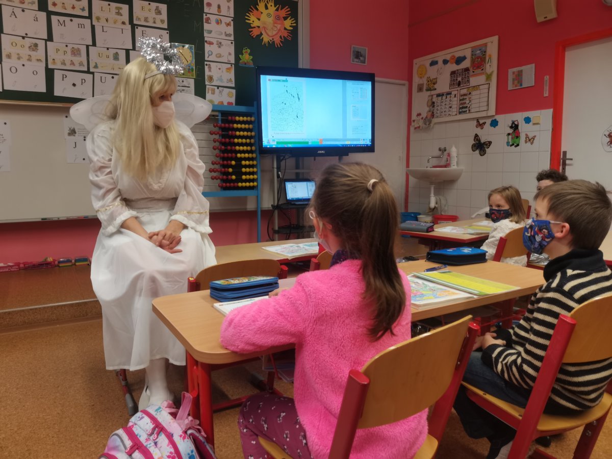 V pátek 4.12. měla naše třída neobvyklé vyučování s paní Andělkou. Četli jsme velmi pěkně,také trochu psali. Nejlepší bylo nakupování ovoce v Matematice. Poslední dvě hodiny jsme tvořili zimní čepice, ale jen z papíru. Jako návrháři jsme navrhli vzory, namalovali a také čepici vystřihli se sněhovými vločkami. Nejdůležitější však byla návštěva tradiční trojice Mikuláš, Anděl a čert. My jsme se na návštěvu den předem připravili a vyrobili jsme jim na uvítanou malé Mikulášky z papíru. Přednesli jsme mu všichni naše známé básničky.