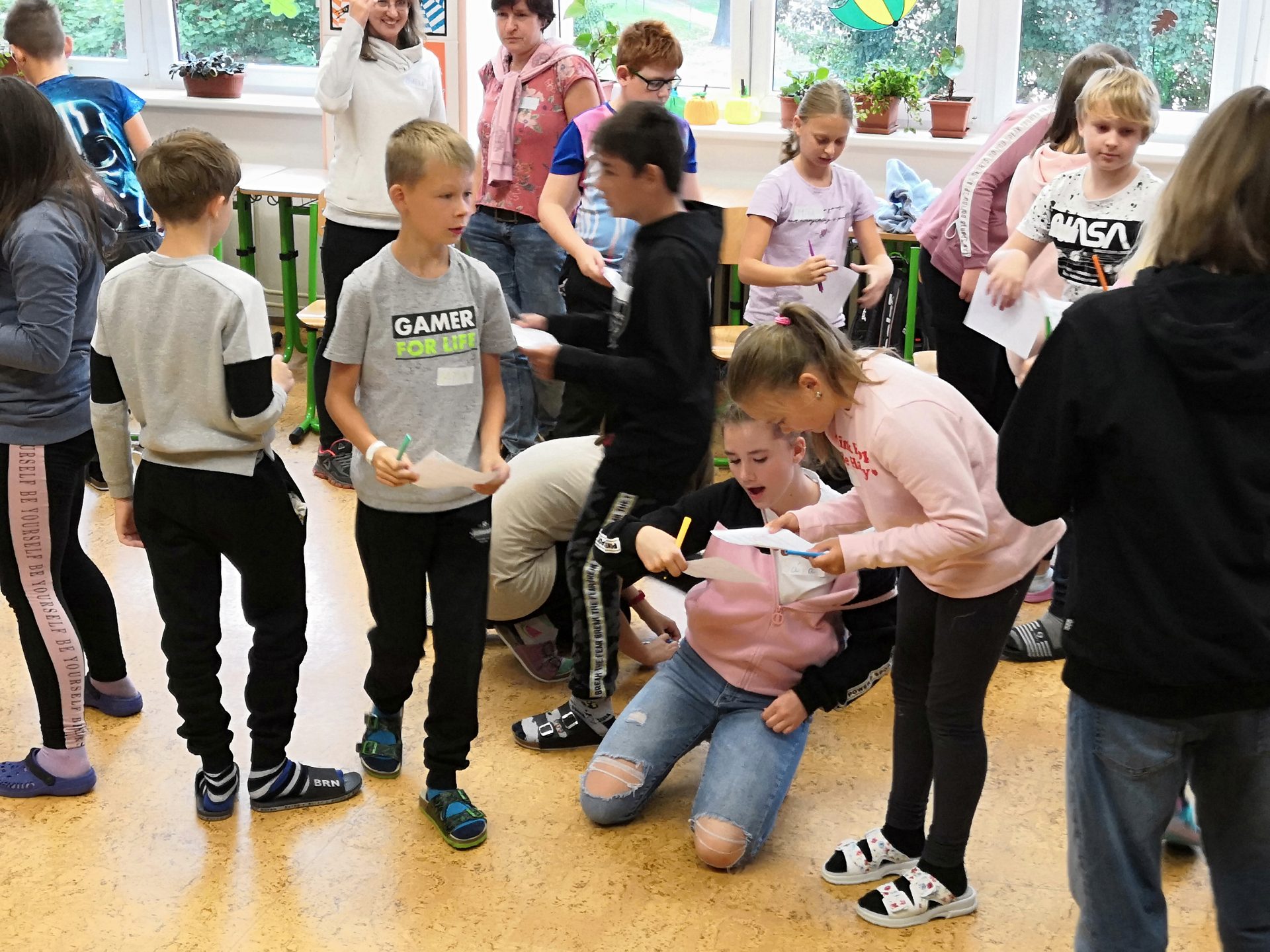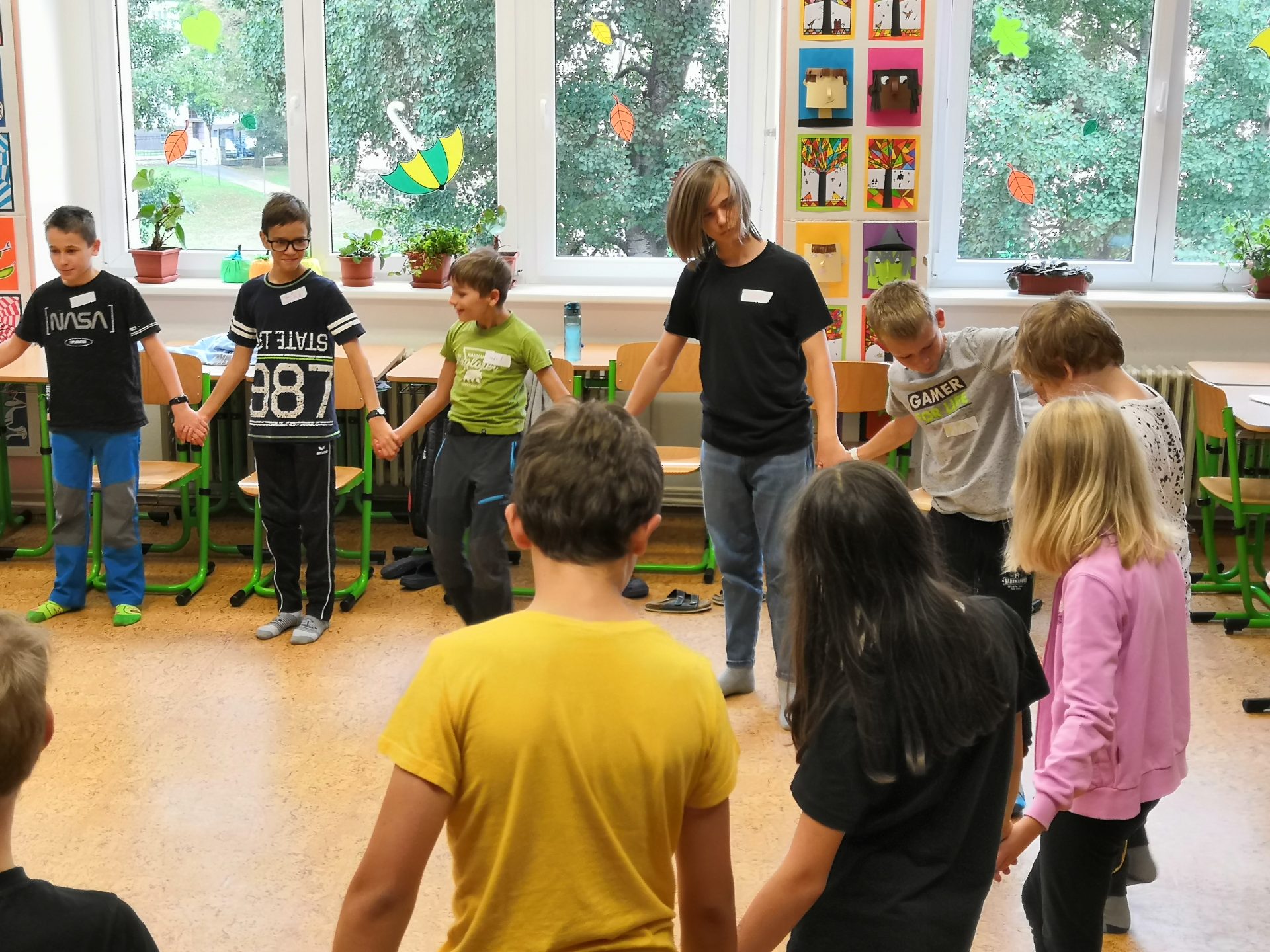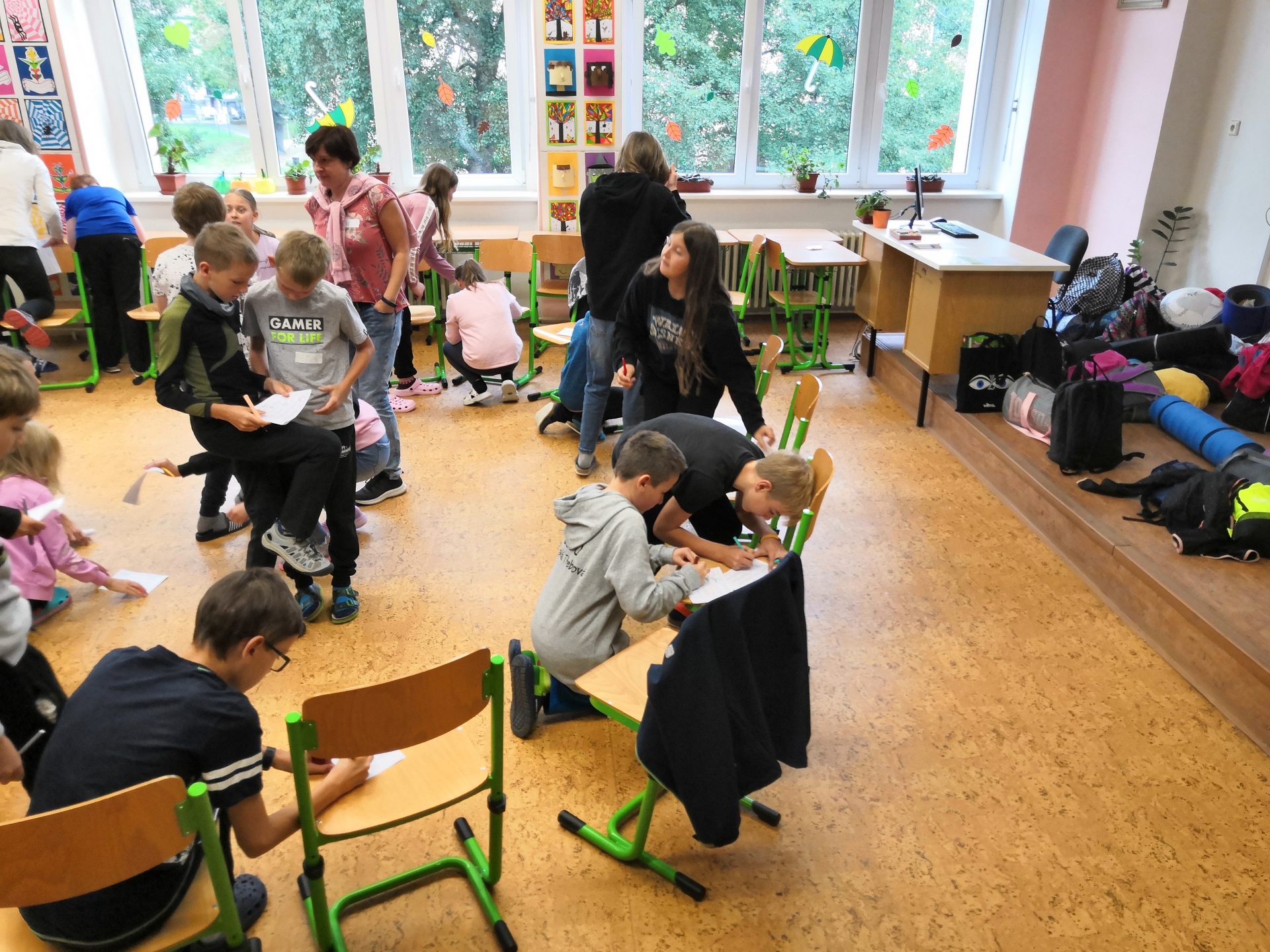 Během dopoledne jsme společně plnili různé úkoly a hráli hry – zaměřené na bližší seznámení s novými žáky a vytváření kladného klimatu ve třídě.