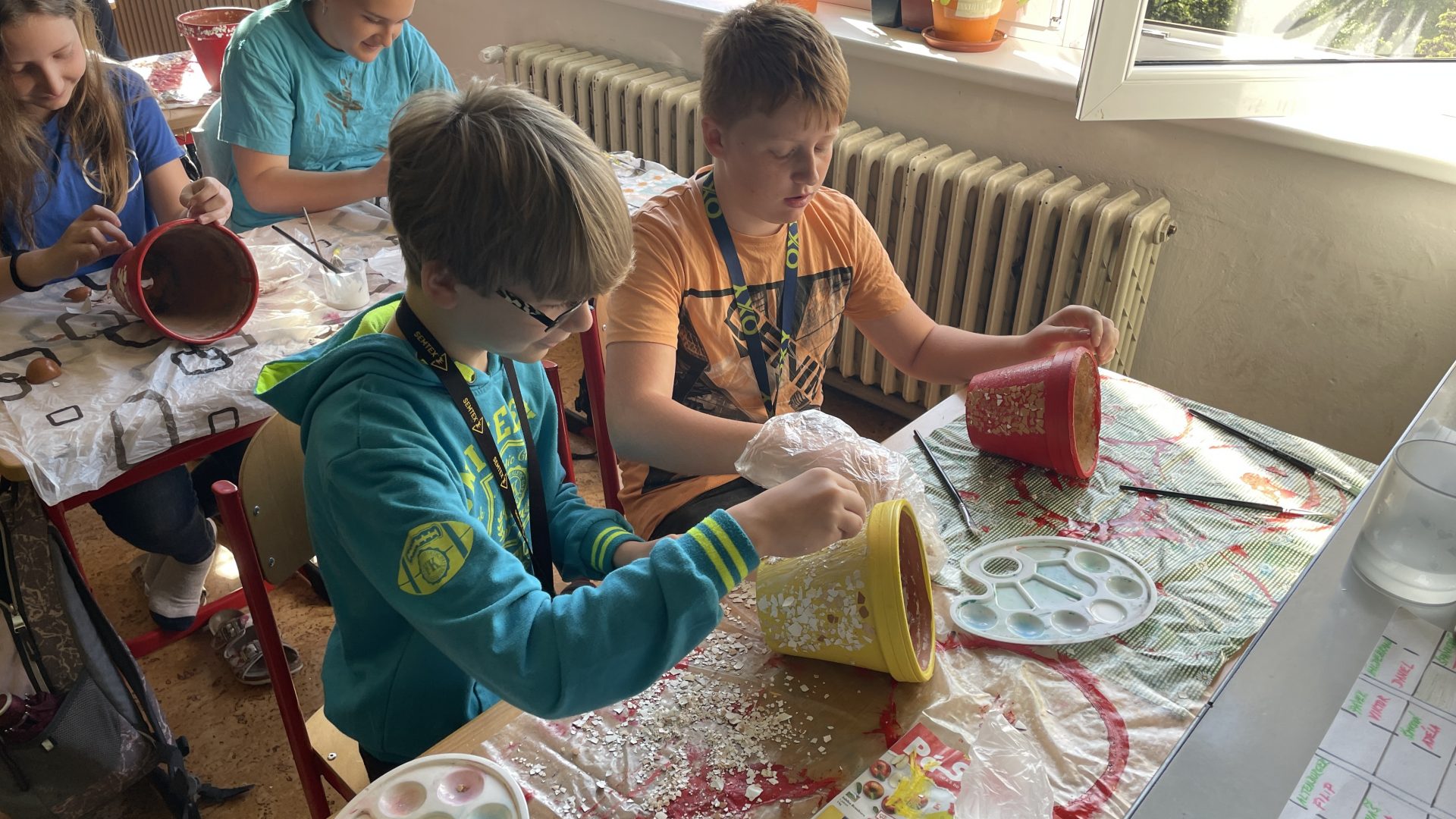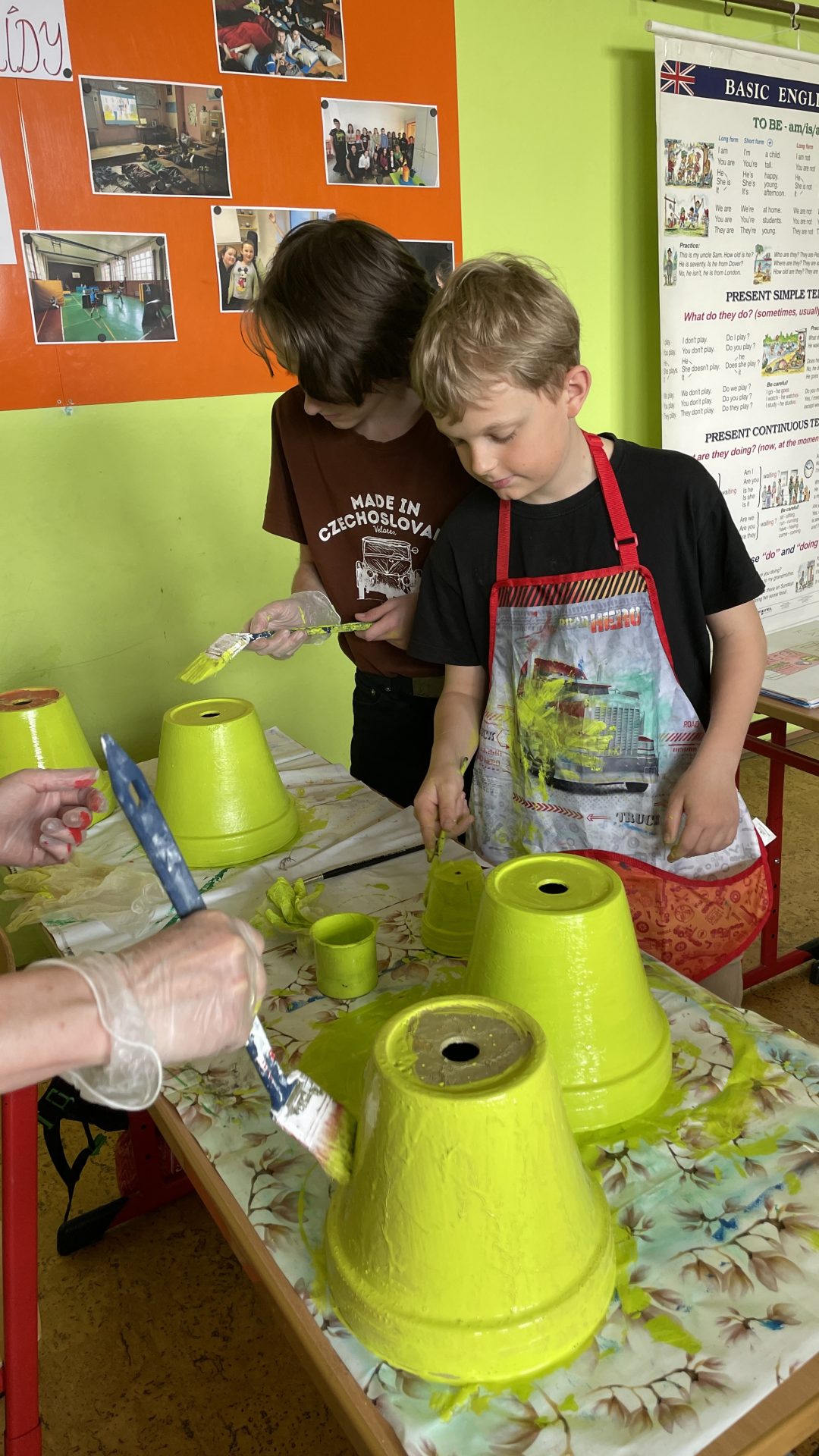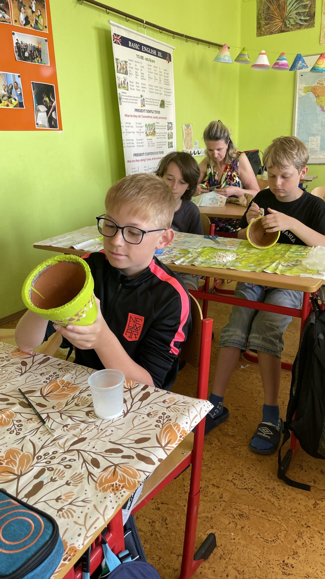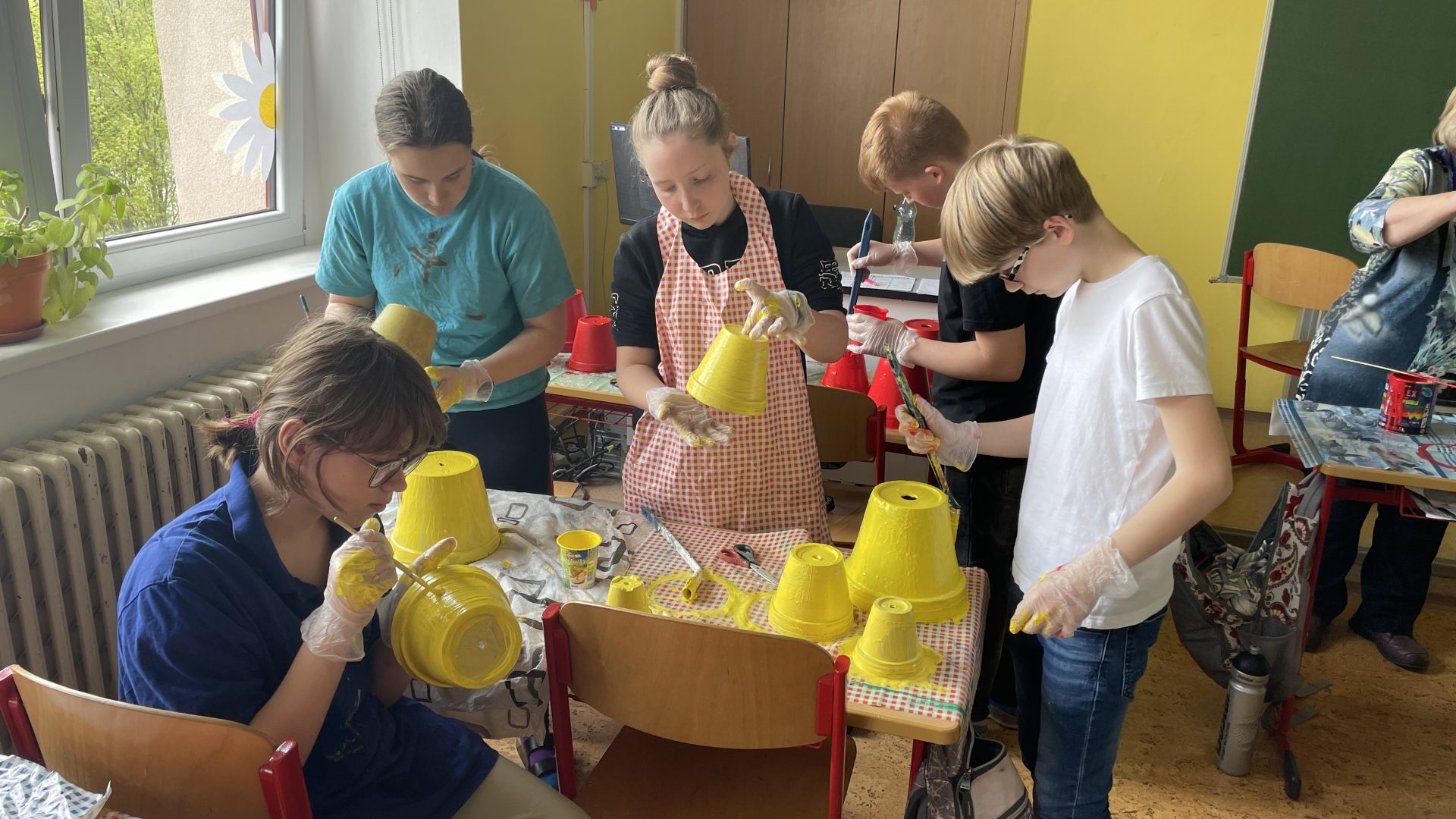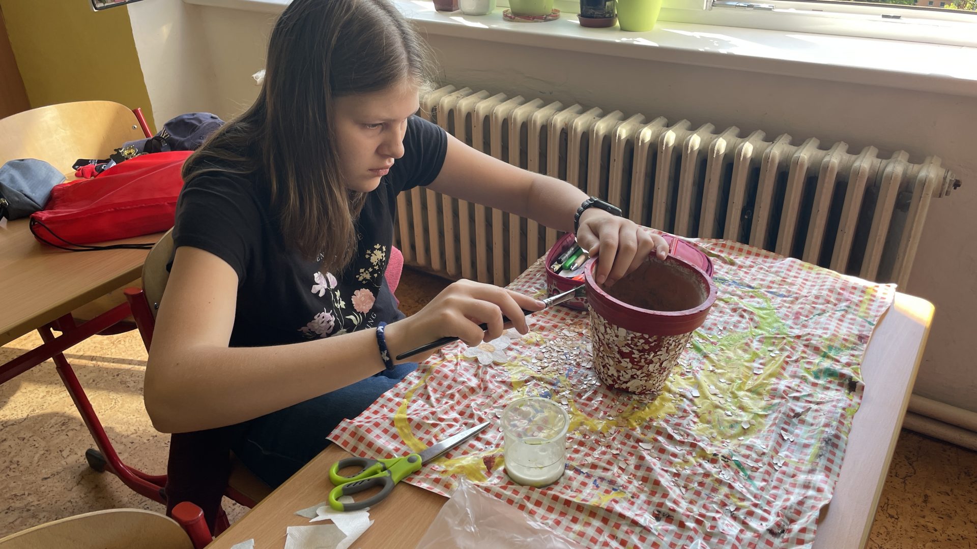 „Každá třída měla vyrobit výrobek do prodejních stánků. Paní asistentka si vzpomněla na staré květináče ve sklepě školy a tak jsme se rozhodli, je podle vzoru, který jsme viděli v knihovně, ozdobit. Nejdříve jsme květináče očistili, natřeli barvou a ozdobili do skořápek od vajíček. Pak jsme do nich zasadili květiny ze školy a malé javory, které nasbírala Lucka s Viktorkou. A tak vznikl náš výrobek.