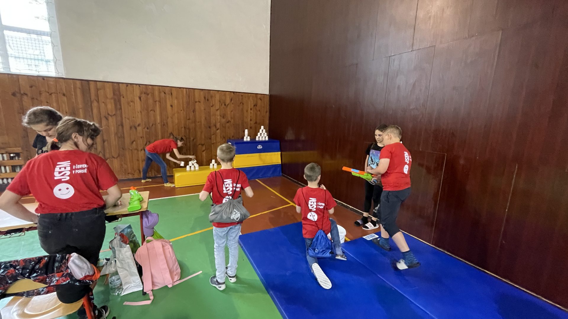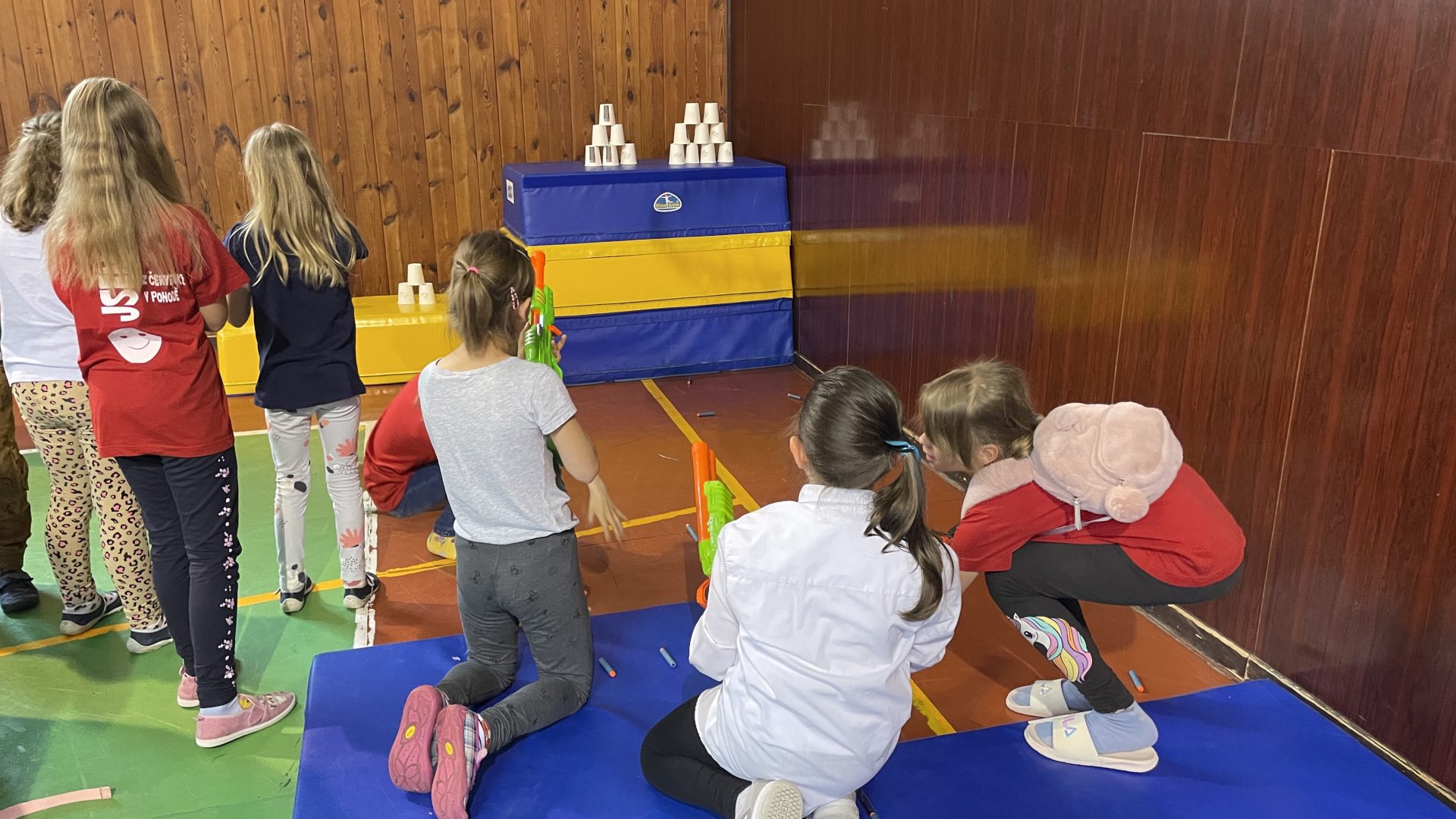 Na Den dětí nám zrušili hodinu, jinak bychom nestihli oběd. Ve 14:00 hod. byl začátek. Kája a Matyáš prodávali ve stánku, Matěj, Terka a Dalča pomáhali rozdávat lístečky u vchodu. Zbytek třídy se střídal podle časů na našem stanovišti, kde byli Nerf pistole – střelba na cíl.“