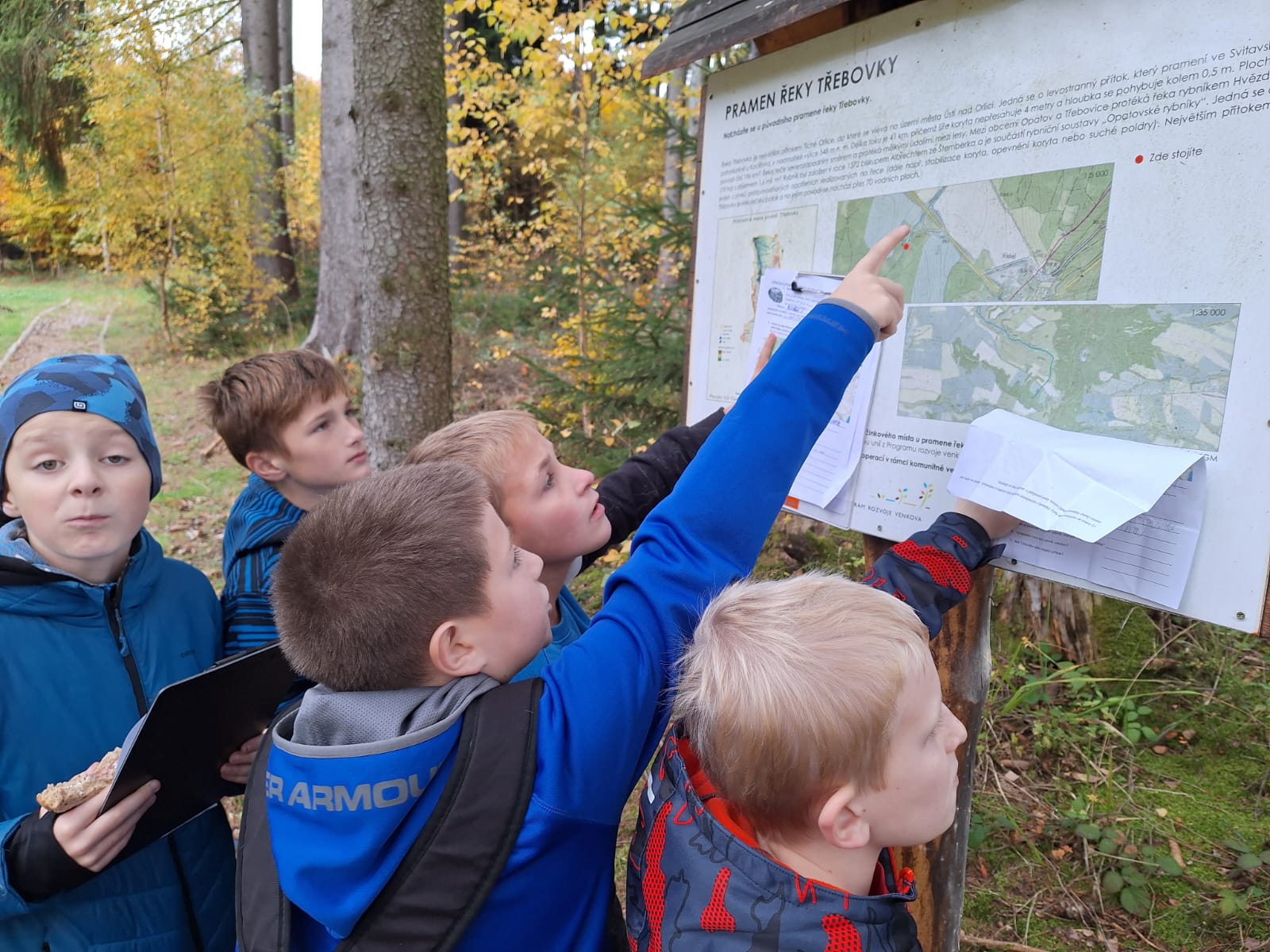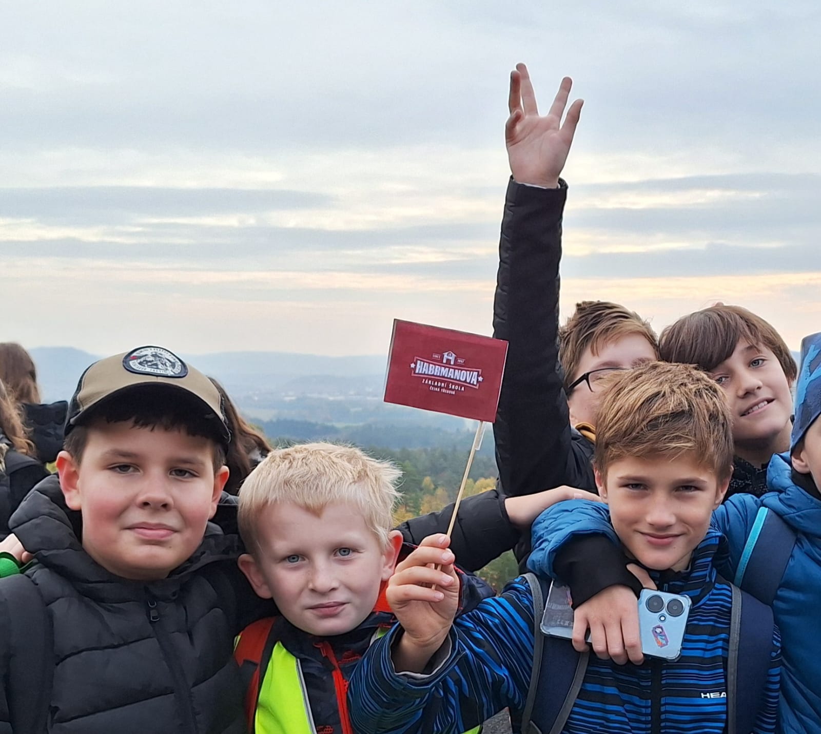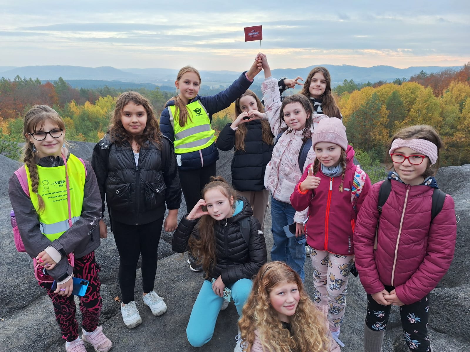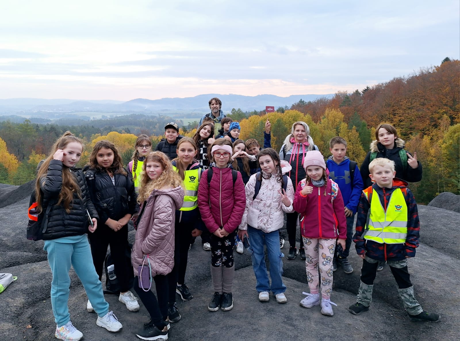 Jako američtí astronauti Neil Armstrong a Edwin Aldrin si chvíli připadaly děti z 5.B a 5.C, když zdolávaly výstup do prostoru bývalých dolů na Hřebči. Jejich dobrodružství bylo součástí exkurze po Hřebečských důlních stezkách a k prameni Třebovky. Vedle seznámení se s pramenem řeky protékajícím našim městem a přírodním bohatstvím Hřebečovského lesa spolu s tamní historií důlní těžby, byla pro mnohé největším zážitkem právě procházka Měsíční krajinou s krásným výhledem na Moravskou Třebovou. Na památku své výpravy zde páťáci zanechali vlaječku naší školy, se kterou se ještě před tím stihli vyfotit. V blízkosti pramene Třebovky zbyla i krátká chvilka na pouštění draků nebo stavění lesních domečků.