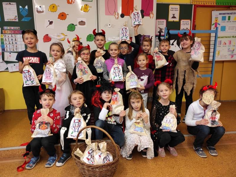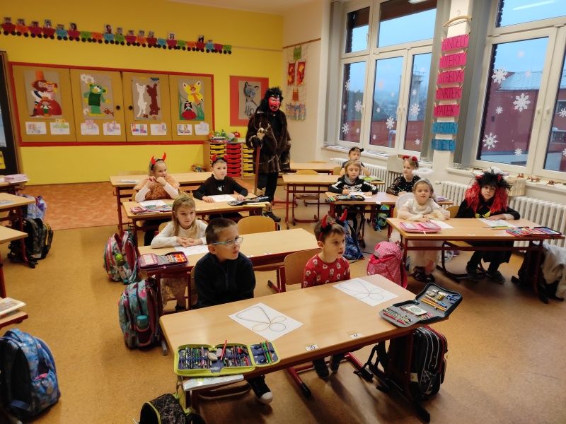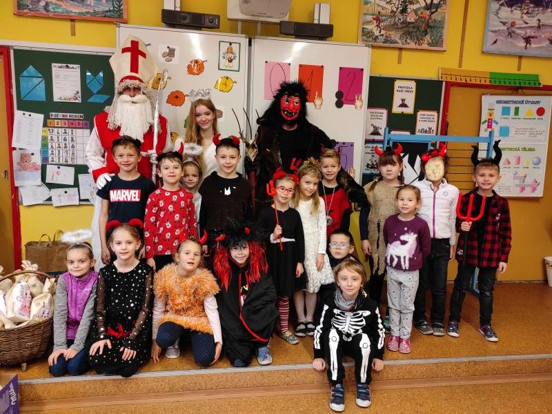 V pondělí k nám zavítal Mikuláš, čert a anděl. Čert na nic nečekal a hned se vydal mezi děti, aby zjistil, koho si dnes odnese. Avšak Mikuláš začal číst z listiny hříchů a ujistil čerta i děti, že v naší třídě nejsou žádní velcí zlobivci. Občas se nějaké malinkaté prohřešení vyskytne, ale hned je napraveno dobrým skutkem, omluvou, pomocí druhému nebo úsměvem. Aby děti smazaly i ty nejmenší hříšky, společně zarecitovaly báseň. Mikuláš, čert i anděl byli v sedmém nebi. Za krásnou báseň a slib polepšení dostaly děti nadílku.