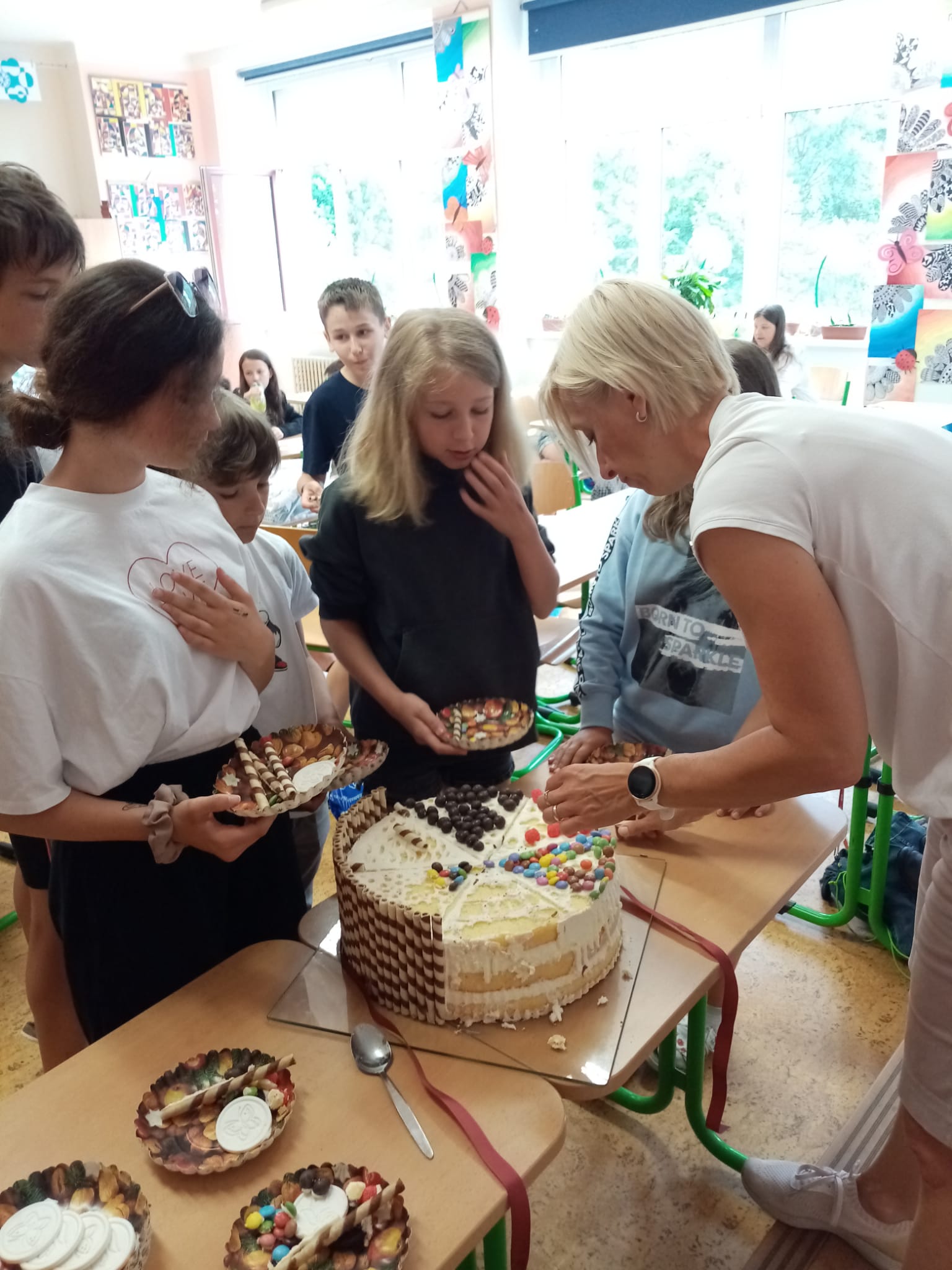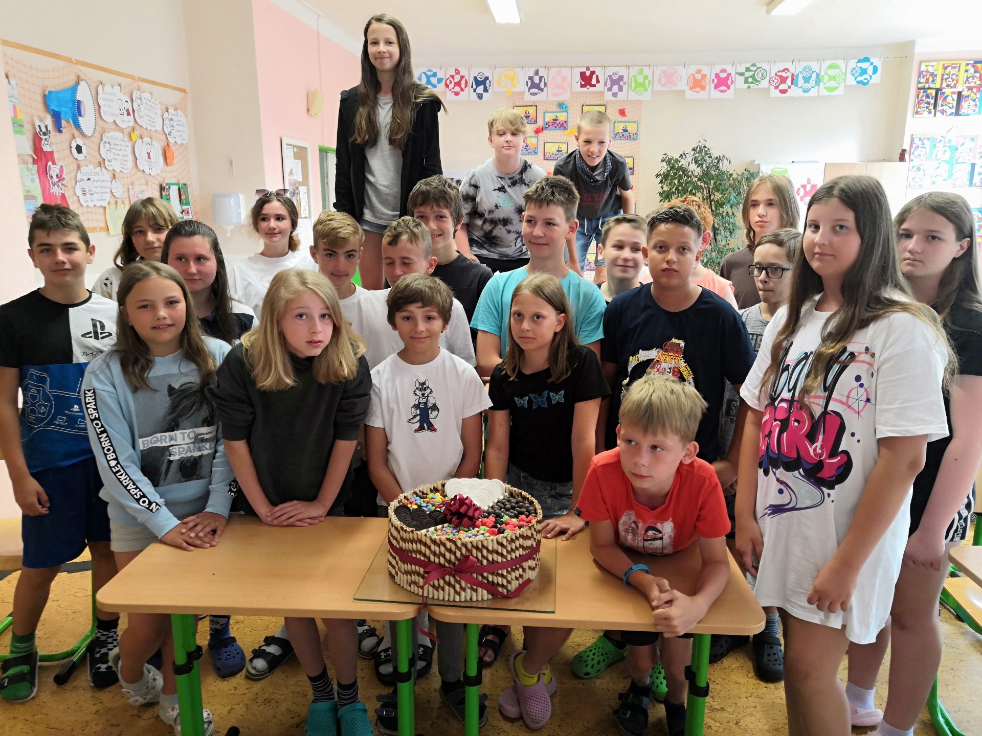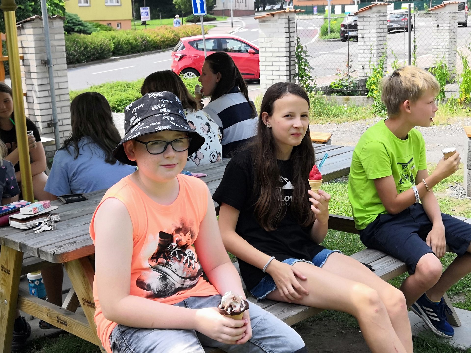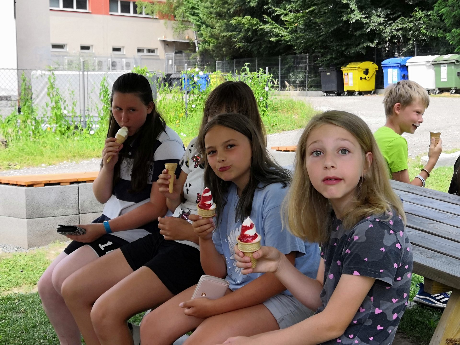 Konec školního roku jsme si zpříjemnili nejdříve zmrzlinou a nakonec krásným dortem od paní Kodytkové.
