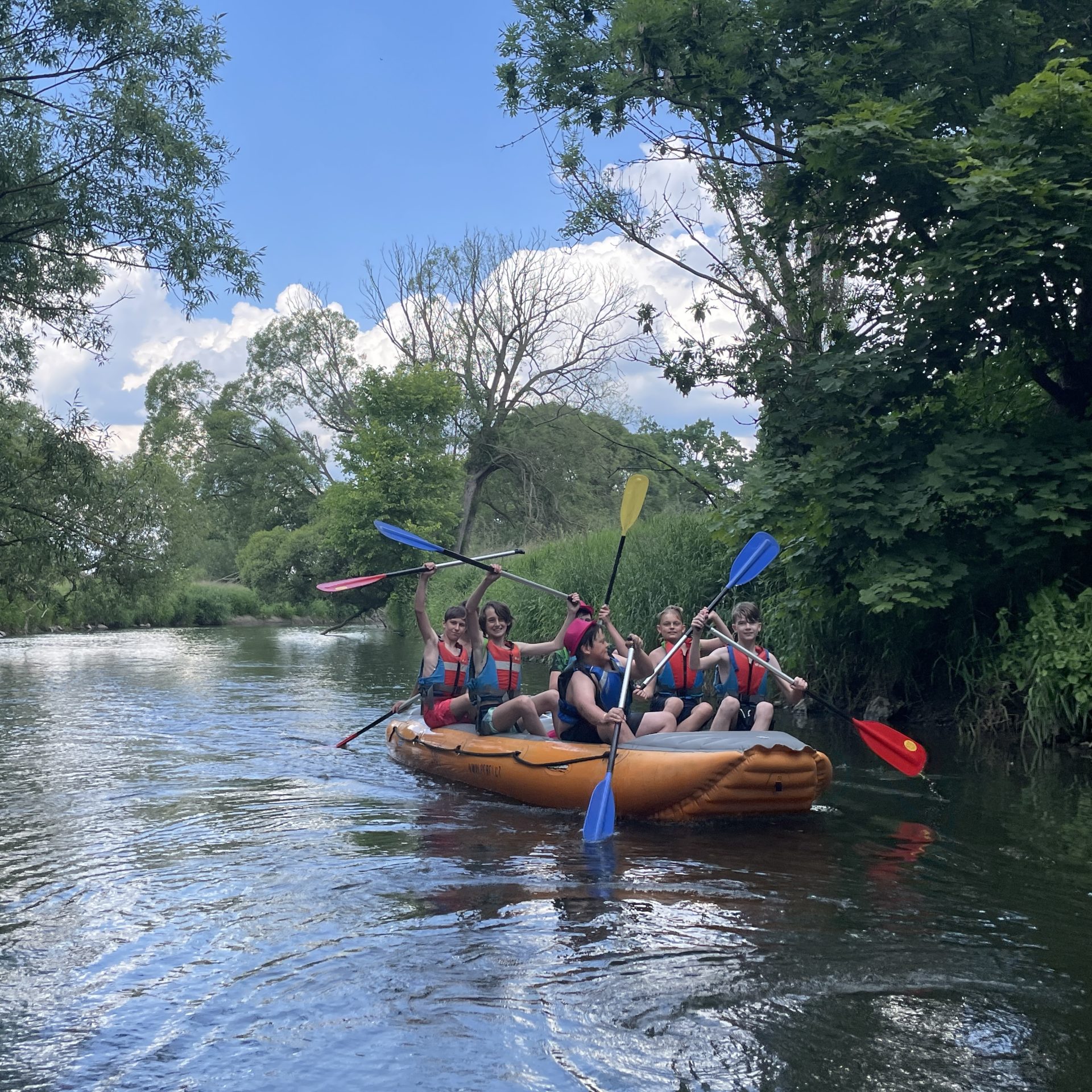 Dne 16.6.2023 jsme pádlovali na raftech po řece Moravě!! Po cestě vlakem a menší procházkou jsme dorazili na destinaci: Postřelmov! První polovina plavby trvala okolo 3h a dali jsme si oběd v baru Vila Háj. Nacházelo se tam hřiště, kde jsme převráceli houpací dřevěnou lodičku (bylo to mega zábavné). Poté jsme zase vypluli a po dalších 2h jsme dorazili na konečné místo: Tábor Moravičany. Tam jsme si zakoupili večeři/zmrzlinu a užili si srandu a chvíli volna v přírodě. Výlet skončil cestou vlakem zpátky do České Třebové.