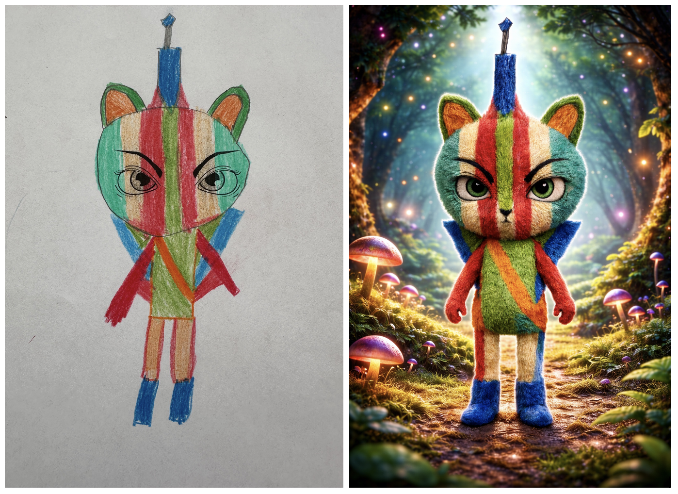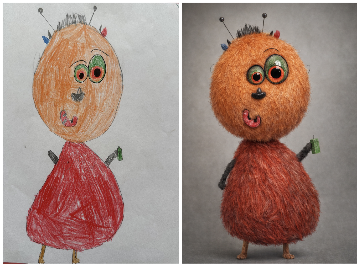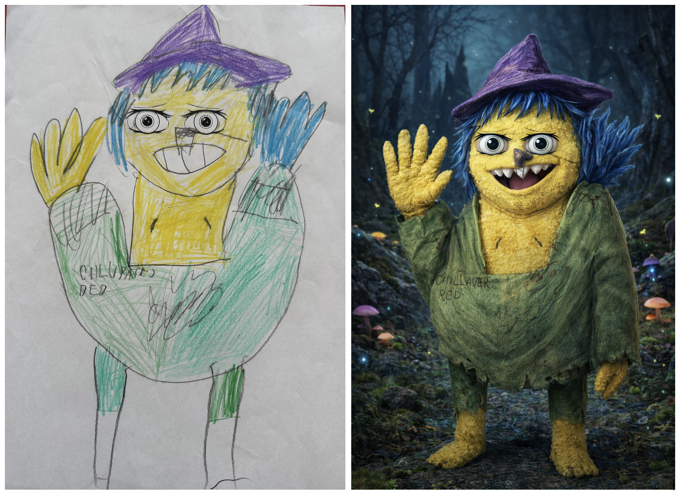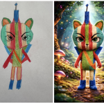Původně byla na papíře pouze různá očička. Každý domaloval postavičku, příšerku nebo cokoli, co ho napadlo k očím, které si vybral. Poté jsme se nechali inspirovat 2. stupněm a nechali obrázek oživit pomocí ChatuGPT. Zde je malá ukázka …
