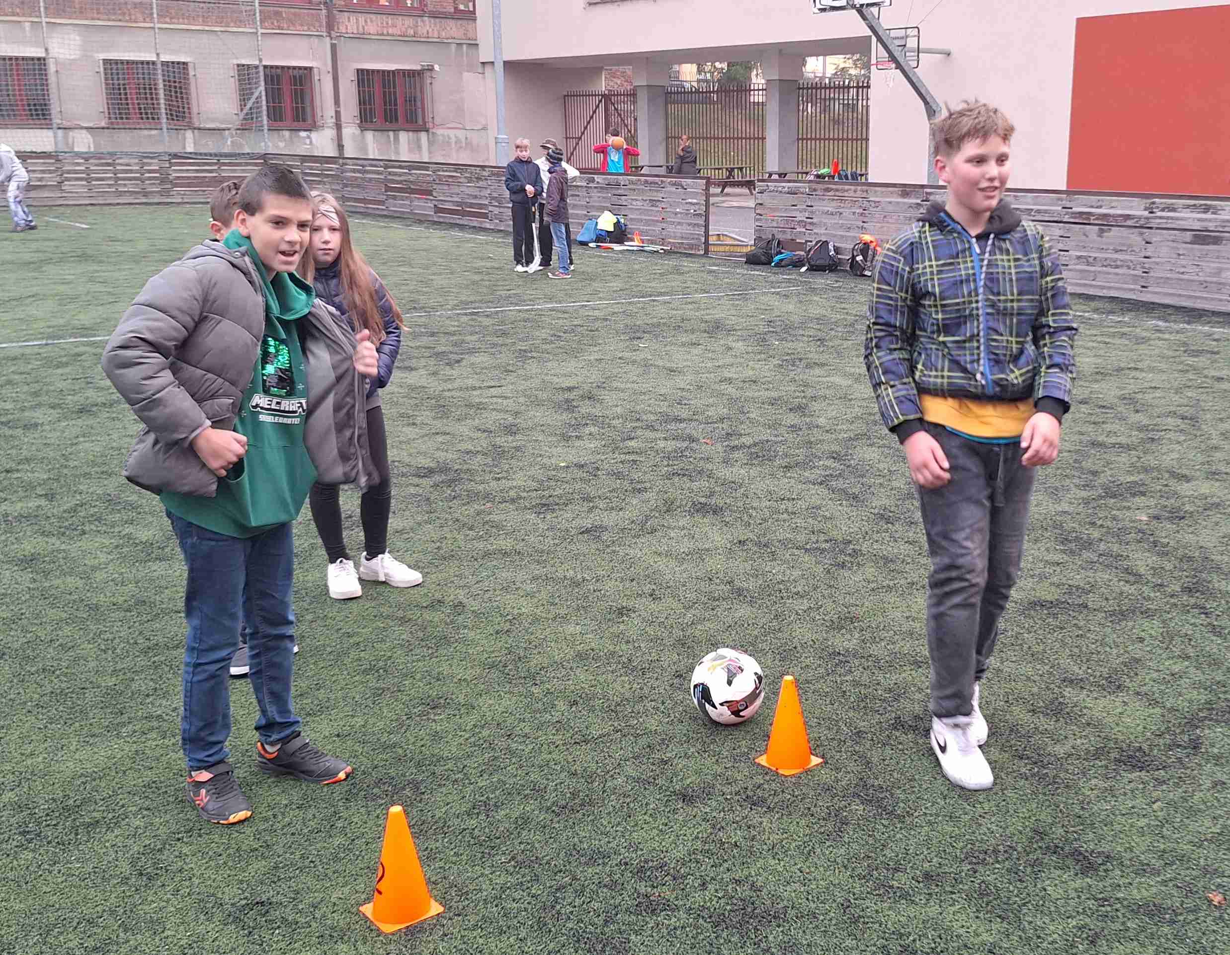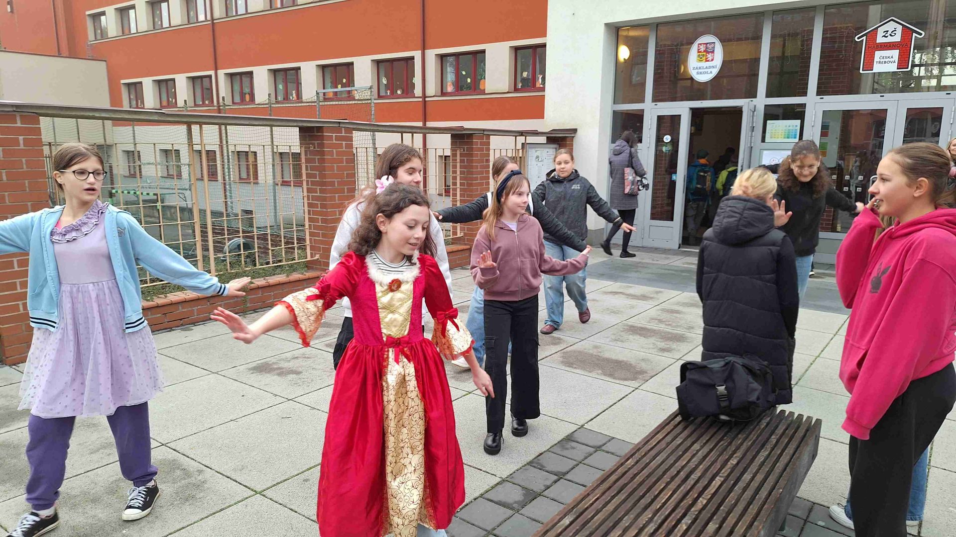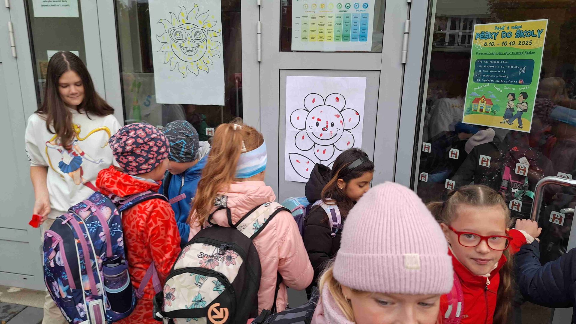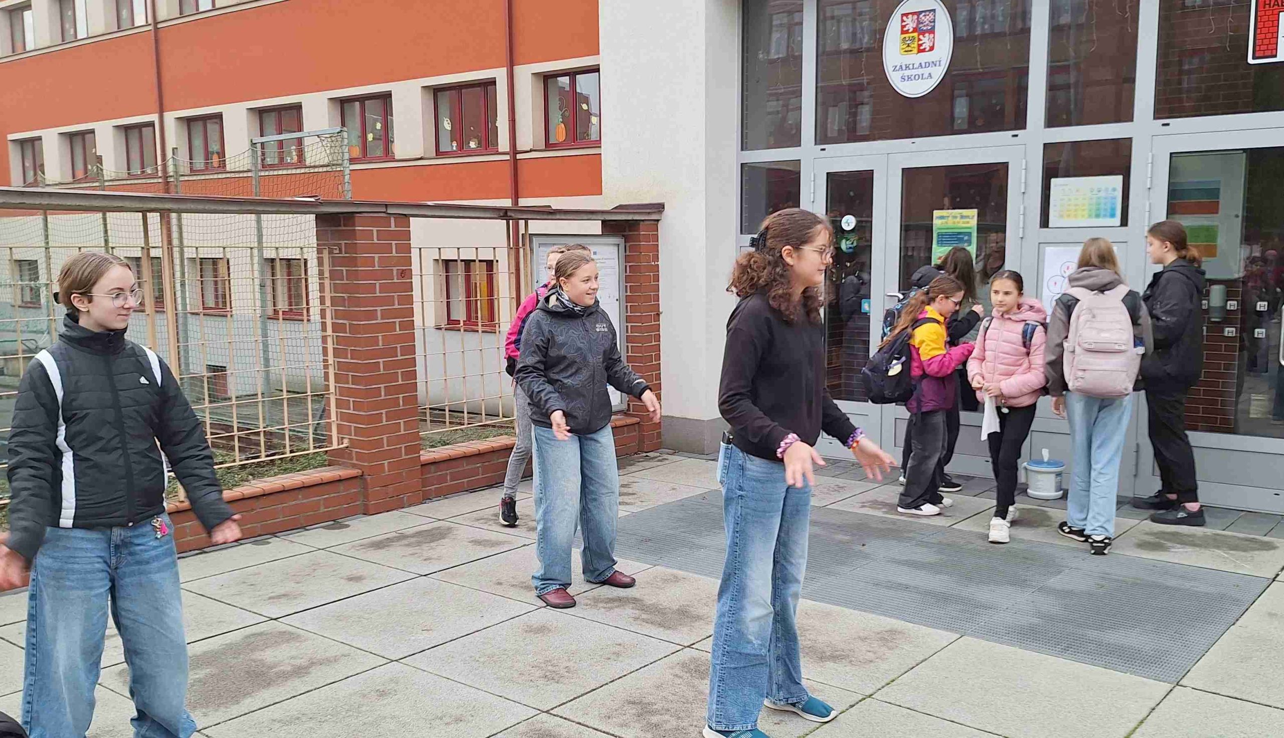 Dnešní program PĚŠKY DO ŠKOLY se odehrával hravně na školním hřišti, kde si pro všechny žáky školy připravila stanoviště třída 6.B. Opět jsme si mohli zopakovat tanečky s děvčaty ze 7. tříd.