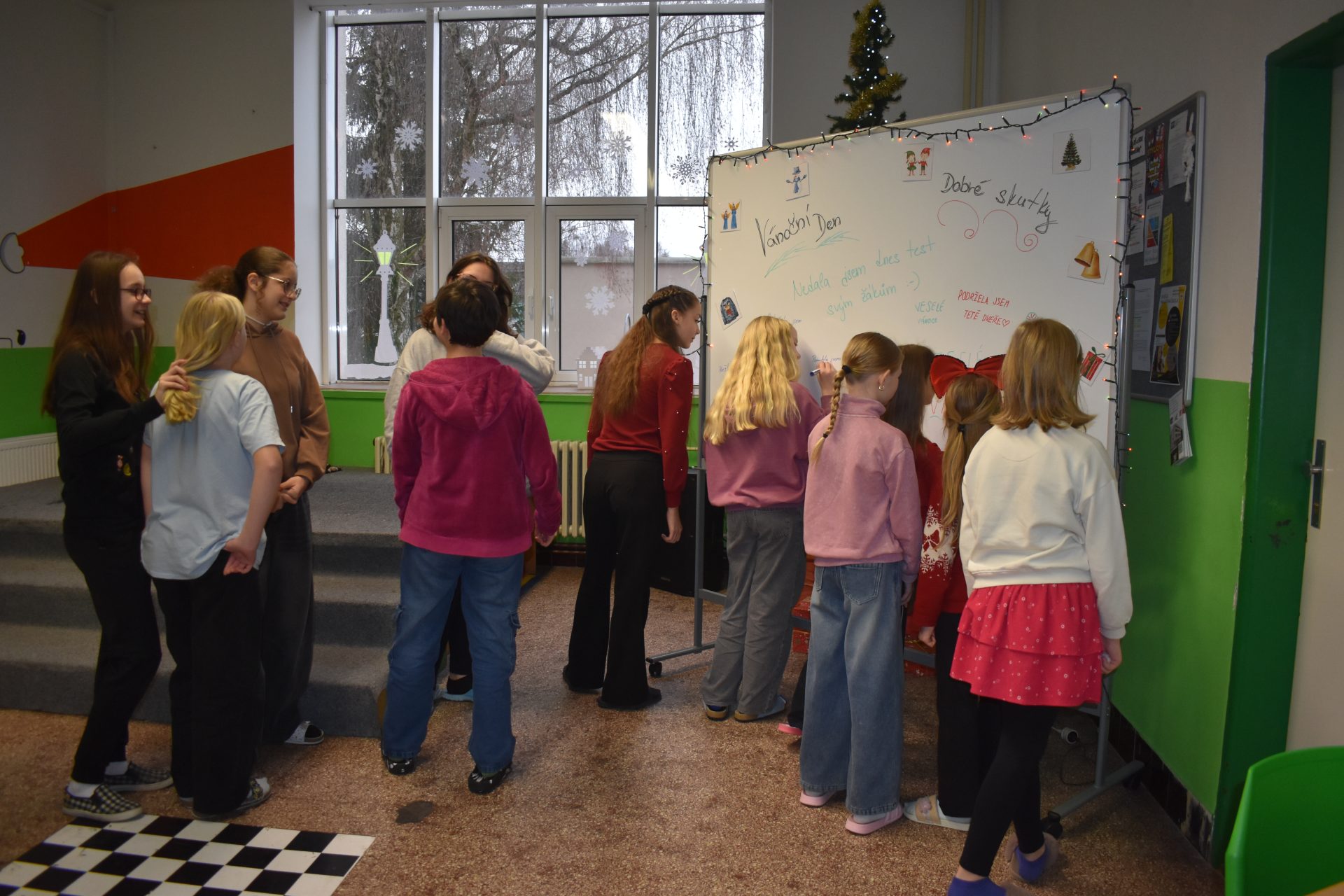 V úterý 16. 12. 2025 mohly děti přijít do školy oblečené do vánočních barev (zelená, červená, bílá) a doplnit svůj outfit vánočními doplňky.