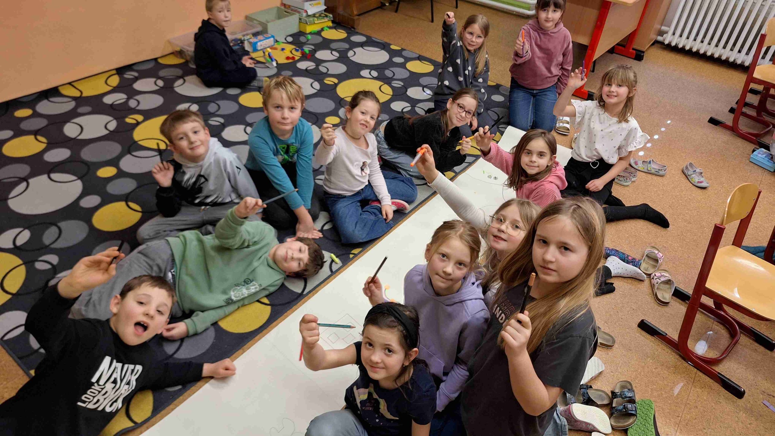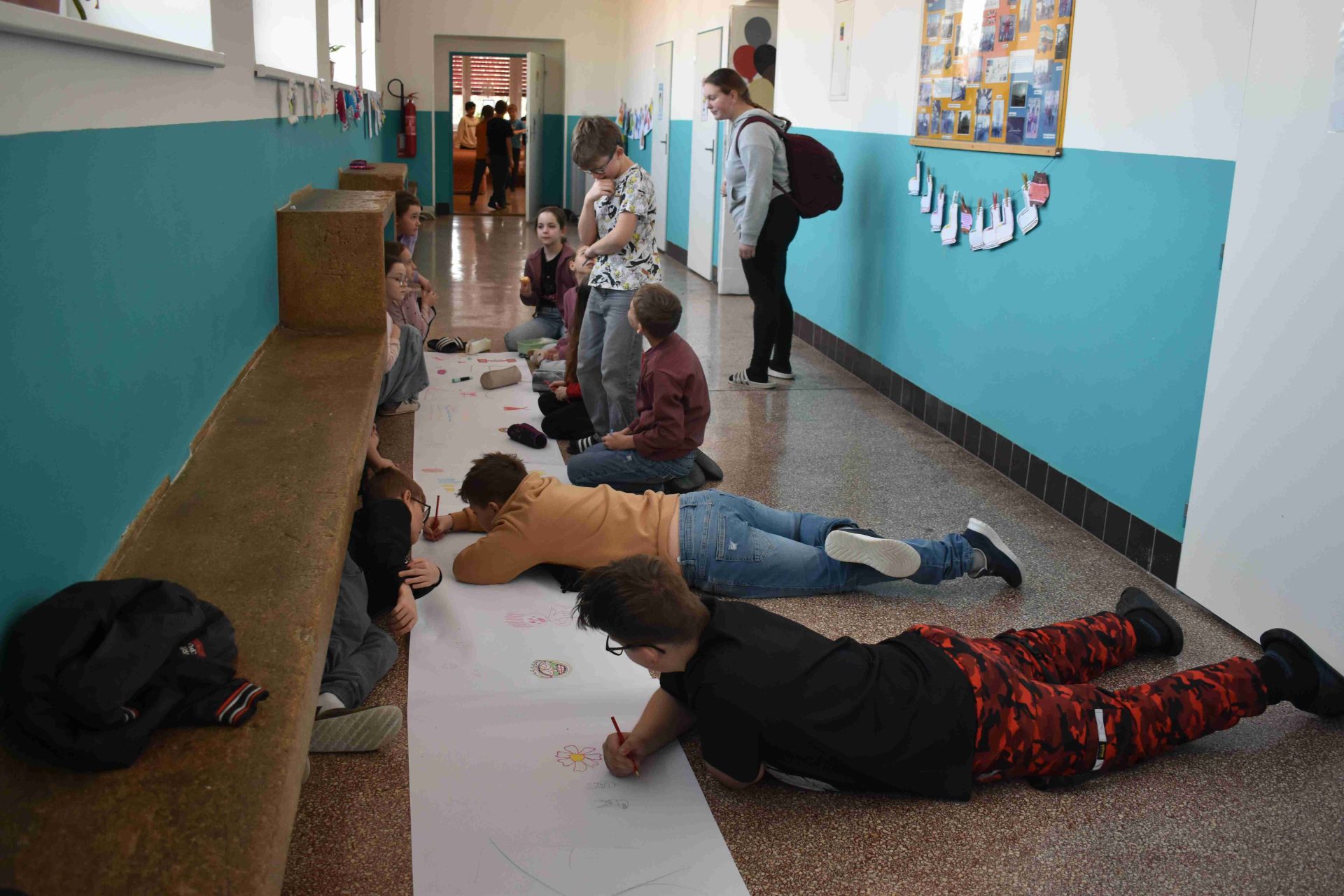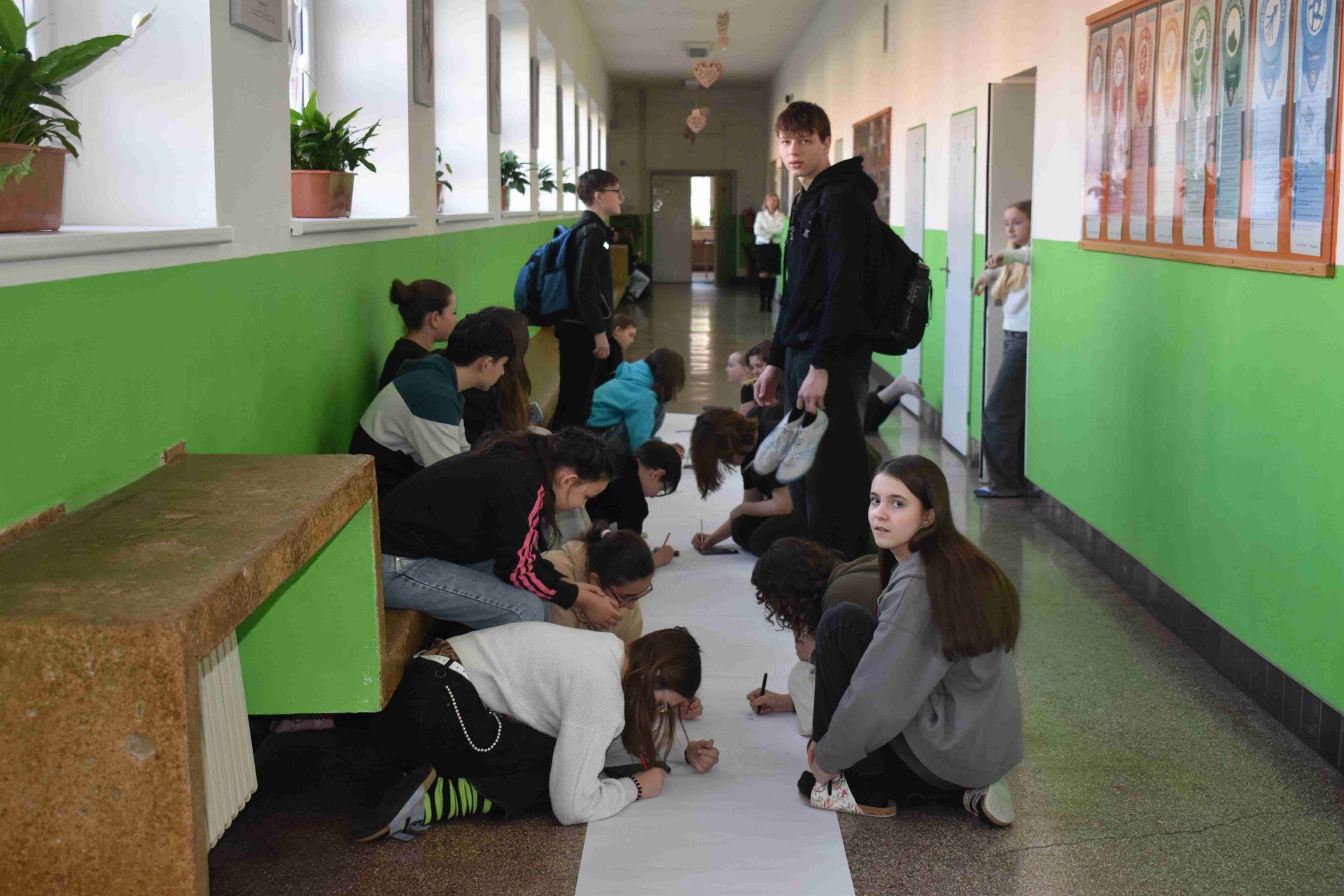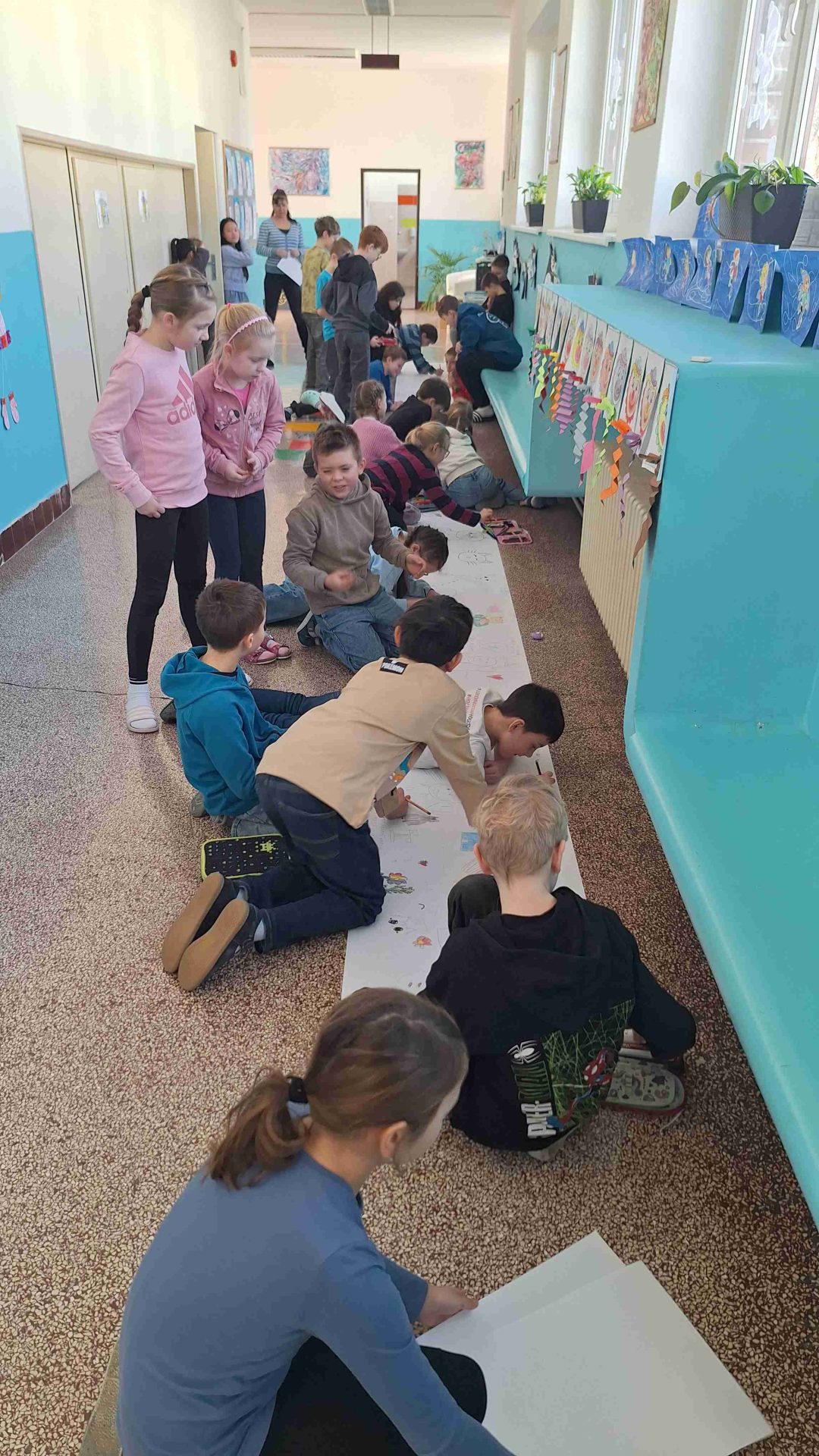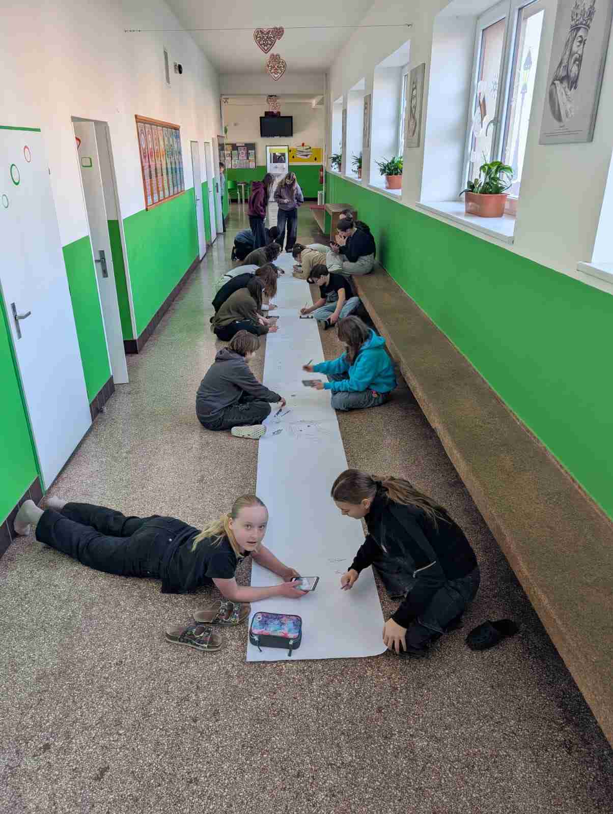 Čtvrtý den našeho projektu Týden pro Wellbeing se nesl v duchu kreativity a radosti z tvoření. Školní chodba se během přestávek proměnila v otevřený ateliér, kde mohli žáci 1. i 2. stupně společně kreslit na dlouhou papírovou roli.
