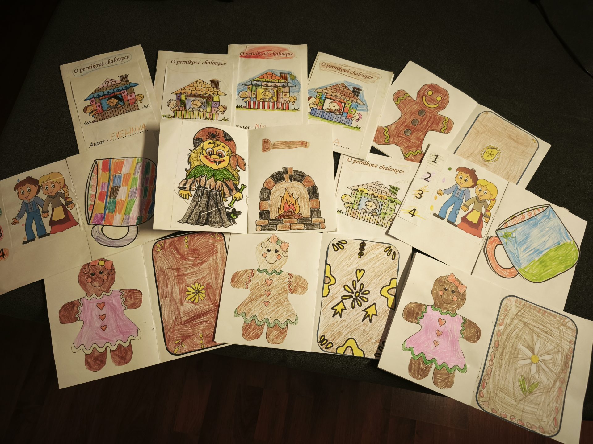 Perníková chaloupka – zhlédnutí a poslech pohádky, vlastní knížka – Jeníček a Mařenka (řazení obrázku podle číselné posloupnosti), skládání puzzle (ježibaba), pec s ohněm, malování lopaty a perníčků.