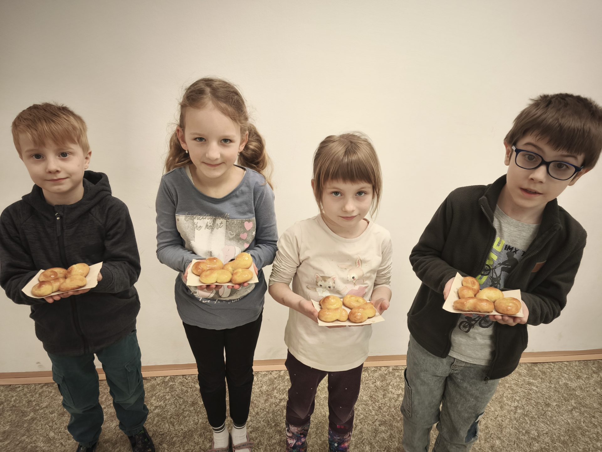 Na Zelený čtvrtek je zvykem podávat takzvané jidáše, což je sladké pečivo symbolizující provaz, na kterém se oběsil zrádce Jidáš. A tak jsme si je ve škole společně upekli. Moc nás to bavilo!!!