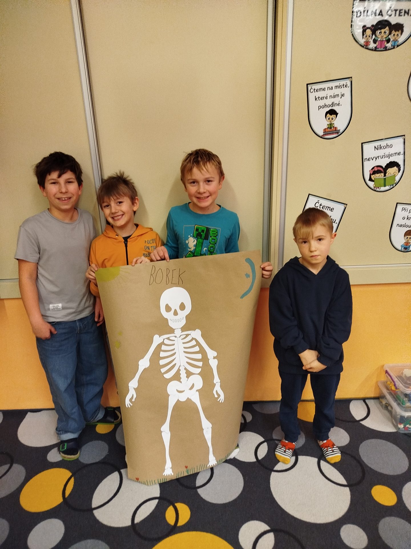 V předmětu Člověk a jeho svět objevujeme vše o lidském těle. Už víme, kde najdeme nejkratší a nejdelší kost, kolik kostí má kostra i spoustu dalších zajímavých informací. Ve skupinách s velkým nasazením skládáme lidskou kostru, kterou si pojmenujeme.