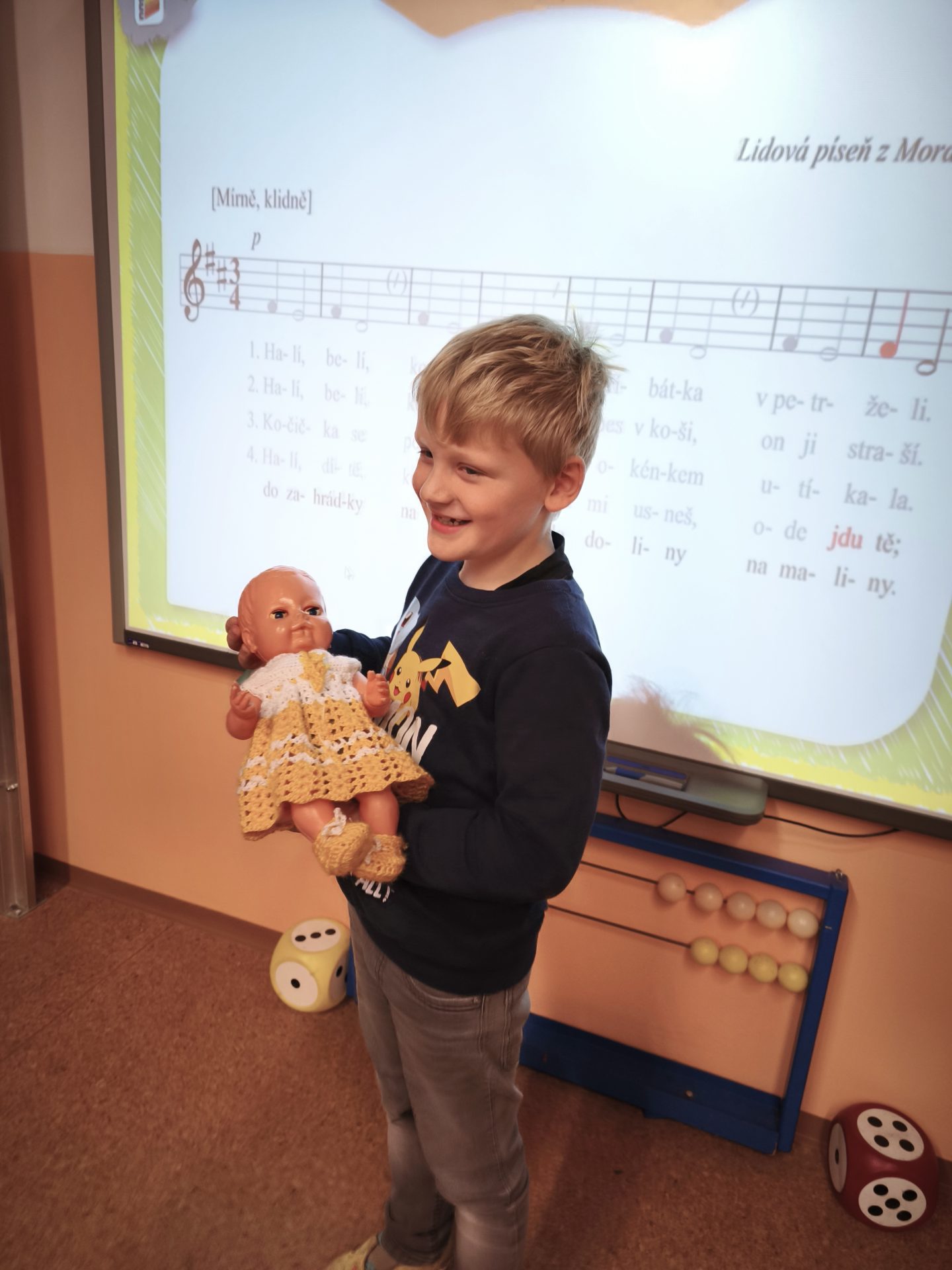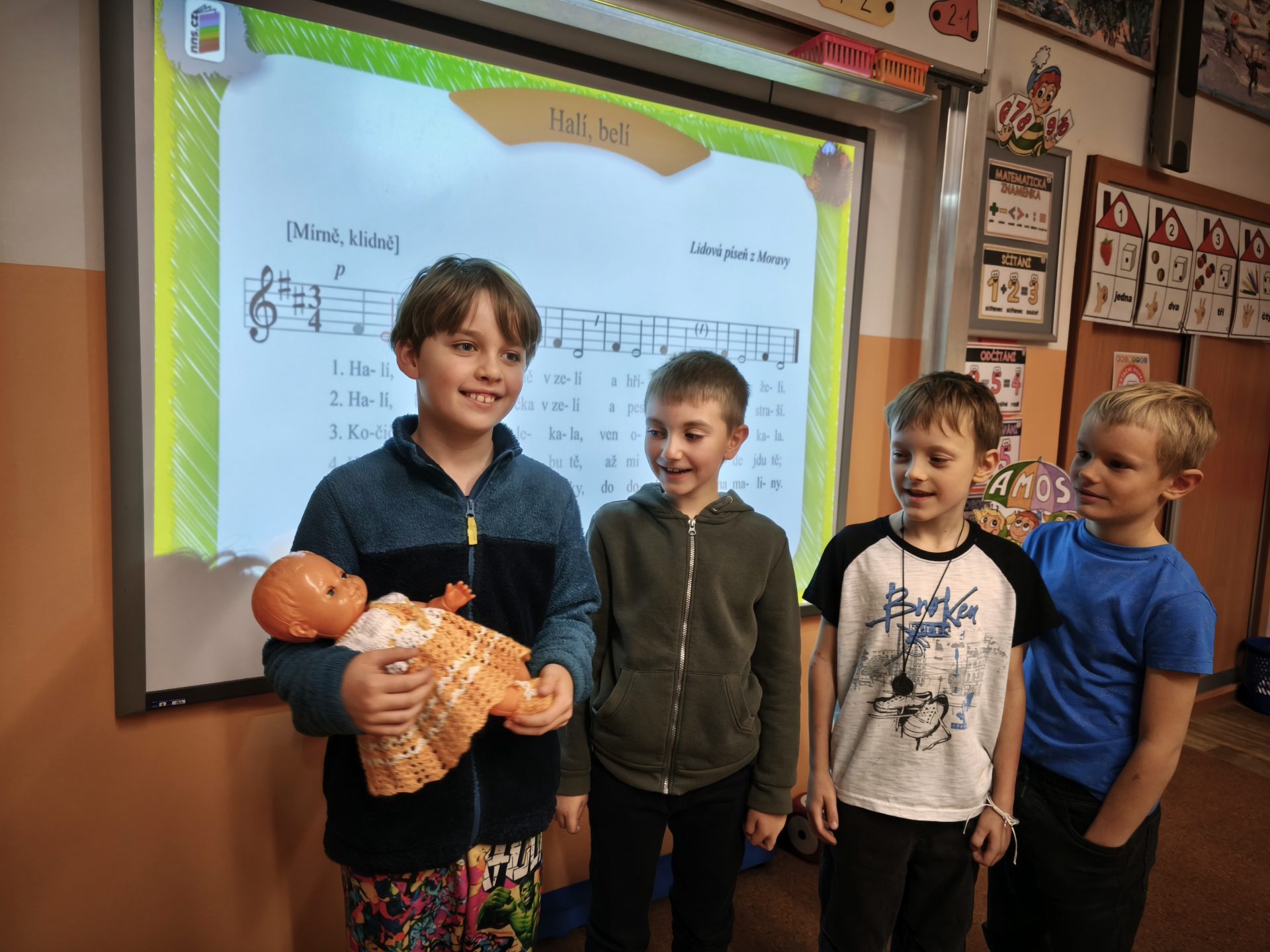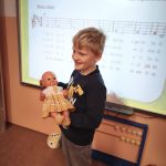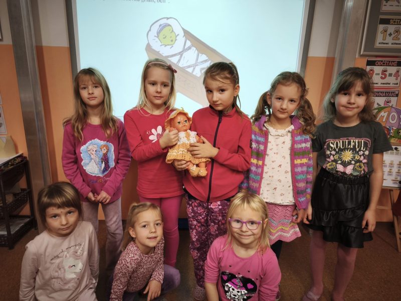 V listopadu jsme se v předmětu Člověk a jeho svět učili o rodině. Součástí bylo také téma – Starost rodiny o miminko. Využili jsme tedy mezipředmětové vztahy s hudební výchovou a vysvětlili si pojem ukolébavka. Jednu ukolébavku jsme se naučili a zazpívali ji našemu miminku (Aničce) ve třídě. Následovala výroba vlastního miminka a uložení do zavinovačky.