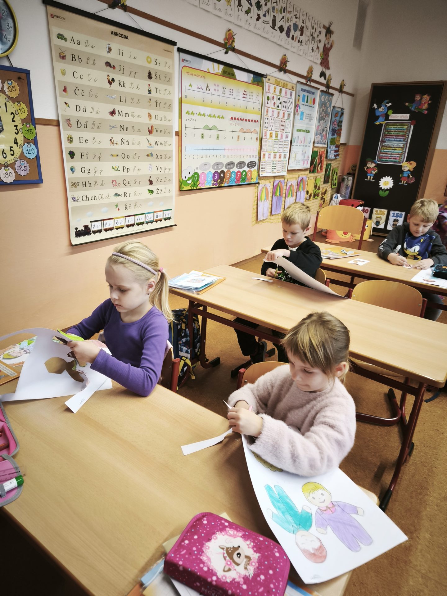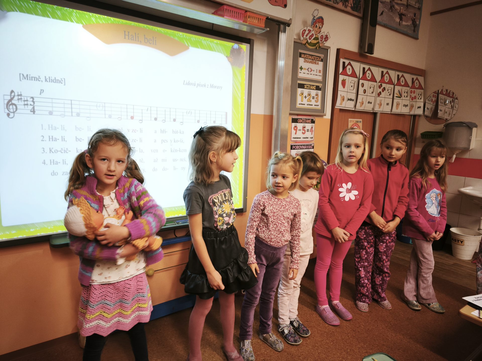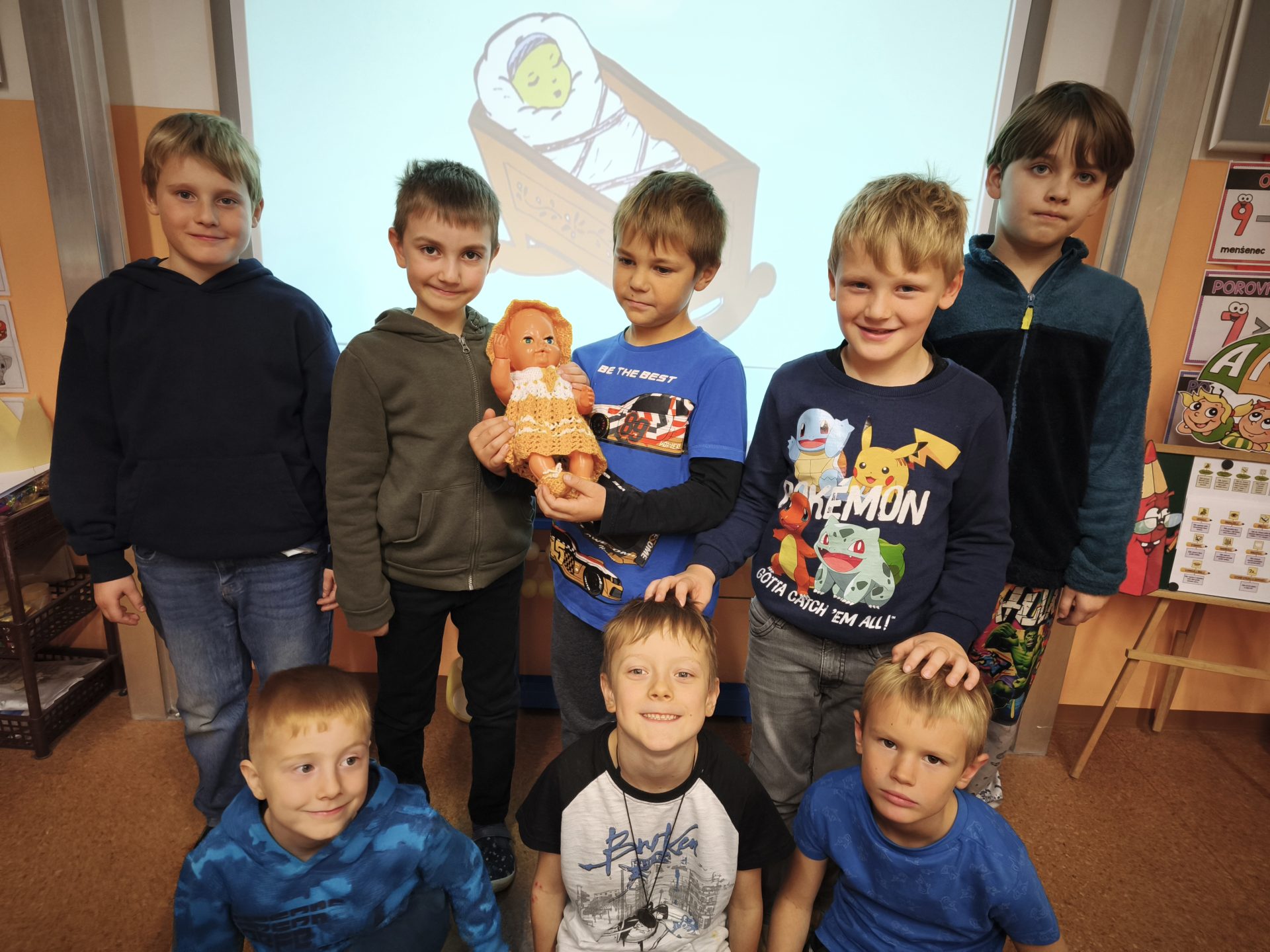V listopadu jsme se v předmětu Člověk a jeho svět učili o rodině. Součástí bylo také téma – Starost rodiny o miminko. Využili jsme tedy mezipředmětové vztahy s hudební výchovou a vysvětlili si pojem ukolébavka. Jednu ukolébavku jsme se naučili a zazpívali ji našemu miminku (Aničce) ve třídě. Následovala výroba vlastního miminka a uložení do zavinovačky.