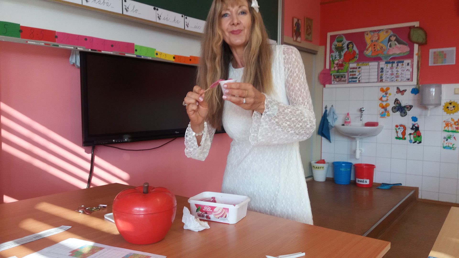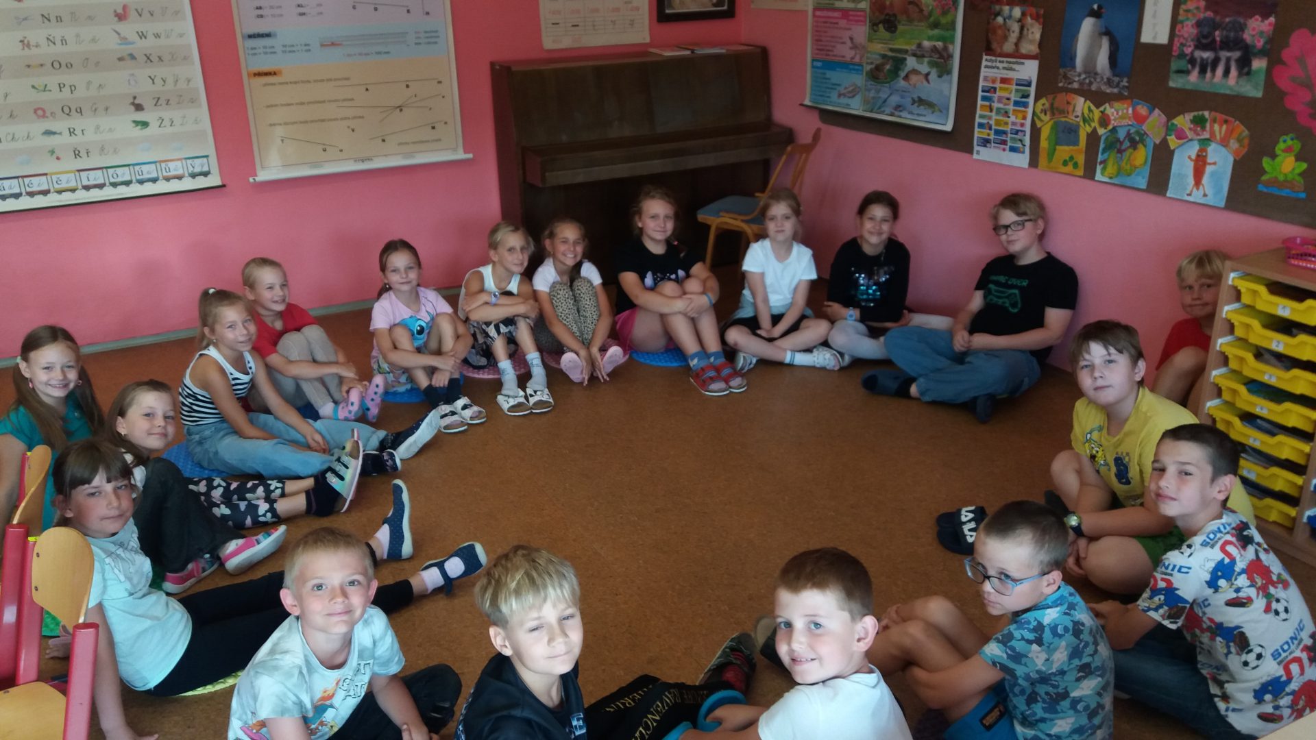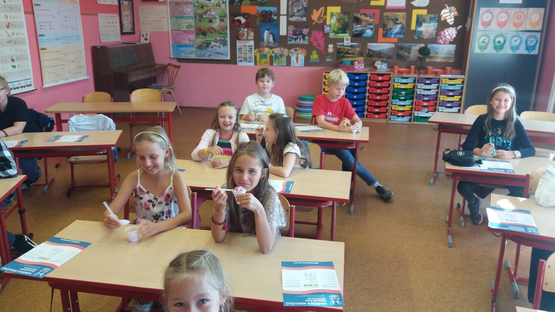 zdravíme vás po prázdninách s veselou náladou. Všichni jsme se do školy už těšili. Jsme zvědaví, co nás v tomto roce čeká. První den byl krátký a sladký jako v cukrárně – zmrzlina a sladkosti. Druhý den jsme si uklidili do zásuvek učebnice a podepsané sešity. Třetí den jsme se opakovali učivo z 2. třídy a byli jsme šikovní. Zavzpomínali jsme na prázdniny a navštívili Staré náměstí jako loni. Světový den první pomoci a barevné odpady nás vždy velmi baví.