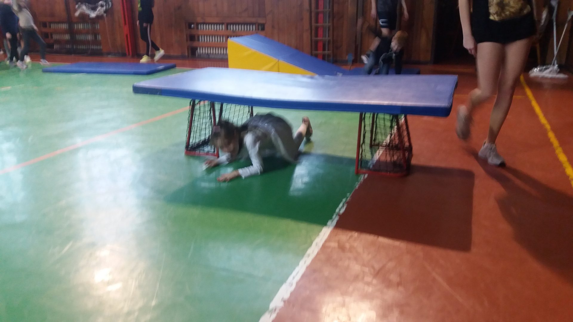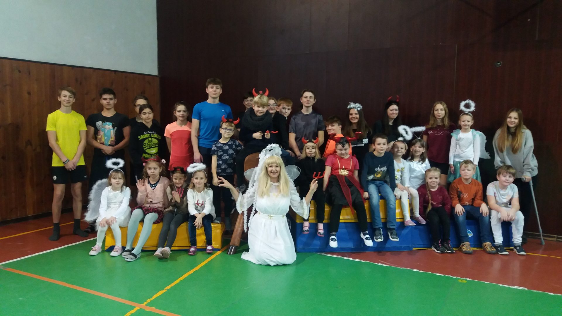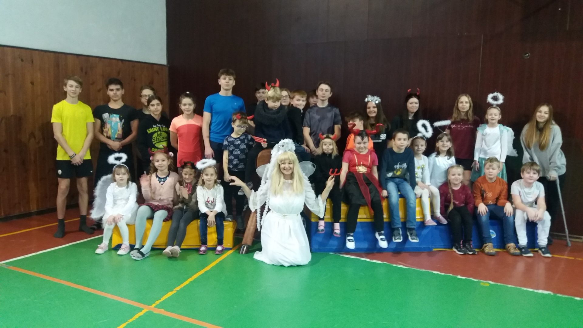 dnes jsme měli sportovní hodinu s 9.A a celé dopoledne nás učila Andělka. My jsme byli za andělíčky a čertíky. Byla to zábava. V tělocvičně jsme se staršími  kamarády překonávali čertovsky těžké překážky, Vše jsme skvěle zvládli a neublížili si. Užili jsme si hodně legrace. Andělka měla problém s křídly, které se jí zasekly u nářadí. Sportovat v maskách je opravdu náročné. Po sladké odměně jsem se rozloučili a těšíme se na další setkání třeba při vánoční besídce.