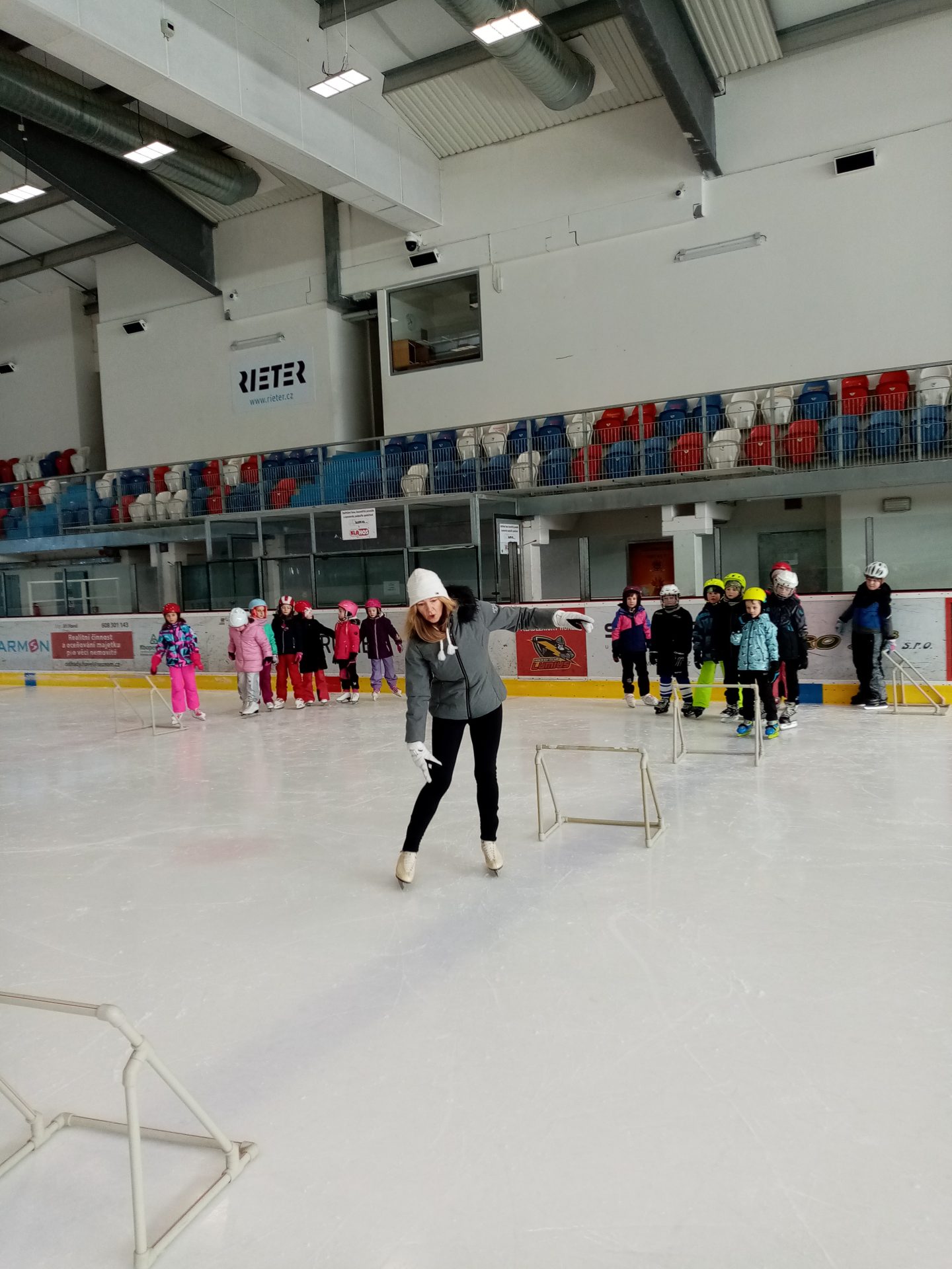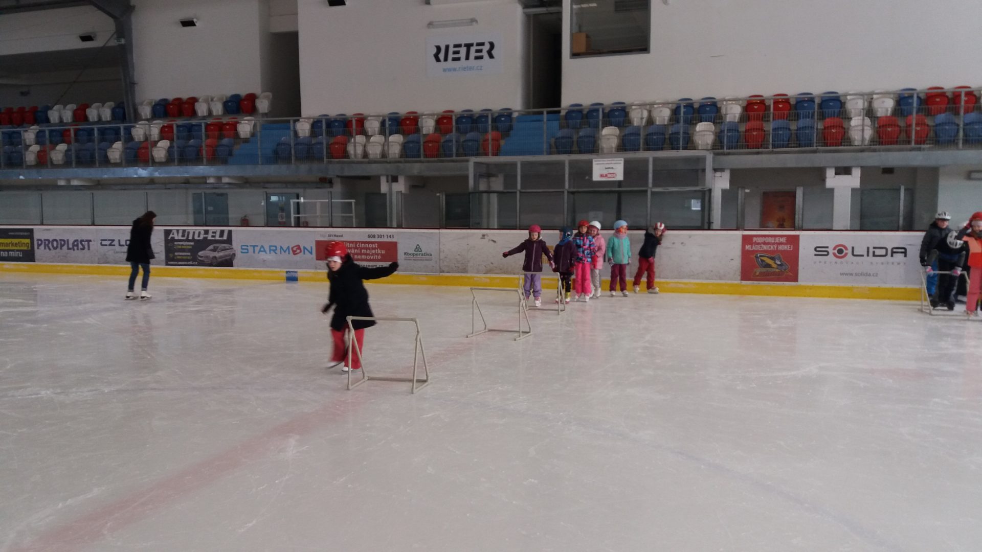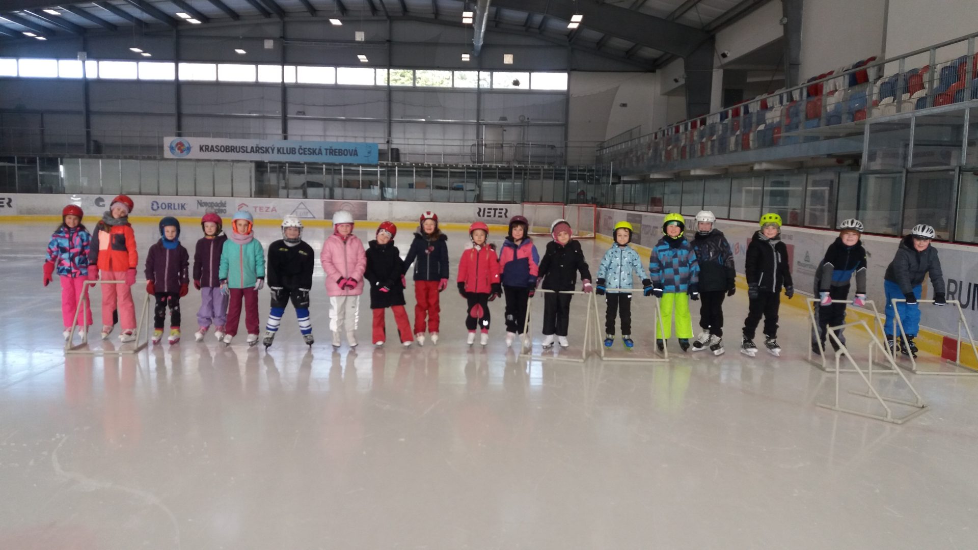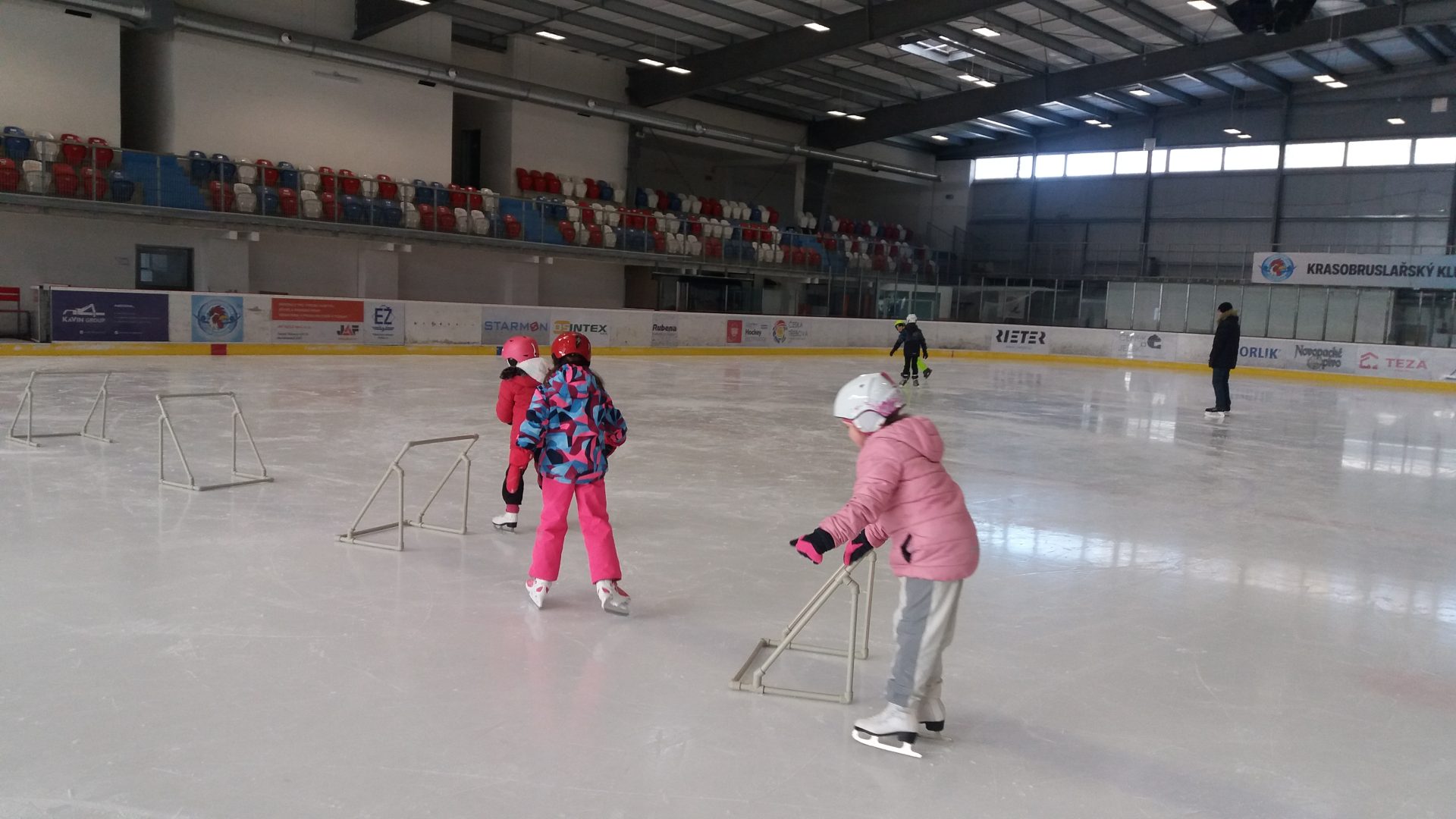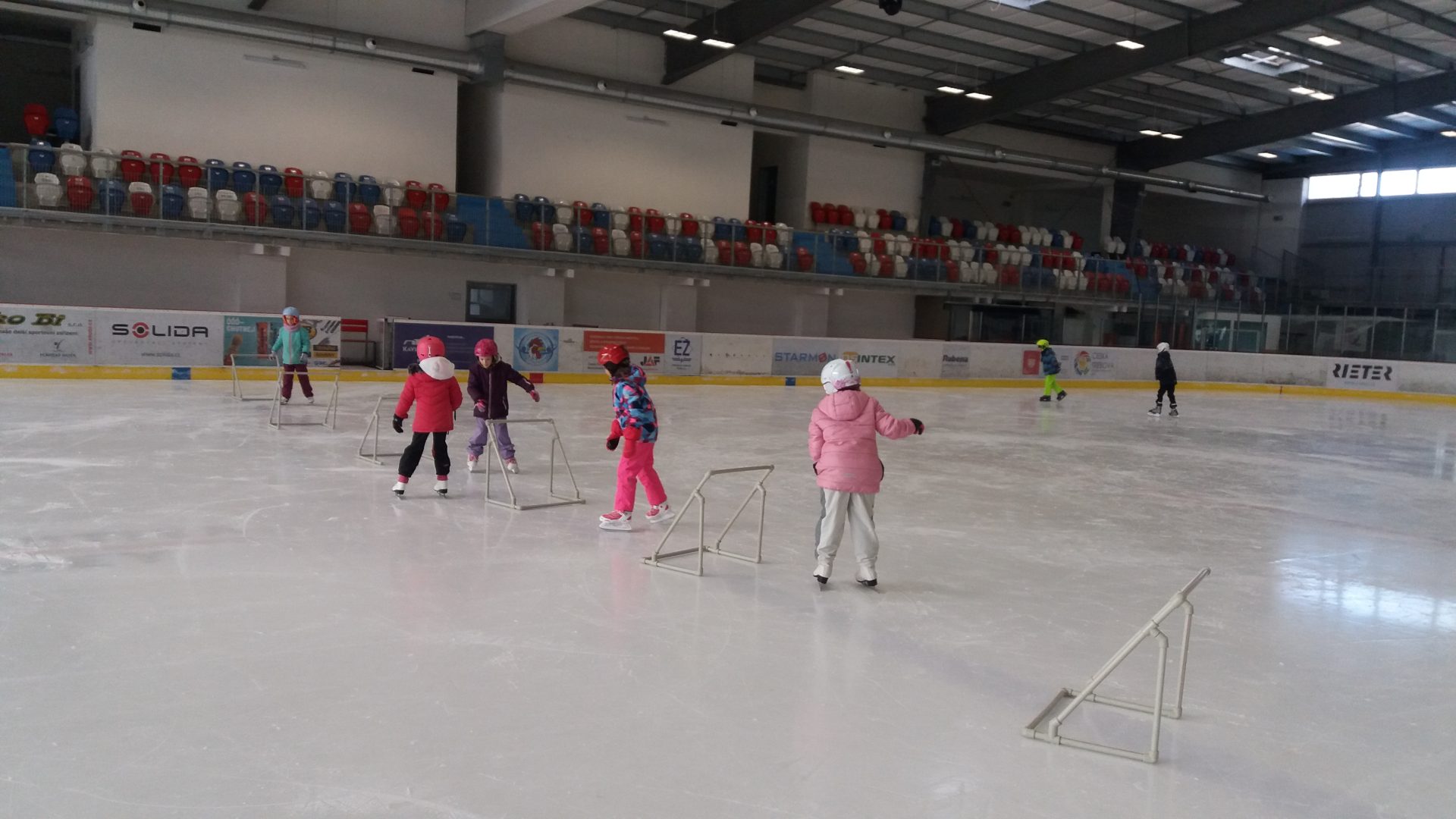 naposledy vás zdravíme z ledu. Už jezdíme rychle i pozadu. Zastavíme, zatočíme a nepadáme. Budeme se těšit na bruslení ve třetí třídě.
