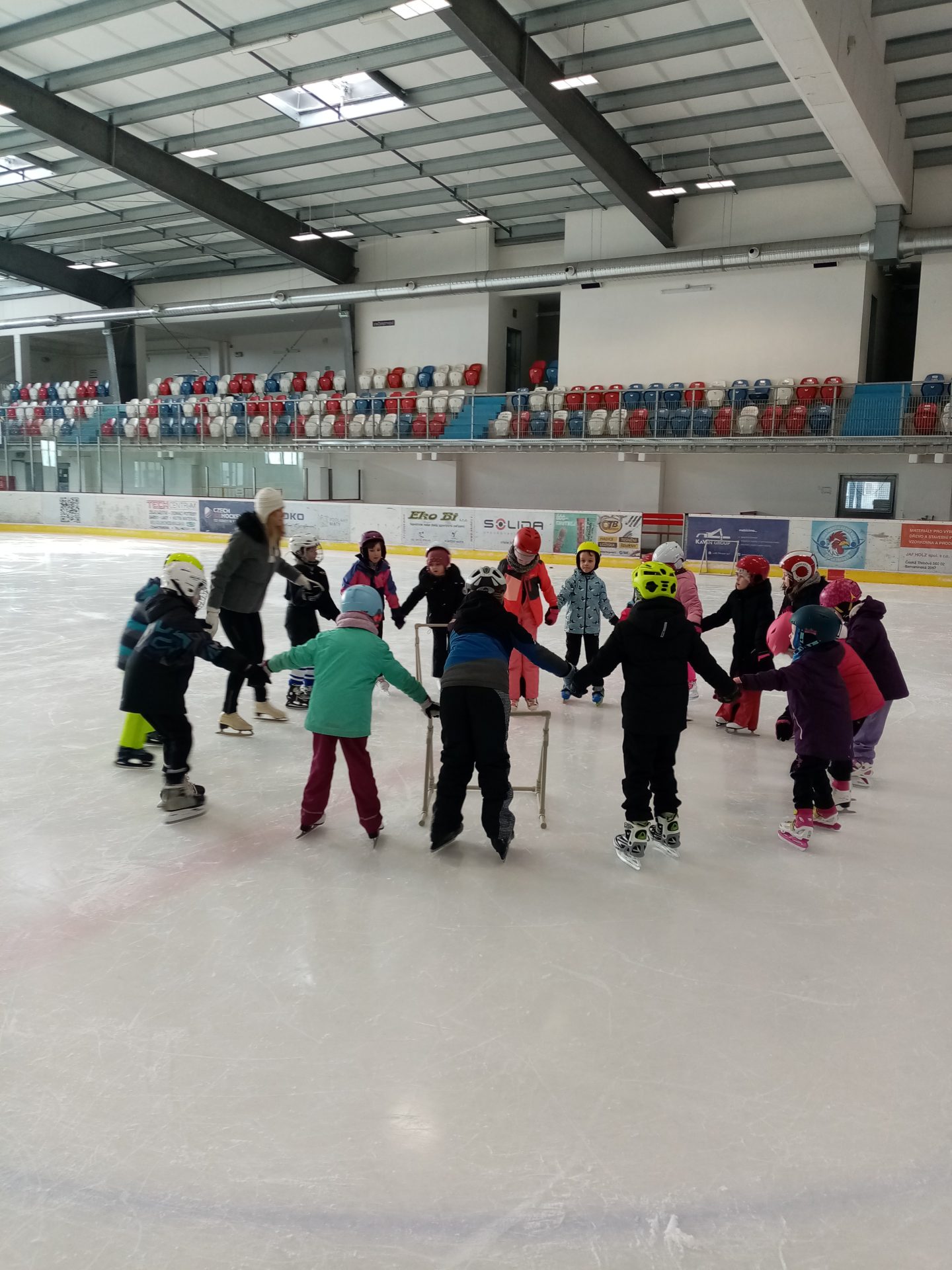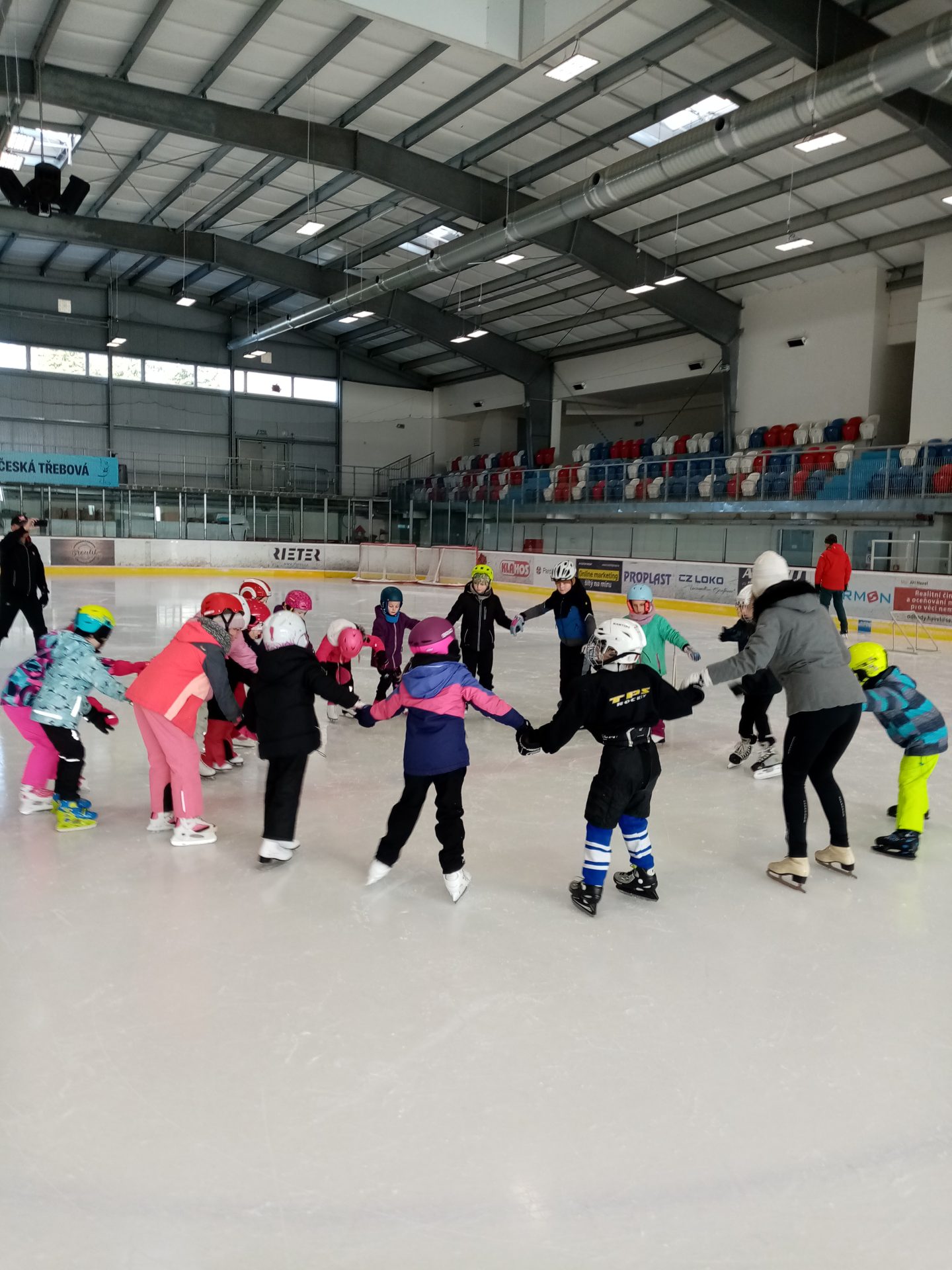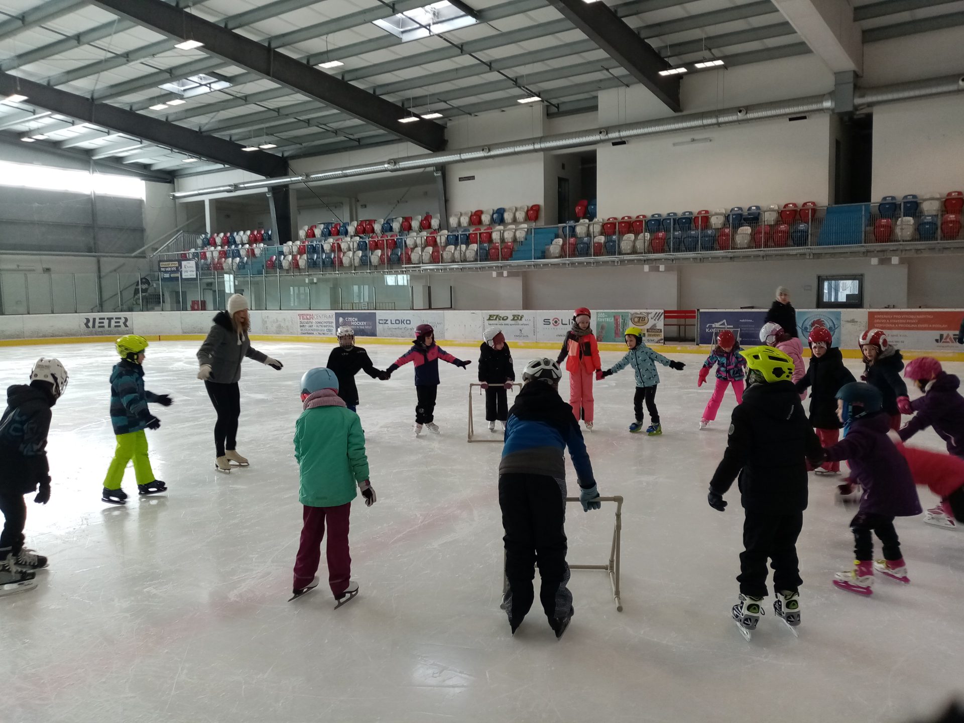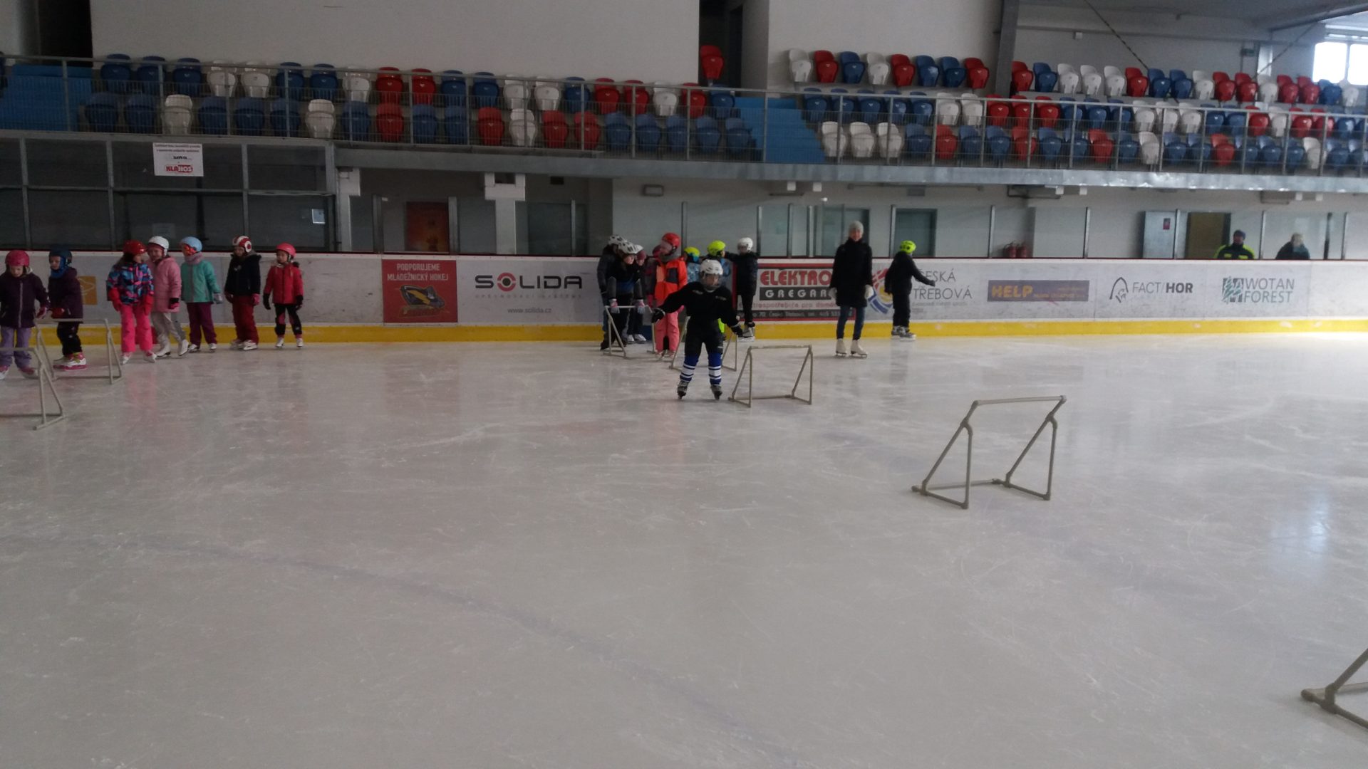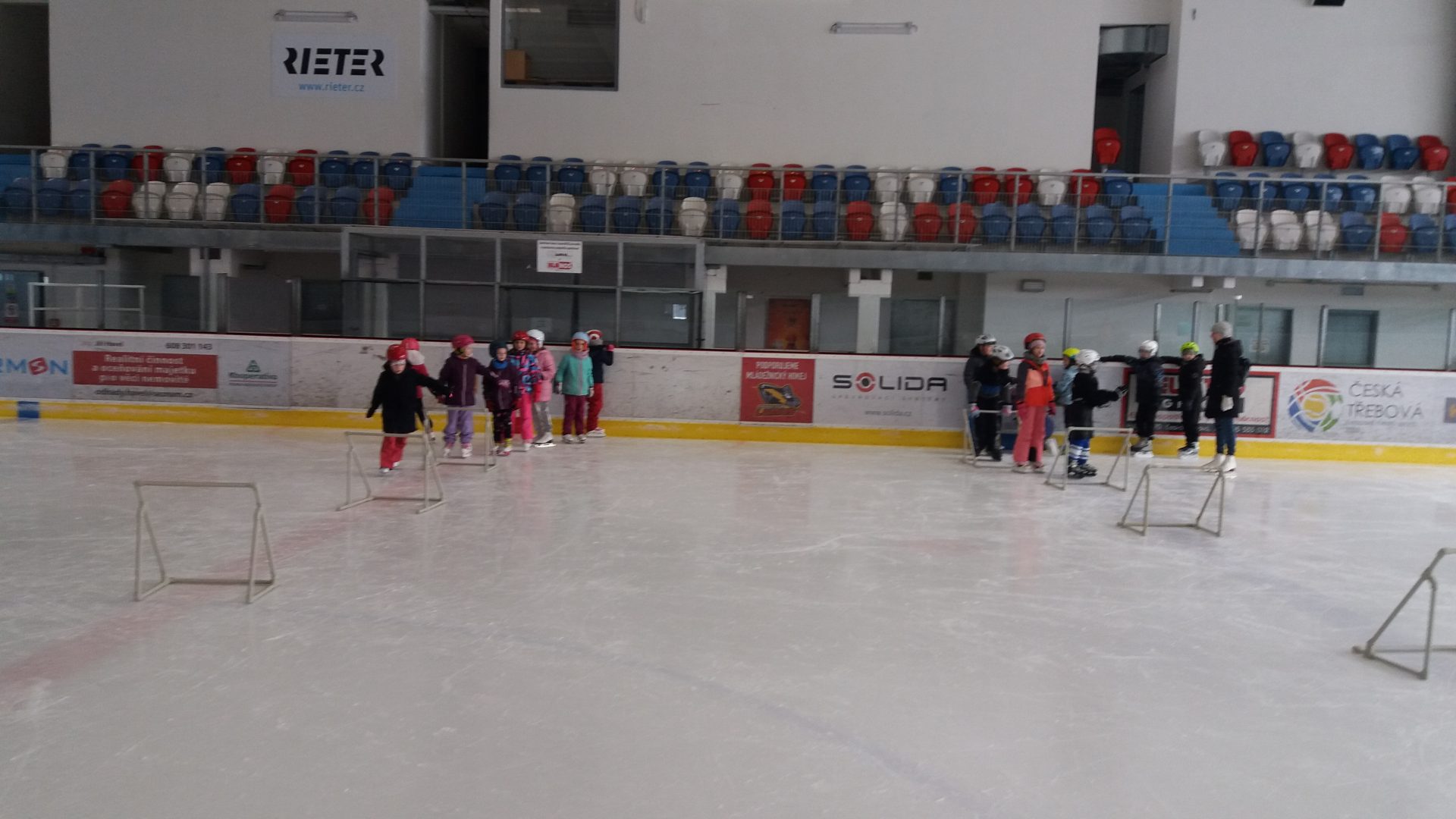 naposledy vás zdravíme z ledu. Už jezdíme rychle i pozadu. Zastavíme, zatočíme a nepadáme. Budeme se těšit na bruslení ve třetí třídě.