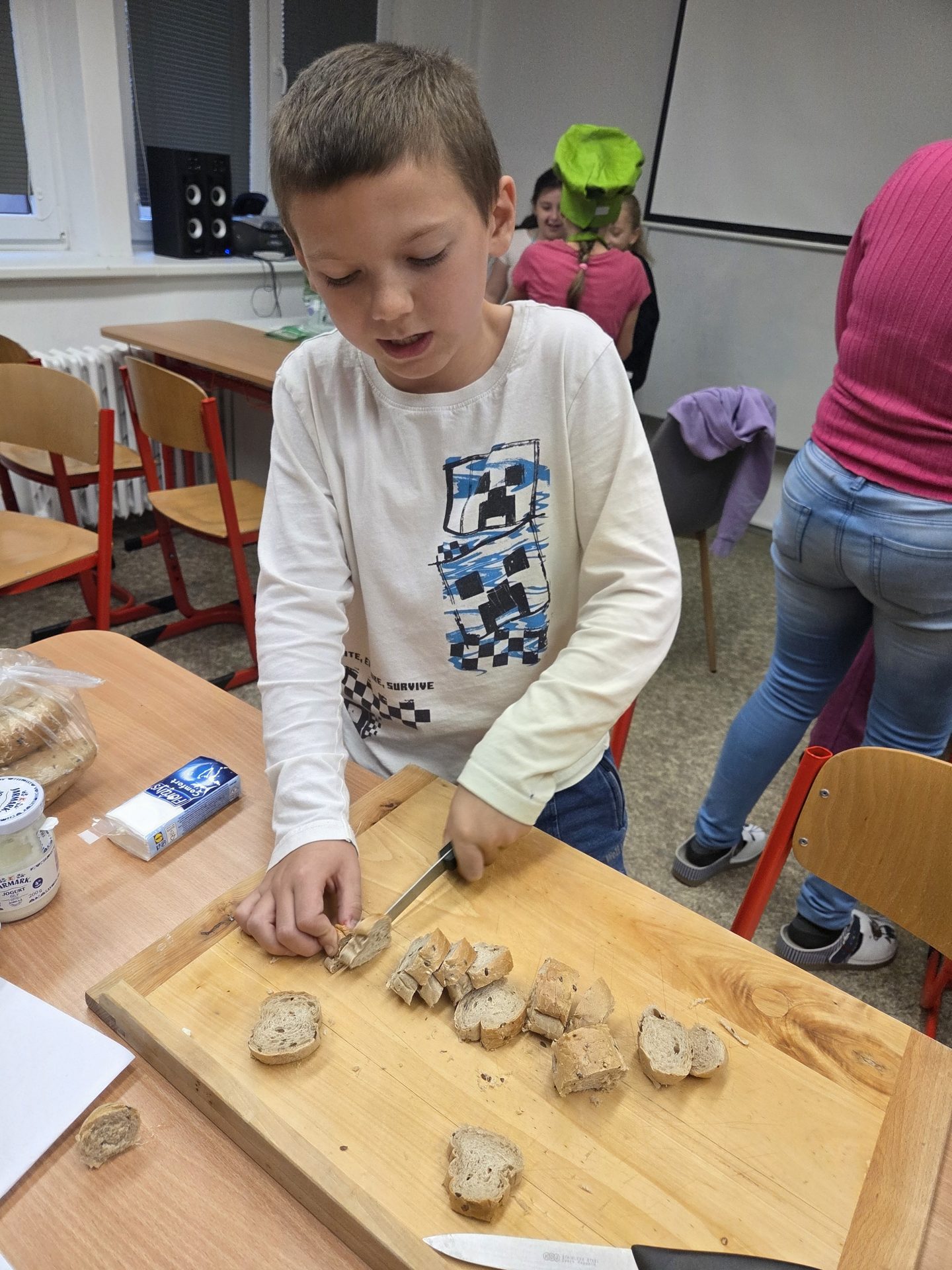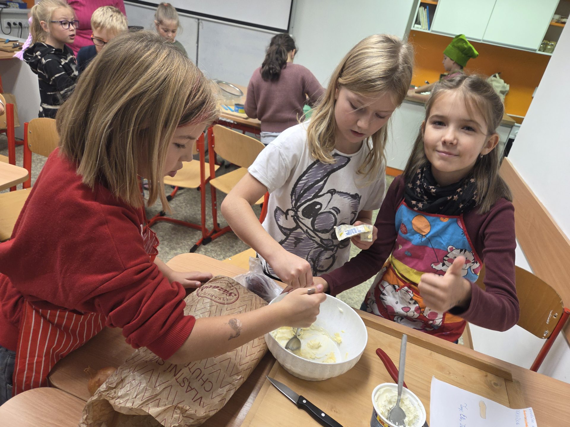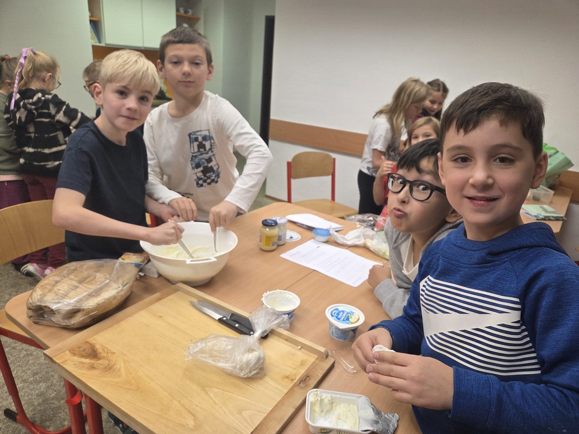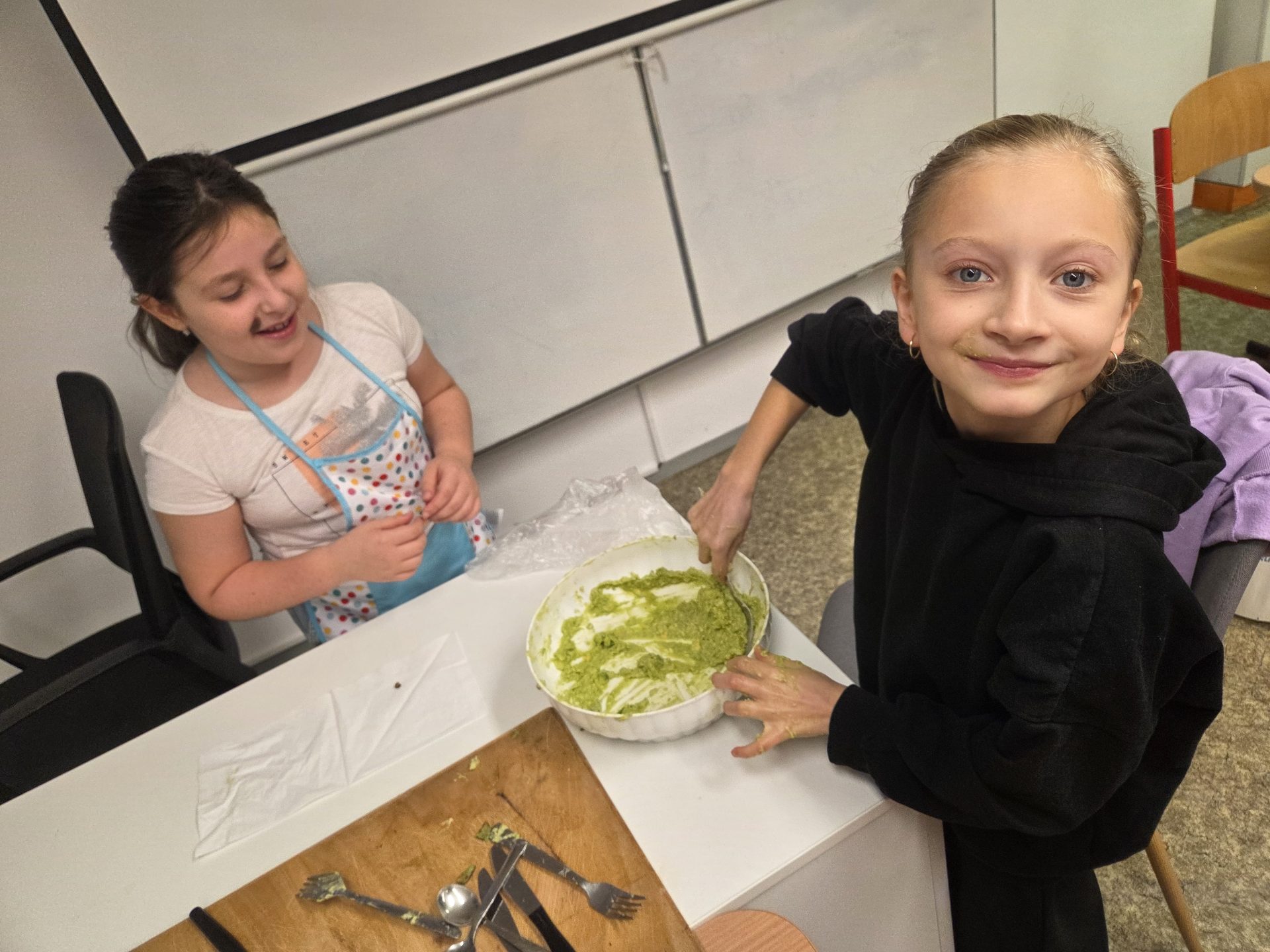 Kouzelné sluchátko vzalo děti ze 3. B do školní kuchyňky, kde díky vzájemné spolupráci vznikaly ty nejlepší „jednohubky“. Děti si organizovaly práci od nákupu surovin, přes postup, průběžný úklid pracoviště až po servírování úplně sami. Dokonce zvládli napsat i pracovní postup. Ochutnat jsme mohli celkem 5 pomazánek – vajíčkovou, avokádovou, sýrovou s česnekem, mrkvovou a tuňákovou.