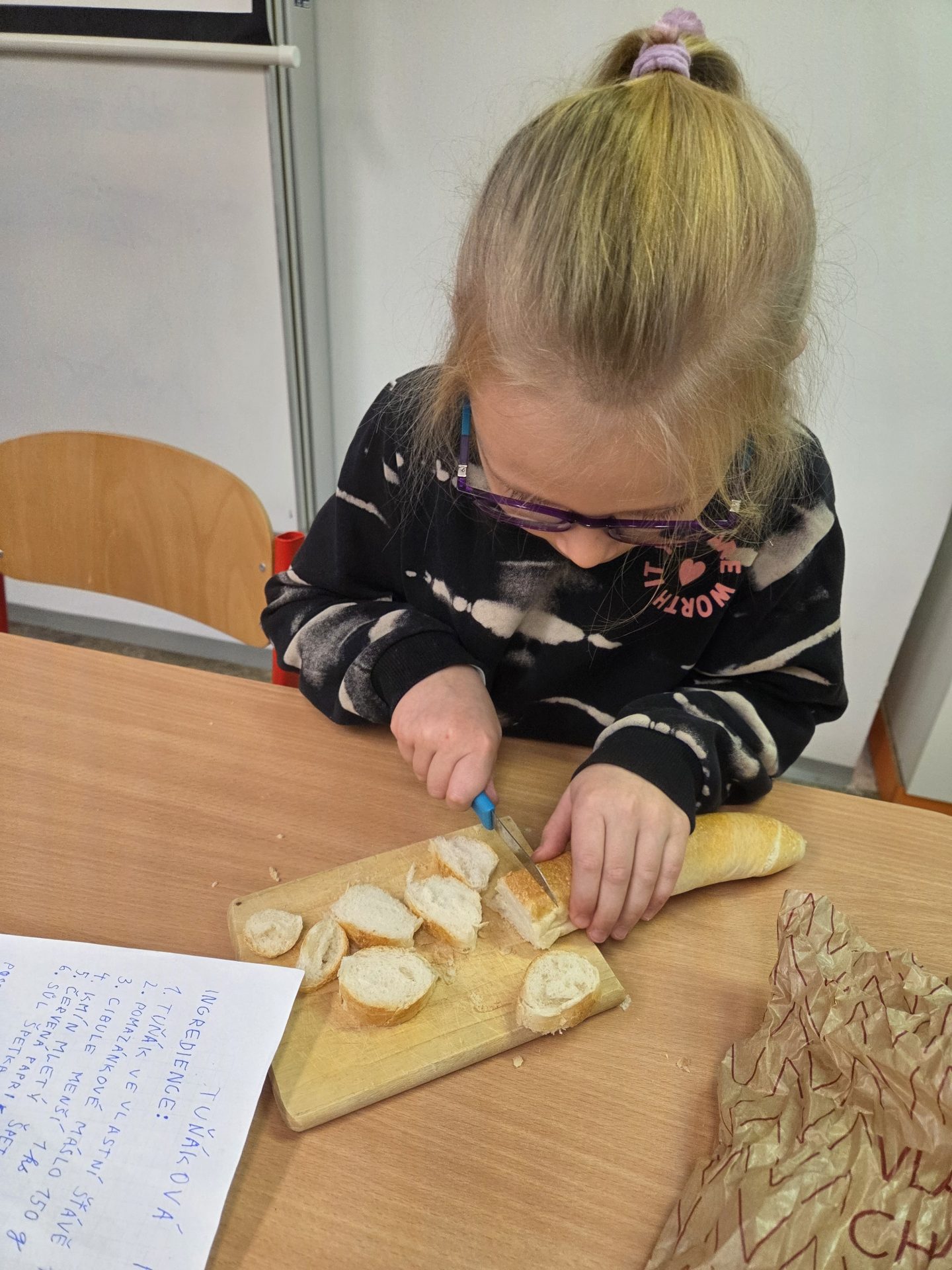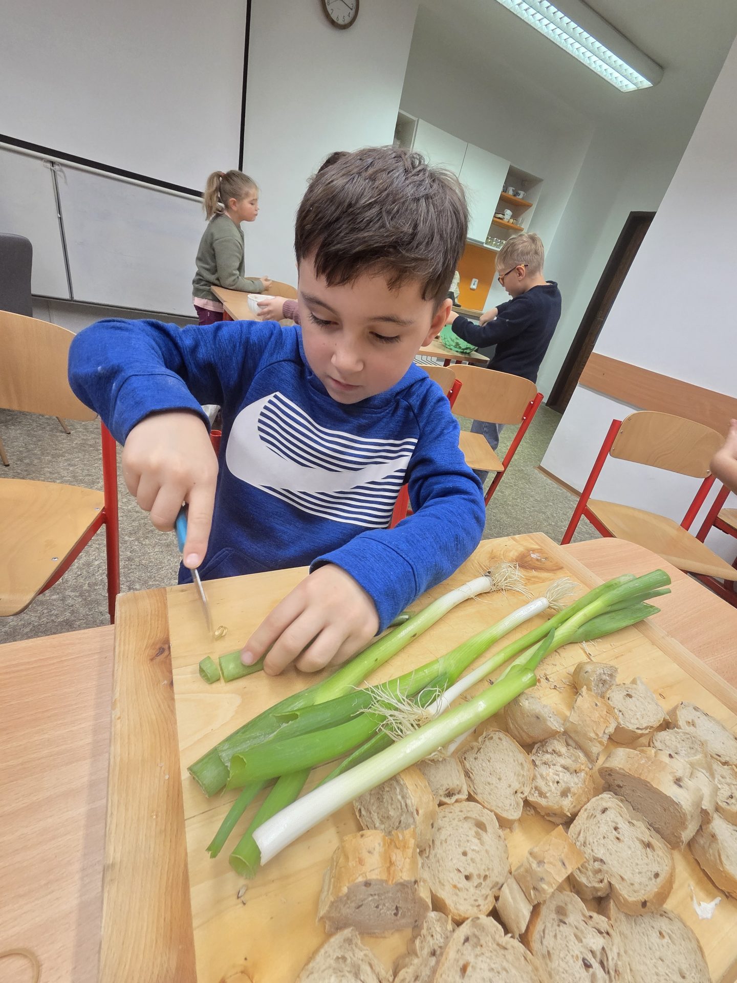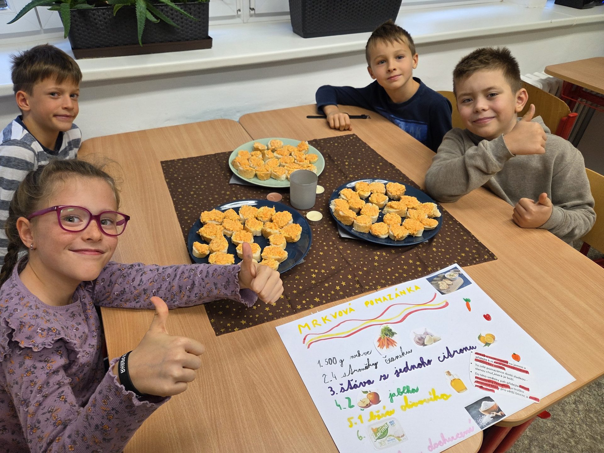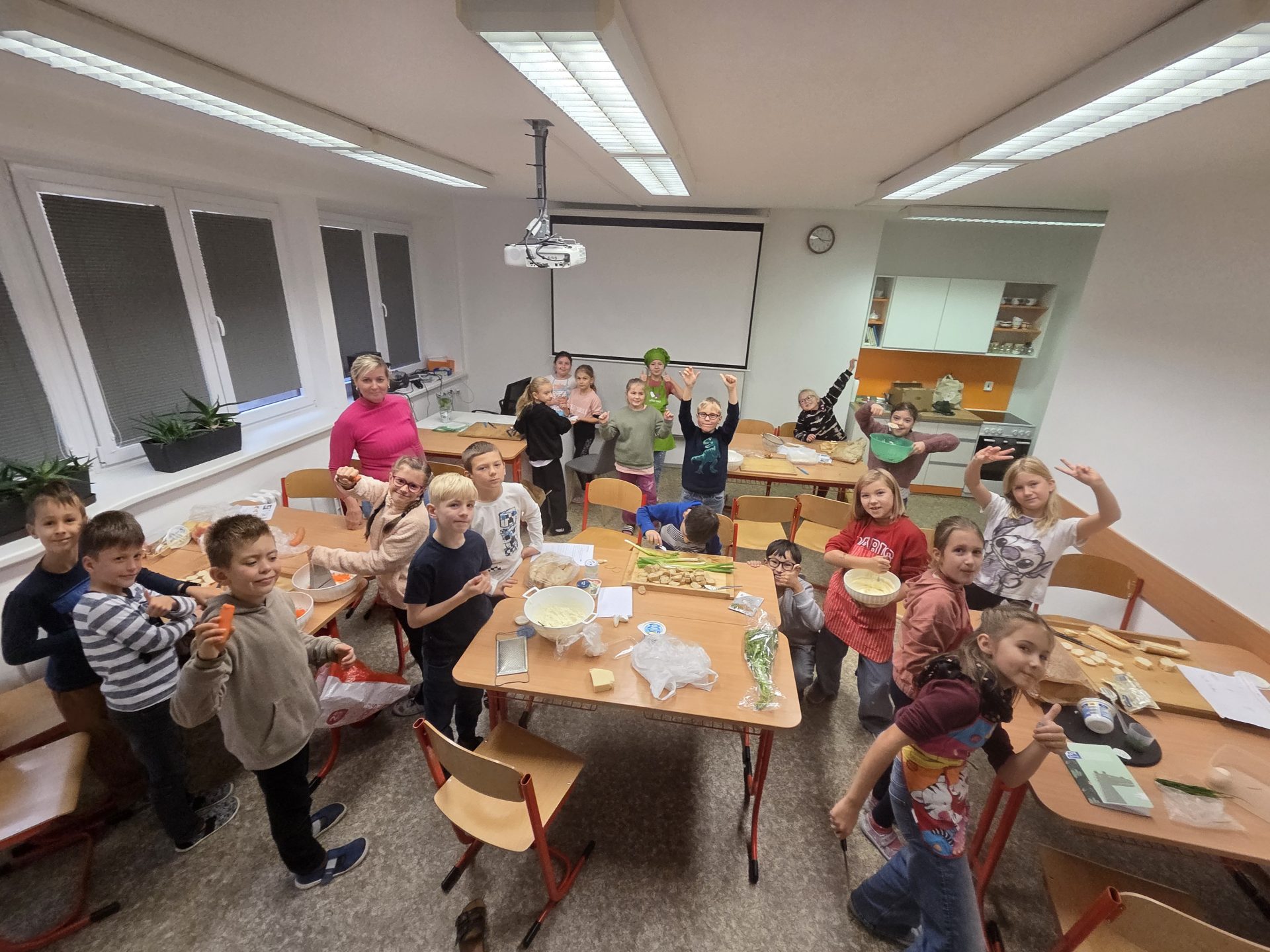 Kouzelné sluchátko vzalo děti ze 3. B do školní kuchyňky, kde díky vzájemné spolupráci vznikaly ty nejlepší „jednohubky“. Děti si organizovaly práci od nákupu surovin, přes postup, průběžný úklid pracoviště až po servírování úplně sami. Dokonce zvládli napsat i pracovní postup. Ochutnat jsme mohli celkem 5 pomazánek – vajíčkovou, avokádovou, sýrovou s česnekem, mrkvovou a tuňákovou.
