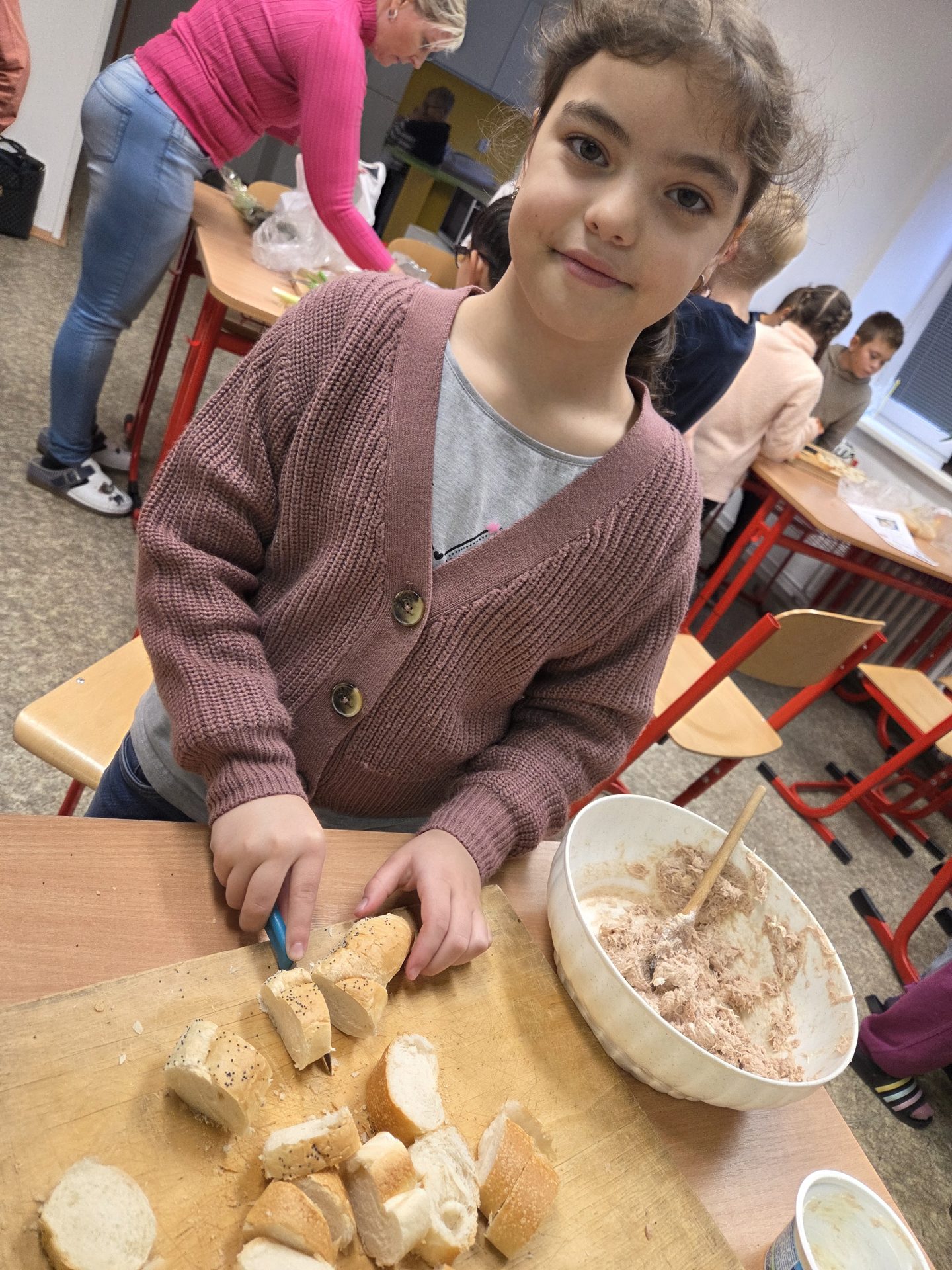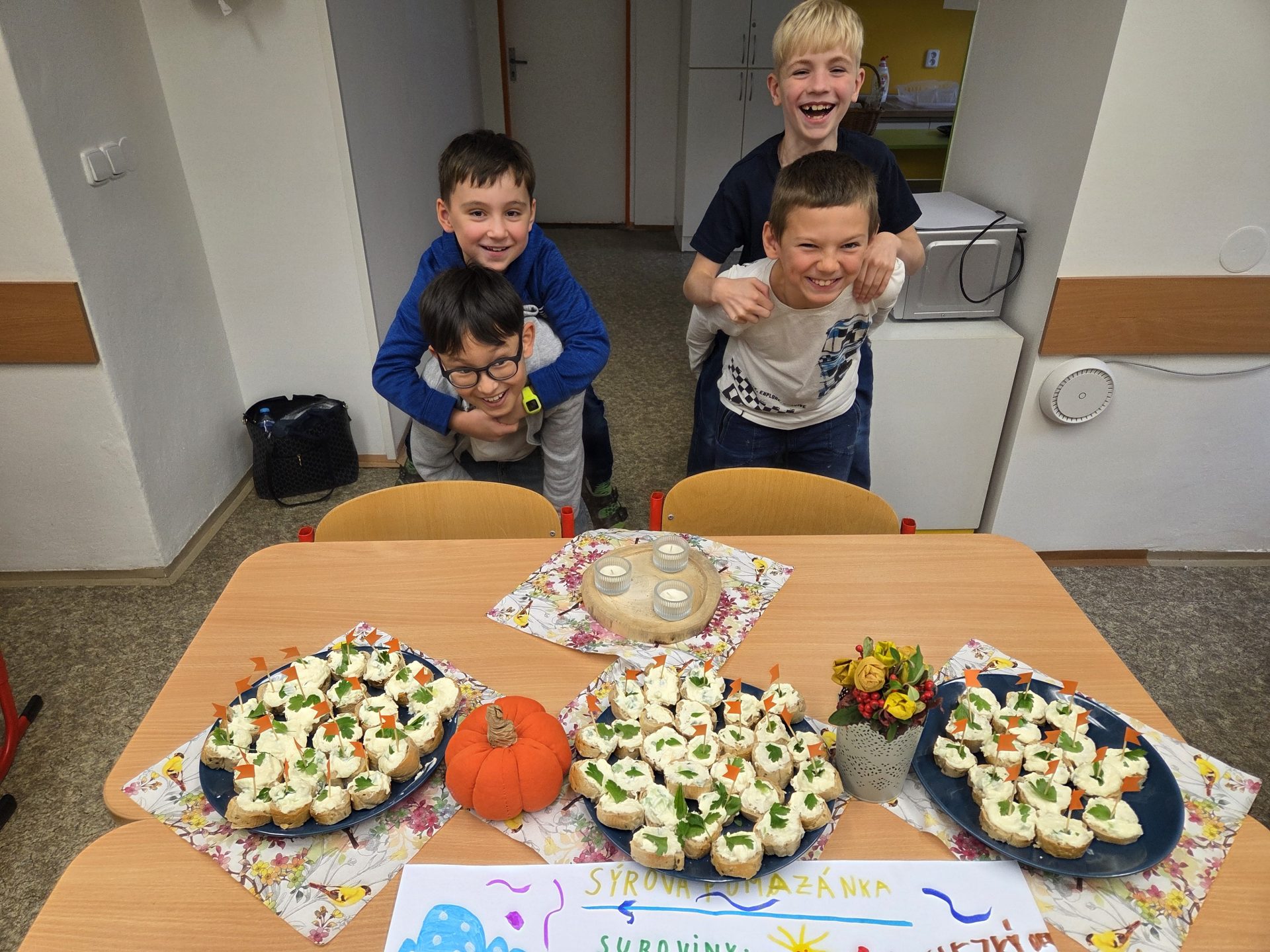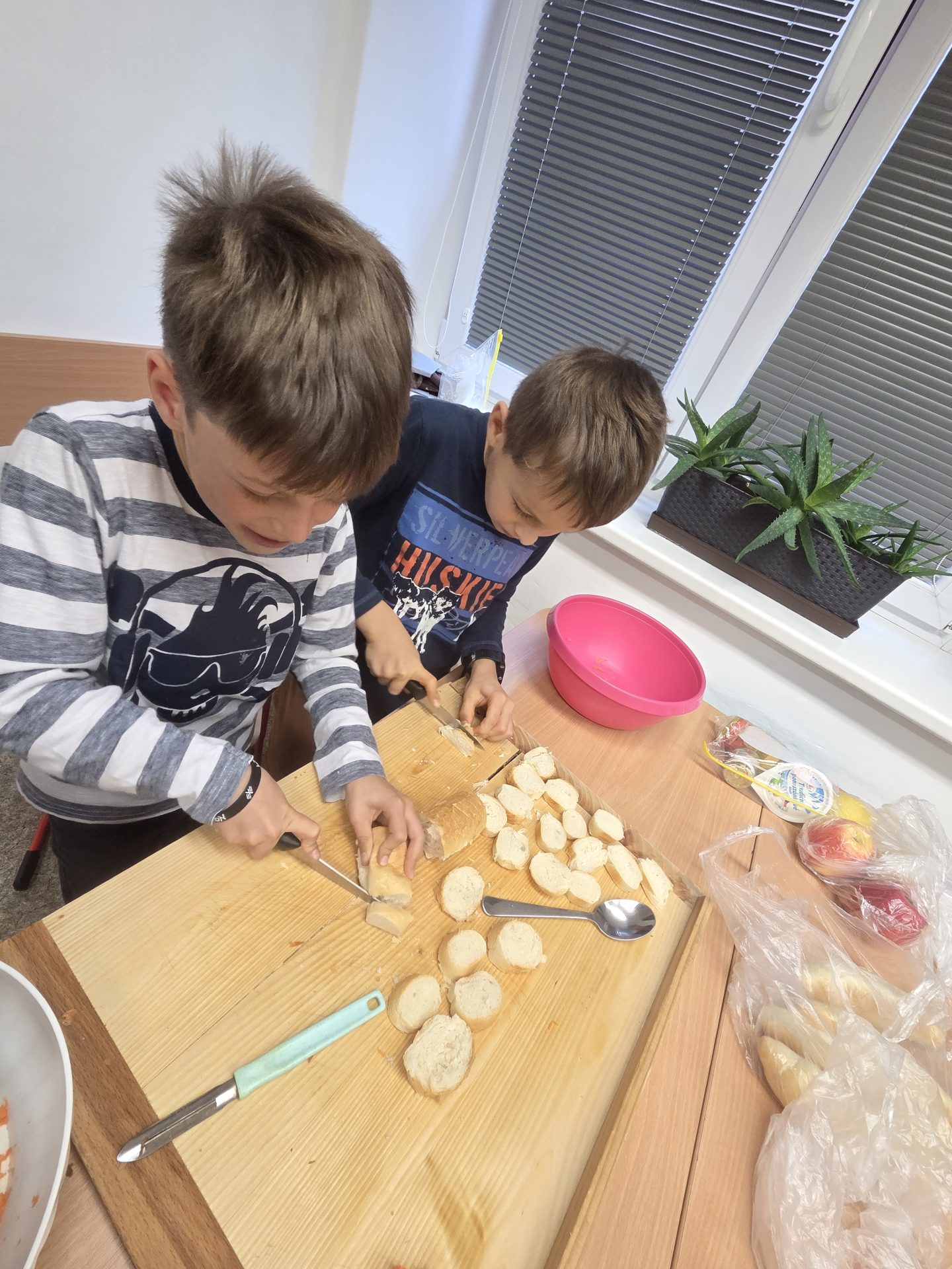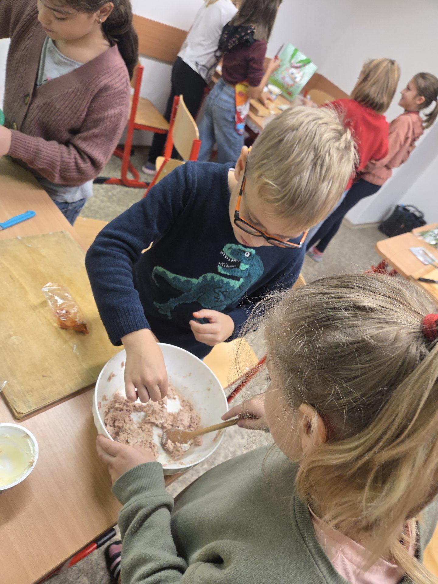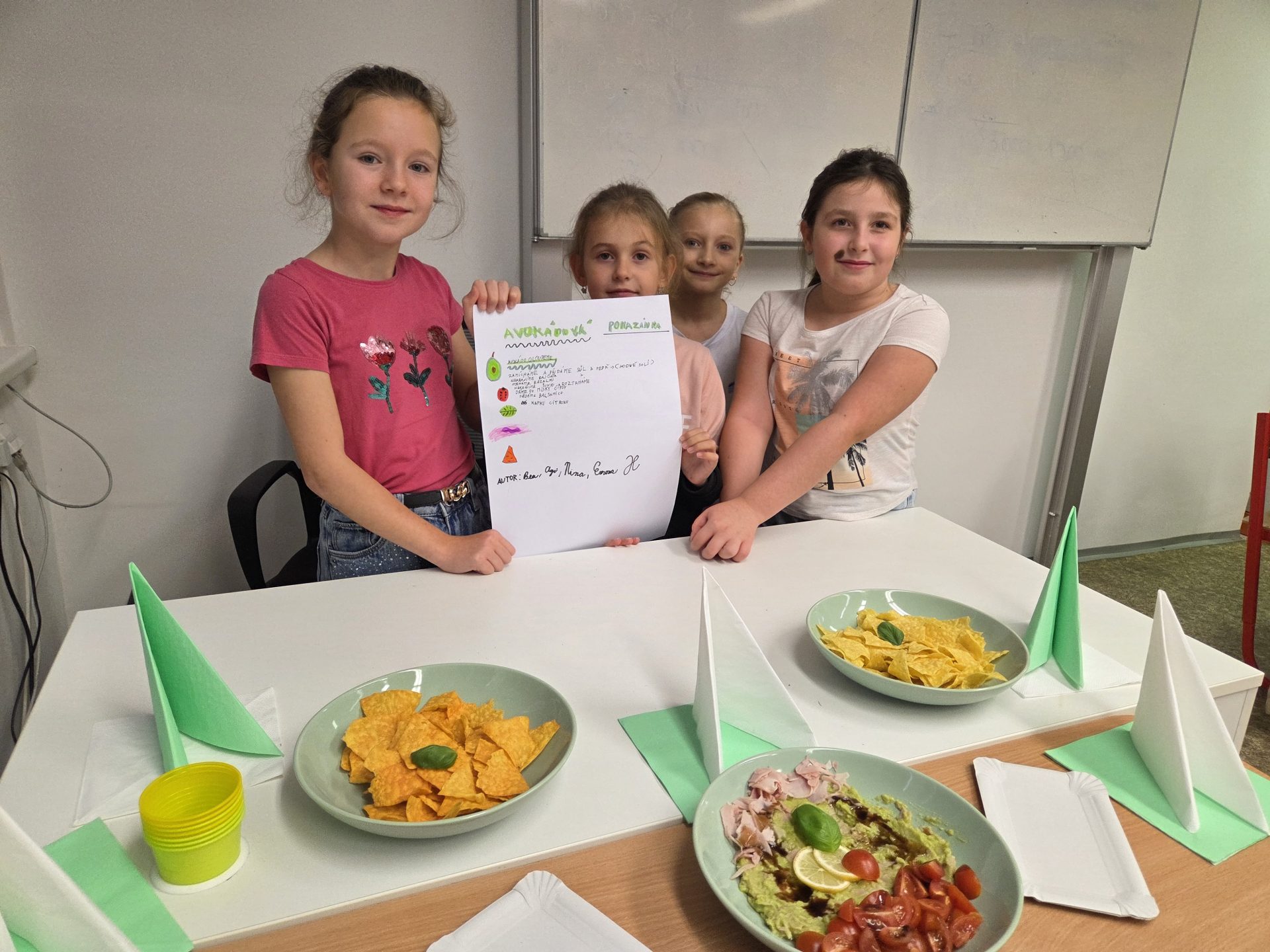 Kouzelné sluchátko vzalo děti ze 3. B do školní kuchyňky, kde díky vzájemné spolupráci vznikaly ty nejlepší „jednohubky“. Děti si organizovaly práci od nákupu surovin, přes postup, průběžný úklid pracoviště až po servírování úplně sami. Dokonce zvládli napsat i pracovní postup. Ochutnat jsme mohli celkem 5 pomazánek – vajíčkovou, avokádovou, sýrovou s česnekem, mrkvovou a tuňákovou.