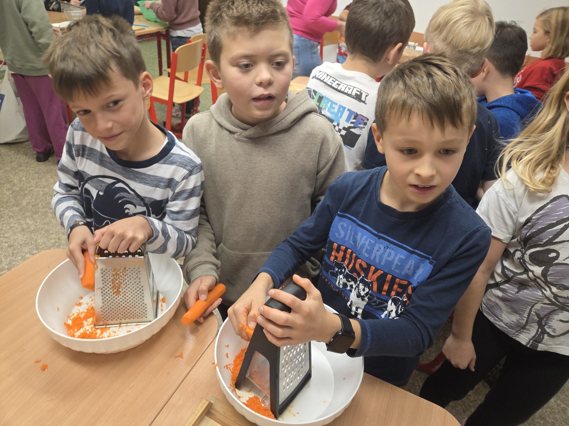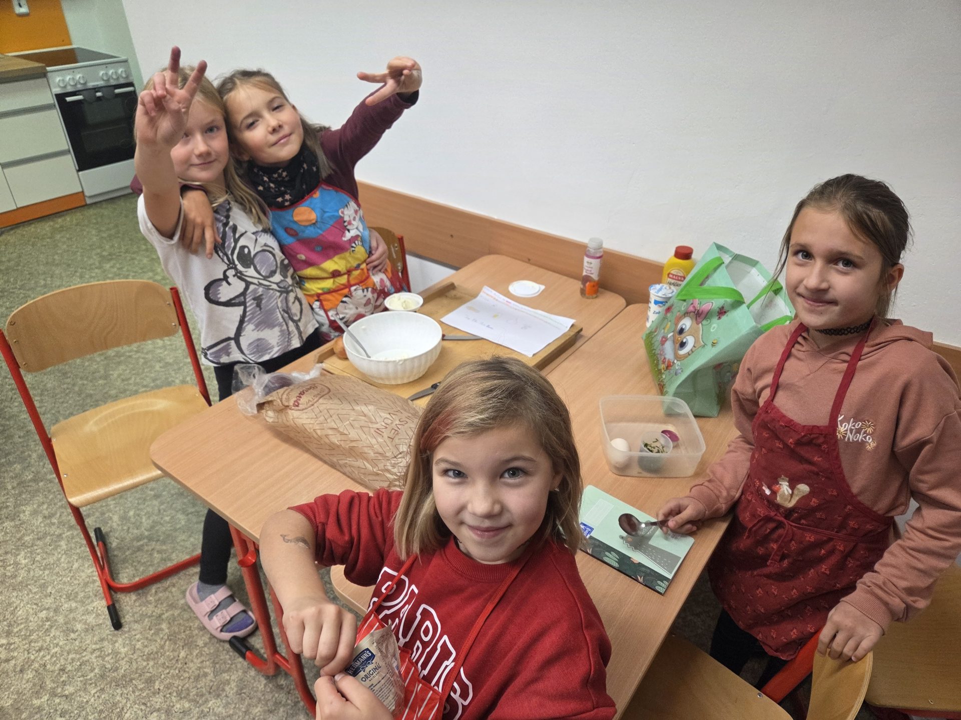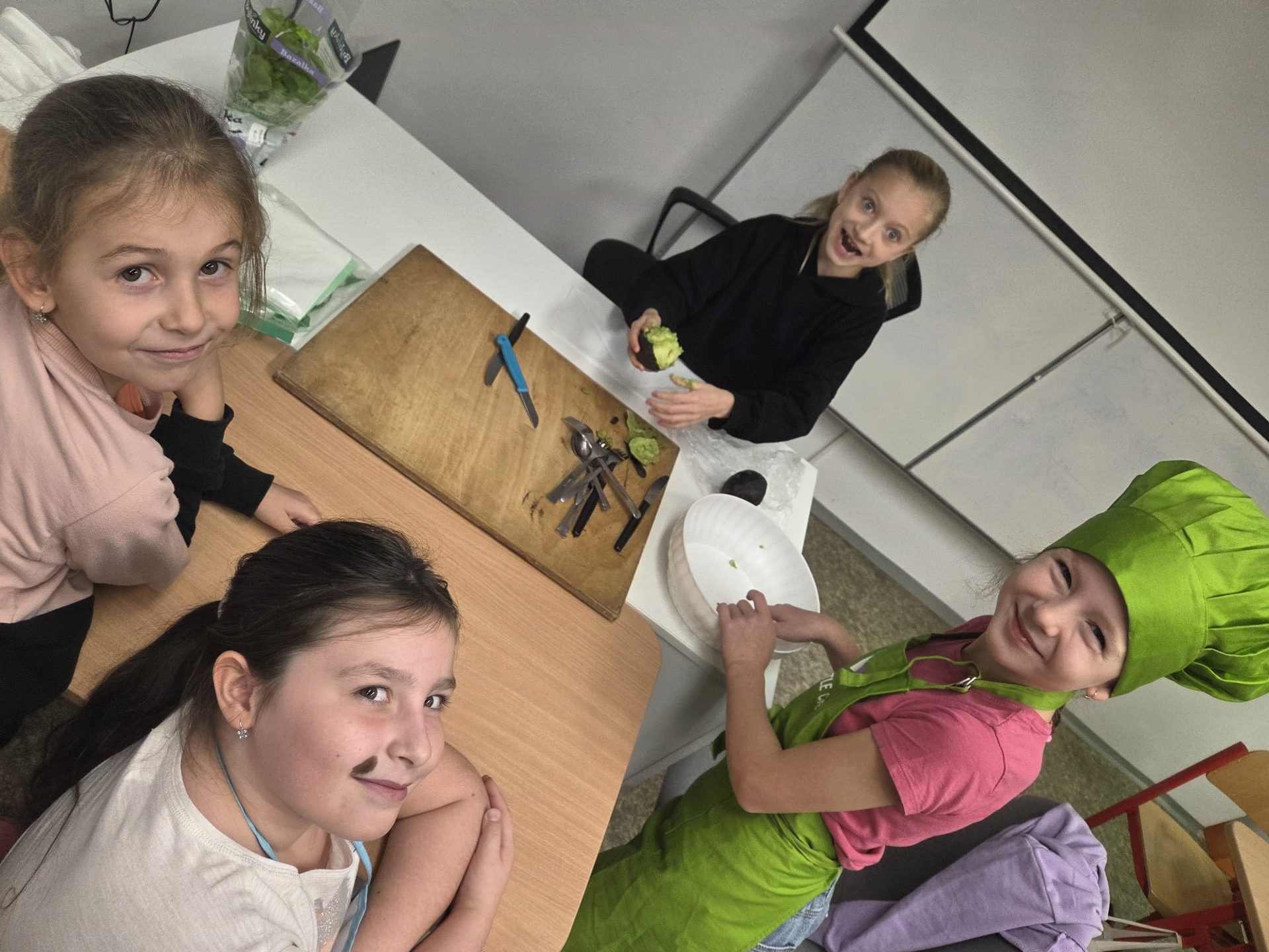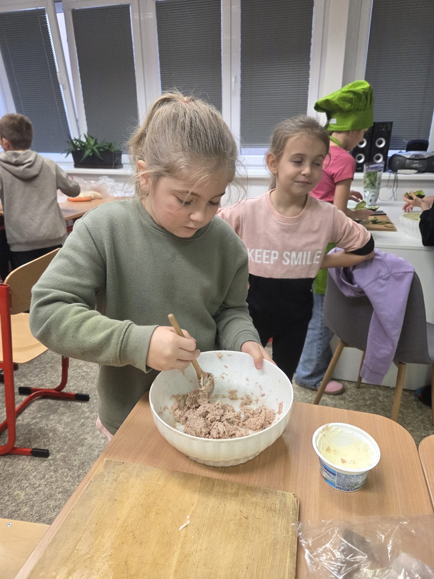 Kouzelné sluchátko vzalo děti ze 3. B do školní kuchyňky, kde díky vzájemné spolupráci vznikaly ty nejlepší „jednohubky“. Děti si organizovaly práci od nákupu surovin, přes postup, průběžný úklid pracoviště až po servírování úplně sami. Dokonce zvládli napsat i pracovní postup. Ochutnat jsme mohli celkem 5 pomazánek – vajíčkovou, avokádovou, sýrovou s česnekem, mrkvovou a tuňákovou.