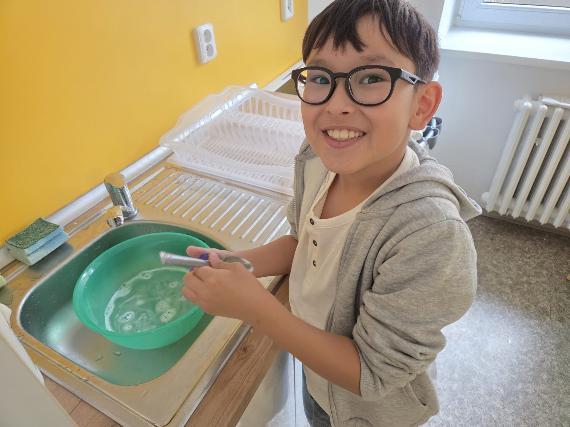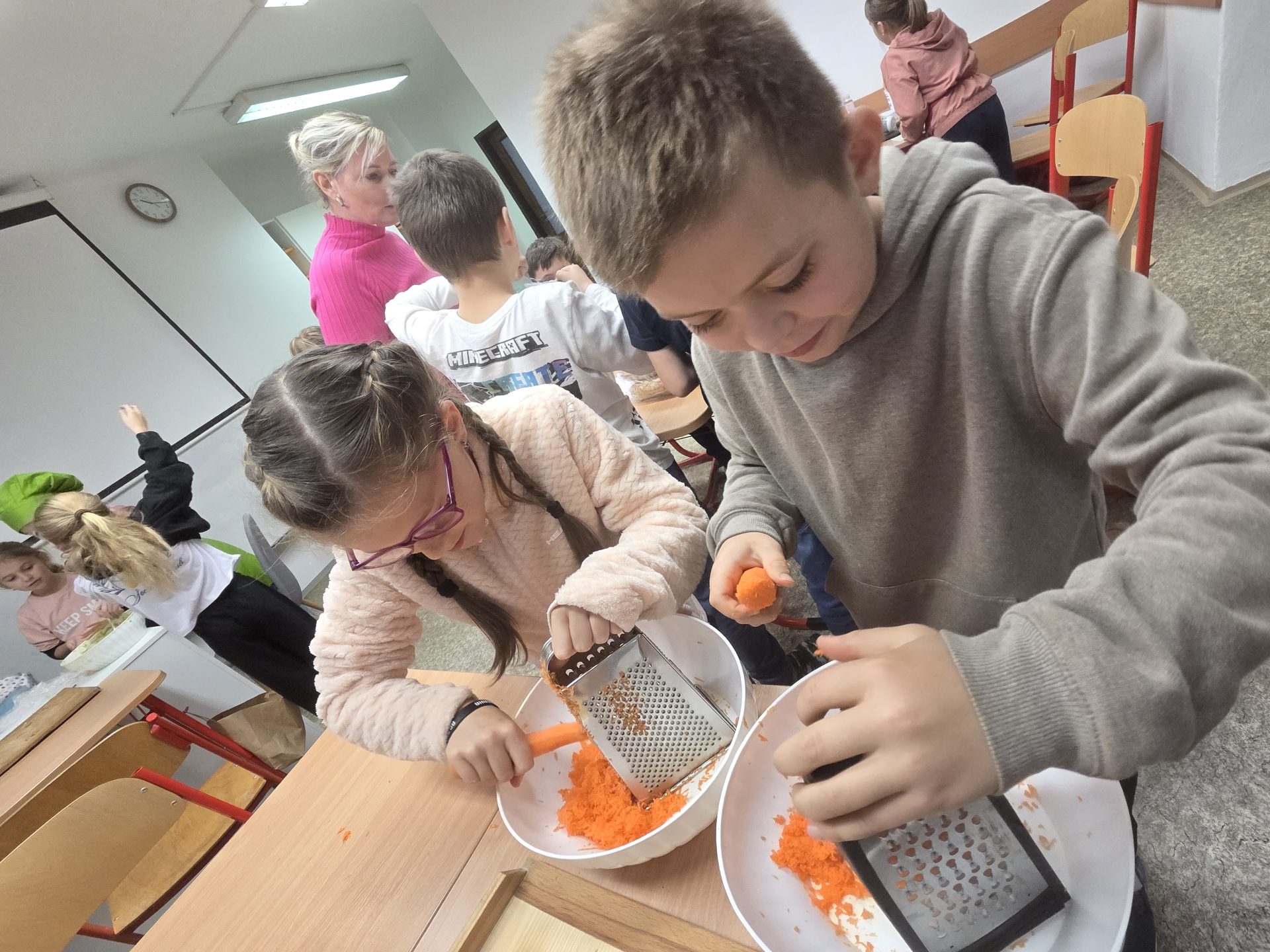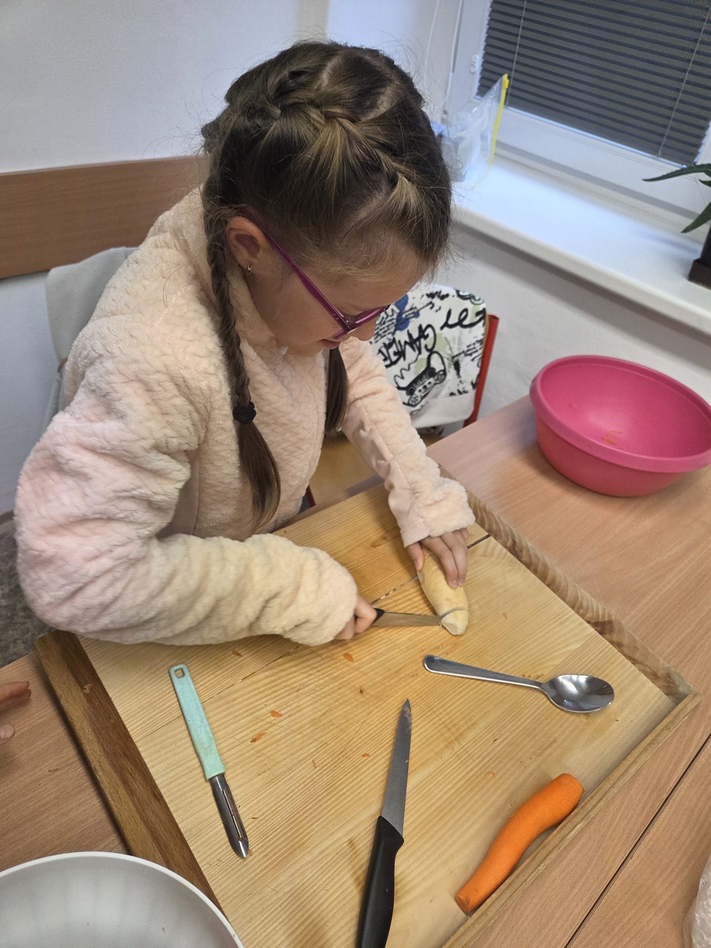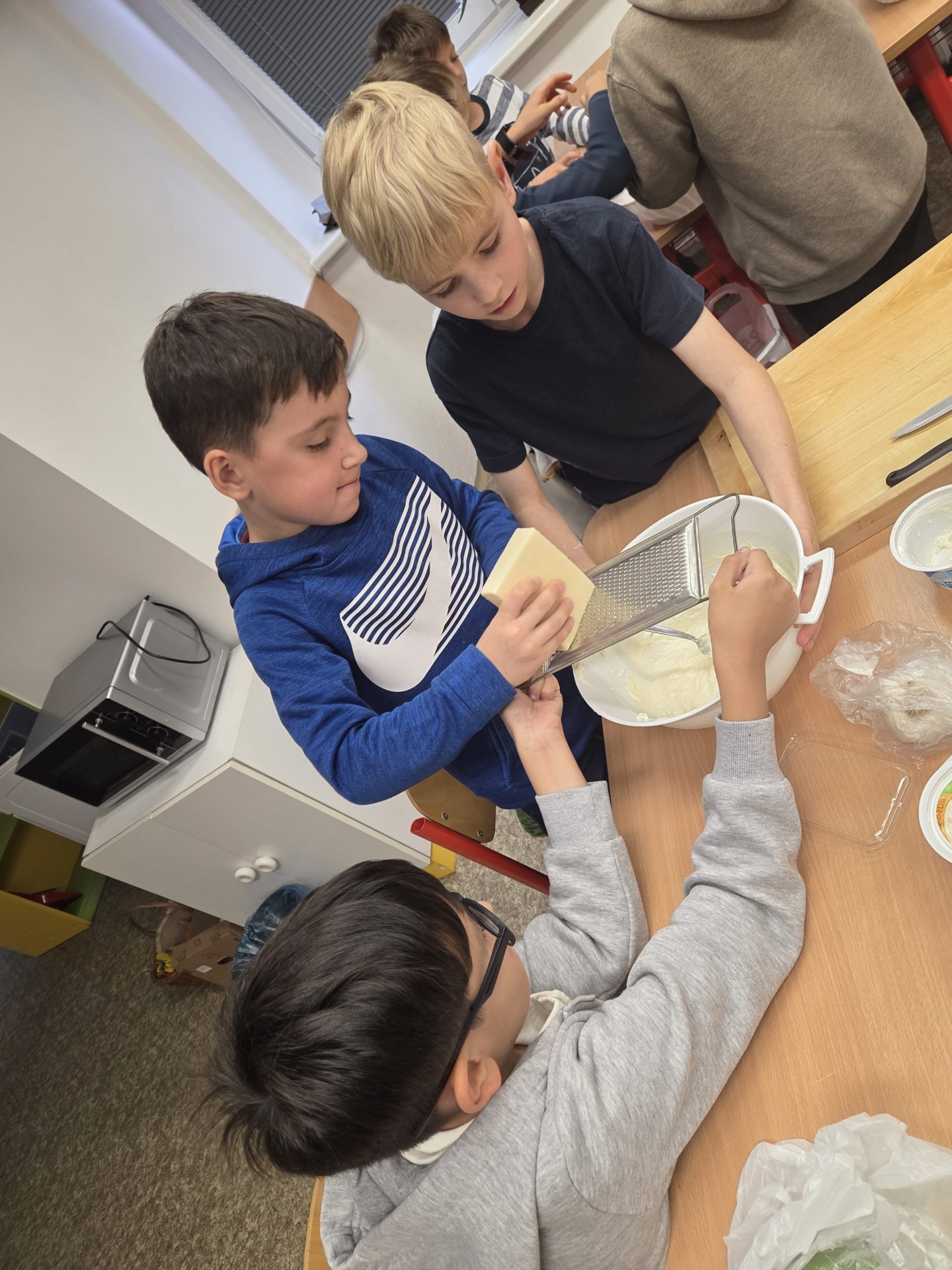 Kouzelné sluchátko vzalo děti ze 3. B do školní kuchyňky, kde díky vzájemné spolupráci vznikaly ty nejlepší „jednohubky“. Děti si organizovaly práci od nákupu surovin, přes postup, průběžný úklid pracoviště až po servírování úplně sami. Dokonce zvládli napsat i pracovní postup. Ochutnat jsme mohli celkem 5 pomazánek – vajíčkovou, avokádovou, sýrovou s česnekem, mrkvovou a tuňákovou.