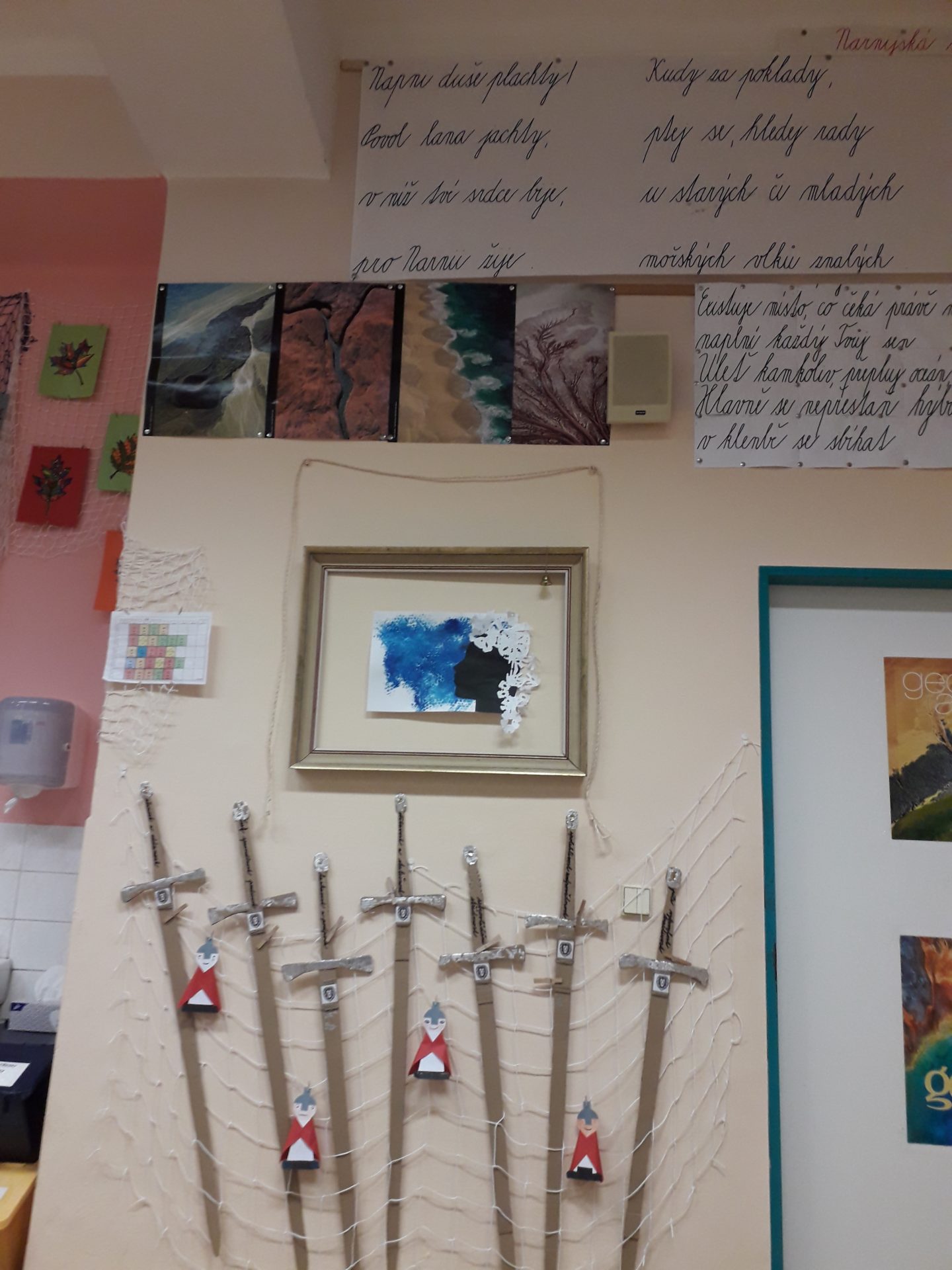 Na stěně třídy pod Narnijskou hymnou a obrazem, kterým jsme se i my podobně jako Edmund, Lucinka a Eustác ve třetím díle Letopisů Narnie dostali do fantastické Aslanovi říše, visí sedm mečů. Tyto meče mají podobně jako v Plavbě Jitřního poutníka pomoci k vítězství dobra. Známe to každý z nás, děti i dospělí – ten každodenní zápas v našich duších, zápas s leností, hněvem a netrpělivostí, pýchou, lhostejností nebo závistí … Každé překonání těchto neřestí některou z dobrých charakterových vlastností je takovým vítezstvím. Čtvrťáci prostřednictvím Narnie poznávají a rozvíjí dobrý charakter vlastním objevováním v knihách, které čtou, ale i mezi sebou v každodenních situacích ve třídě. Když si konkrétní dobré charakterové vlastnosti všimnou u postavy v knize nebo u některého svého spolužáka, vyloví si na konci týdne symbolickou perlu z Narnijského moře. Jméno žáka, který vlastnost projevil je pak zaznamenáno na čepel jednoho z „narnijských mečů“.