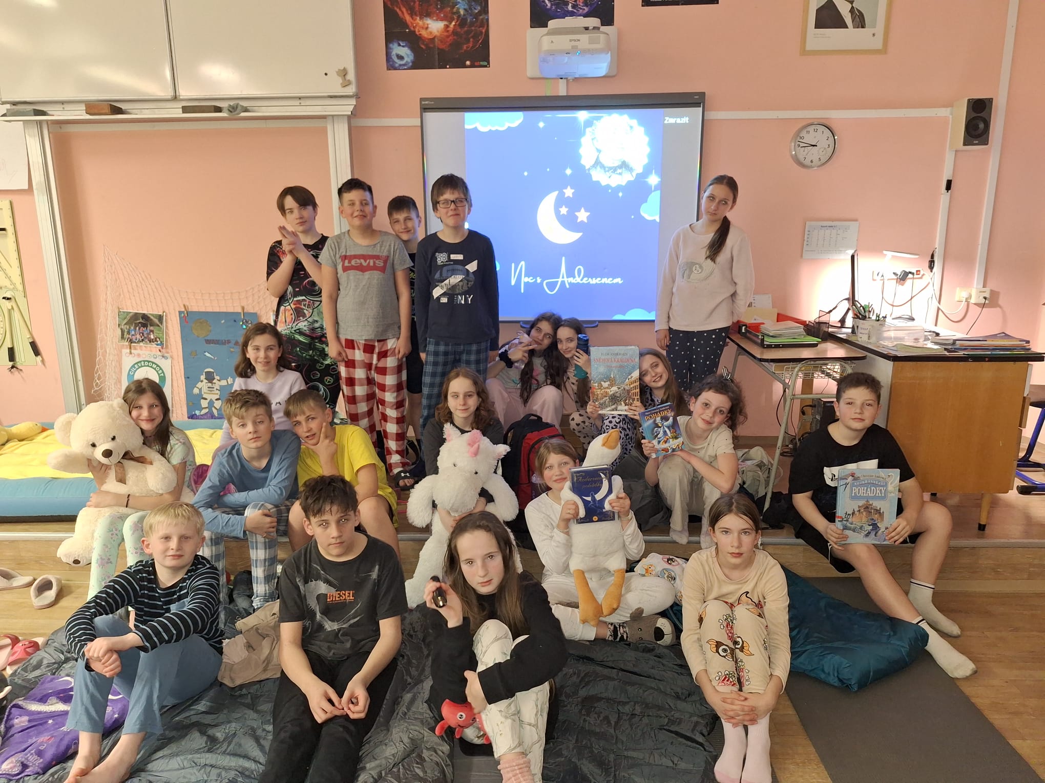 Poslední přespávání ve škole jsme věnovali světoznámému dánskému spisovateli a autoru pohádek, jehož jméno se stalo synonymem mezinárodní akce, do které se v letošním roce v ČR zapojilo více než 2000 institucí. Za naší školu tedy naše třída 5.C. Výstupem akce byly nejen zážitky s Andresenovými pohádkami, ale i pohlednicové pozdravy, které chceme adresovat babičkám a dědečkům z domova pro seniory.