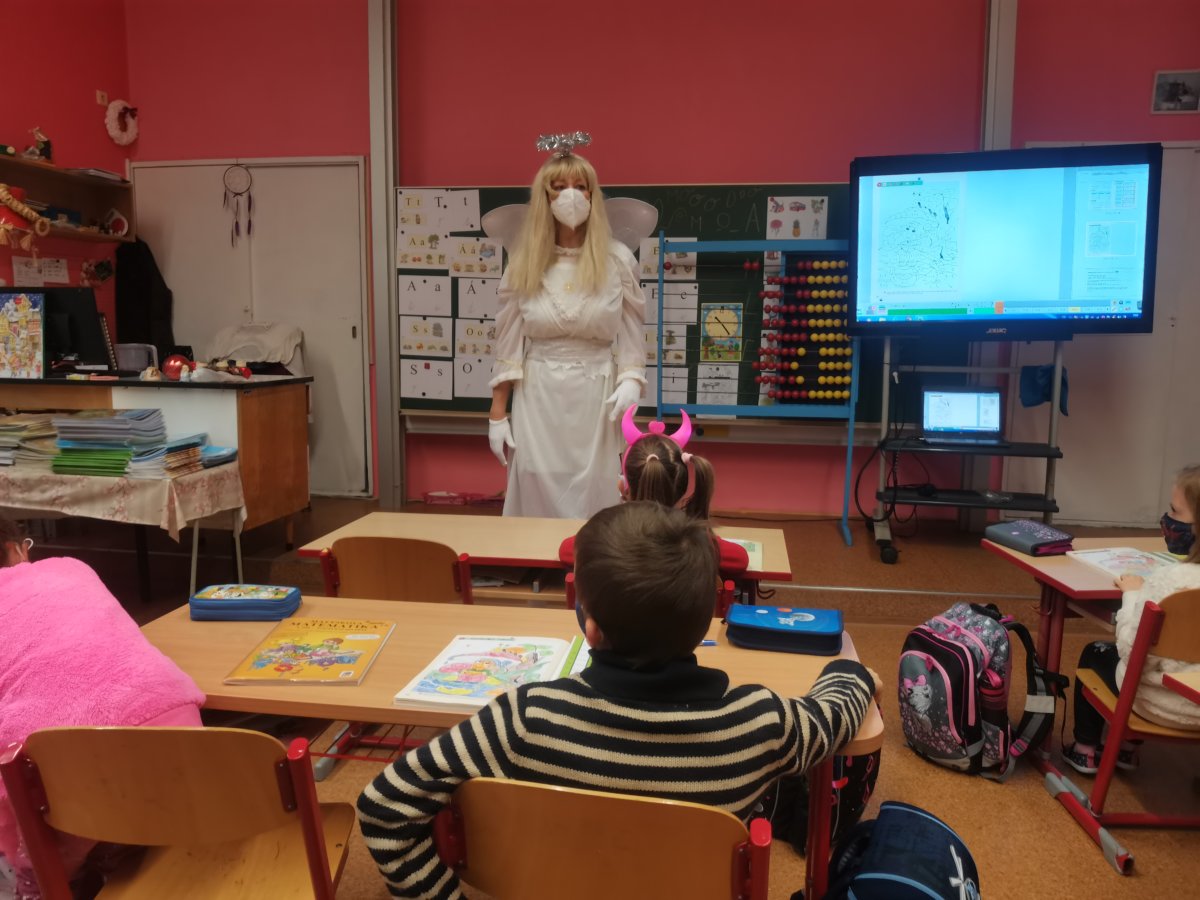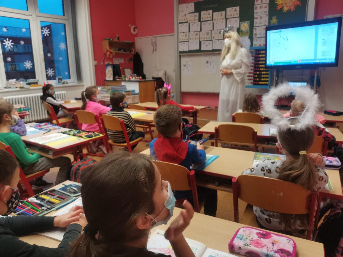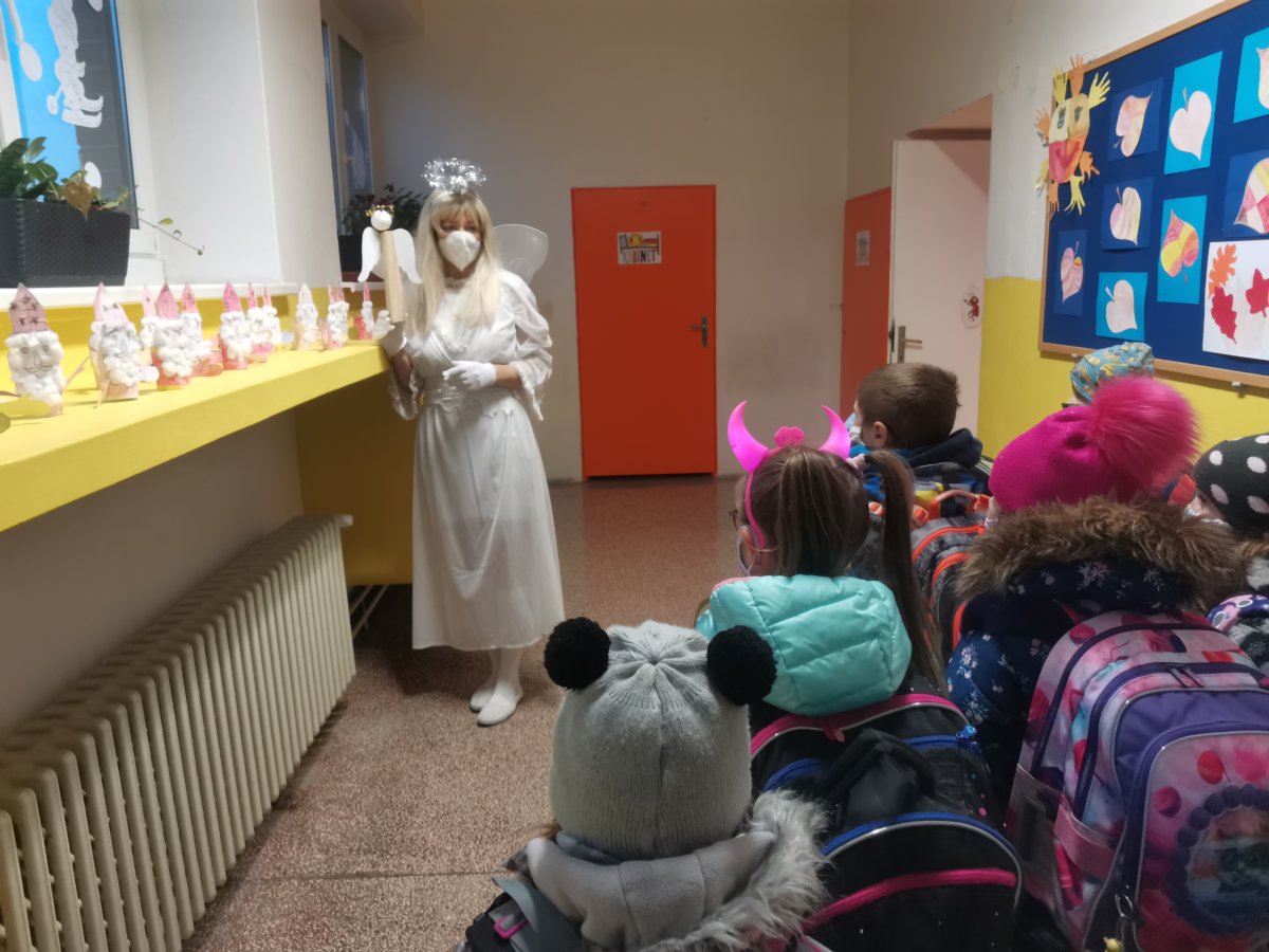 V pátek 4.12. měla naše třída neobvyklé vyučování s paní Andělkou. Četli jsme velmi pěkně,také trochu psali. Nejlepší bylo nakupování ovoce v Matematice. Poslední dvě hodiny jsme tvořili zimní čepice, ale jen z papíru. Jako návrháři jsme navrhli vzory, namalovali a také čepici vystřihli se sněhovými vločkami. Nejdůležitější však byla návštěva tradiční trojice Mikuláš, Anděl a čert. My jsme se na návštěvu den předem připravili a vyrobili jsme jim na uvítanou malé Mikulášky z papíru. Přednesli jsme mu všichni naše známé básničky.