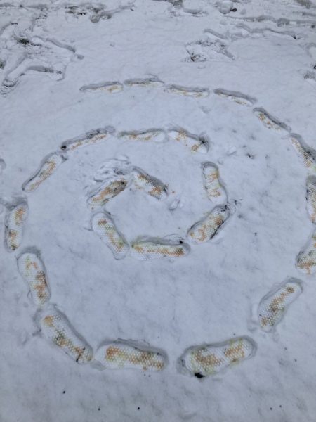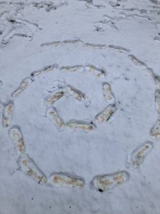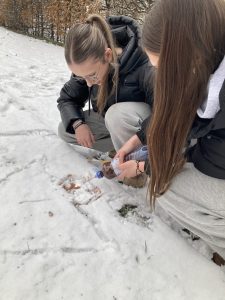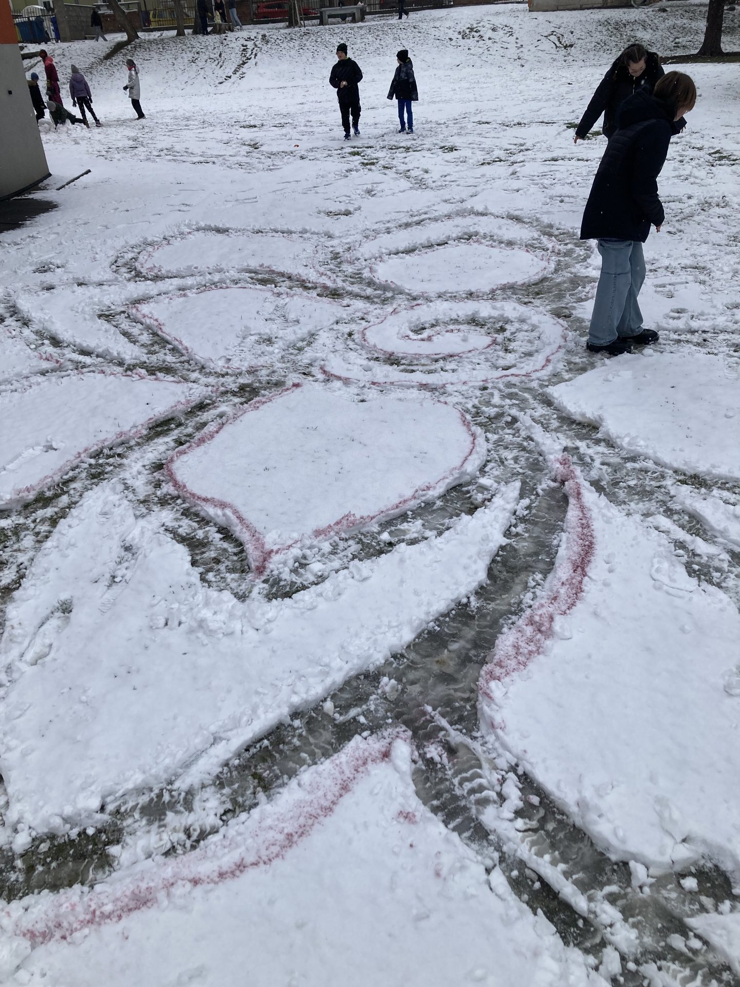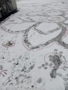 V rámci výtvarné výchovy jsme využili čerstvou sněhovou nadílku a vyrazili tvořit ven. Deváťáci si vyzkoušeli práci s netradičním materiálem — sněhem — a vytvořili dočasná umělecká díla, která existují jen po dobu, než je příroda sama smaže.