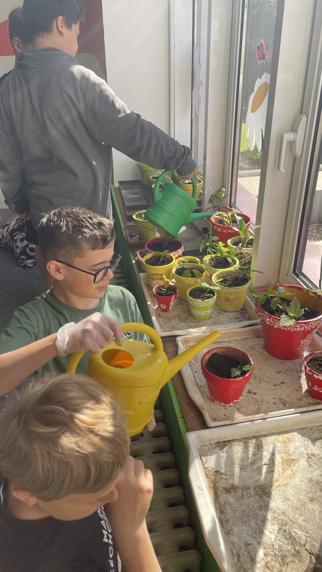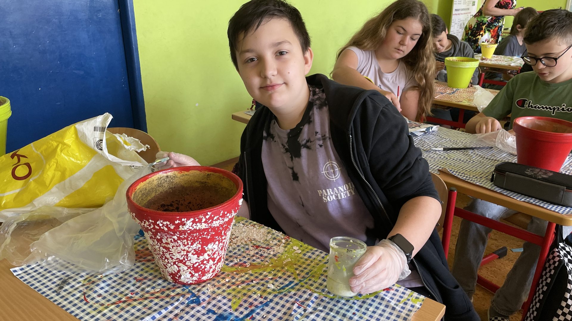 „Každá třída měla vyrobit výrobek do prodejních stánků. Paní asistentka si vzpomněla na staré květináče ve sklepě školy a tak jsme se rozhodli, je podle vzoru, který jsme viděli v knihovně, ozdobit. Nejdříve jsme květináče očistili, natřeli barvou a ozdobili do skořápek od vajíček. Pak jsme do nich zasadili květiny ze školy a malé javory, které nasbírala Lucka s Viktorkou. A tak vznikl náš výrobek.